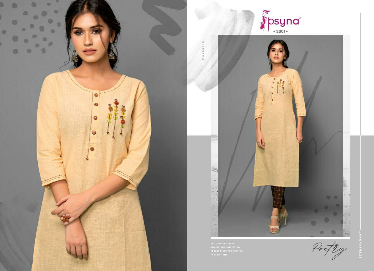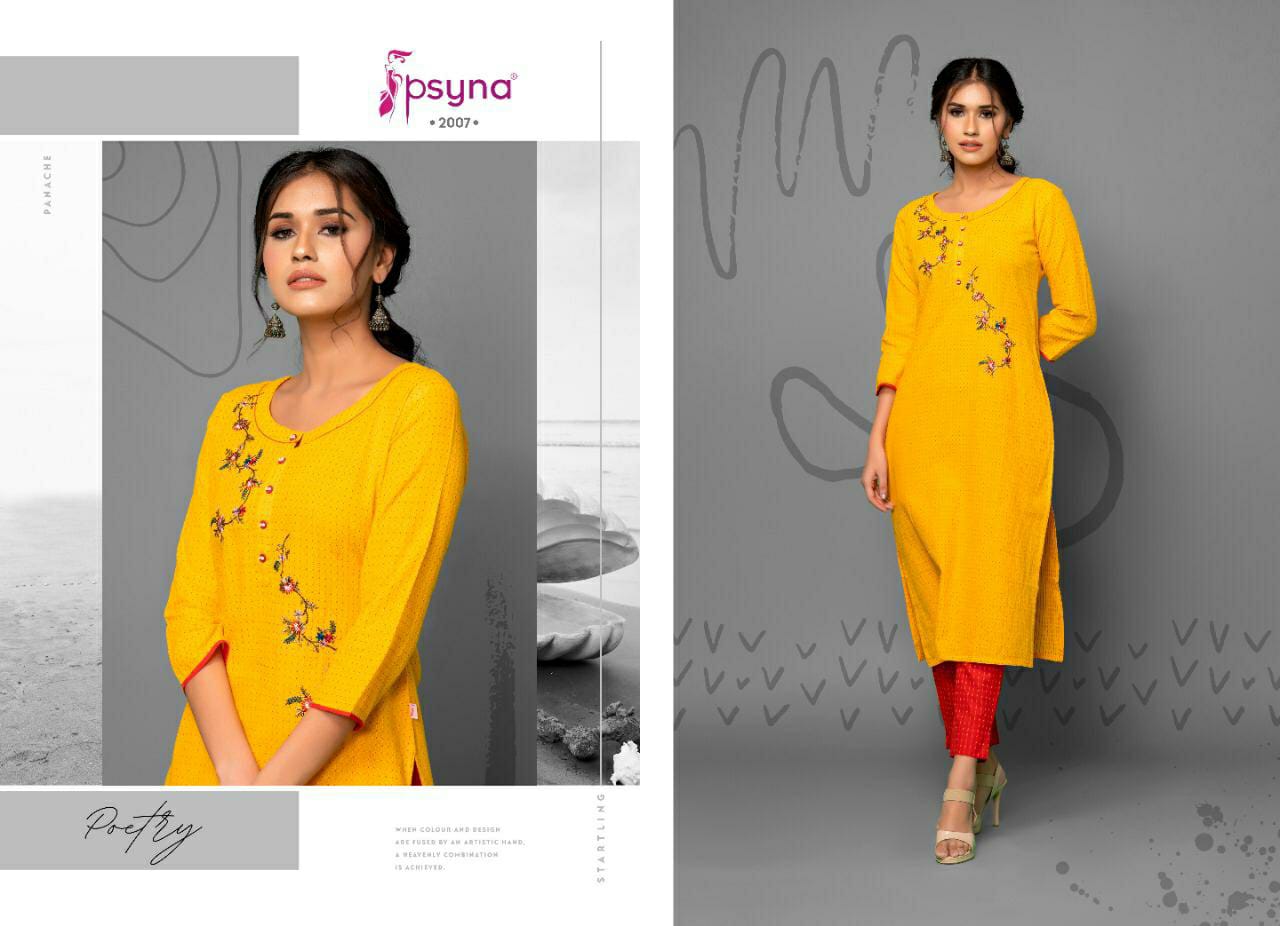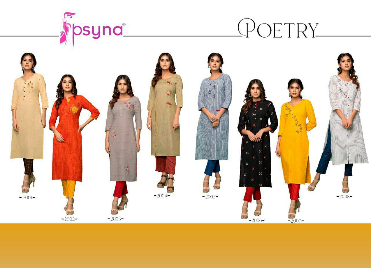 *Brand :* PSYNA *Catalog Name :* Poetry Vol 2 *Price :* ?750 *Piece :* 8 *Total Price :* 6000 ( GST Extra ) *Size :* M,L,XL,XXL,XXXL *Fabric :* cotton *Availibility :* On Booking |