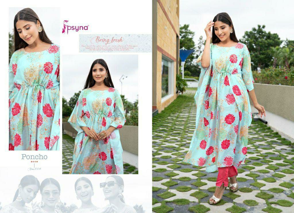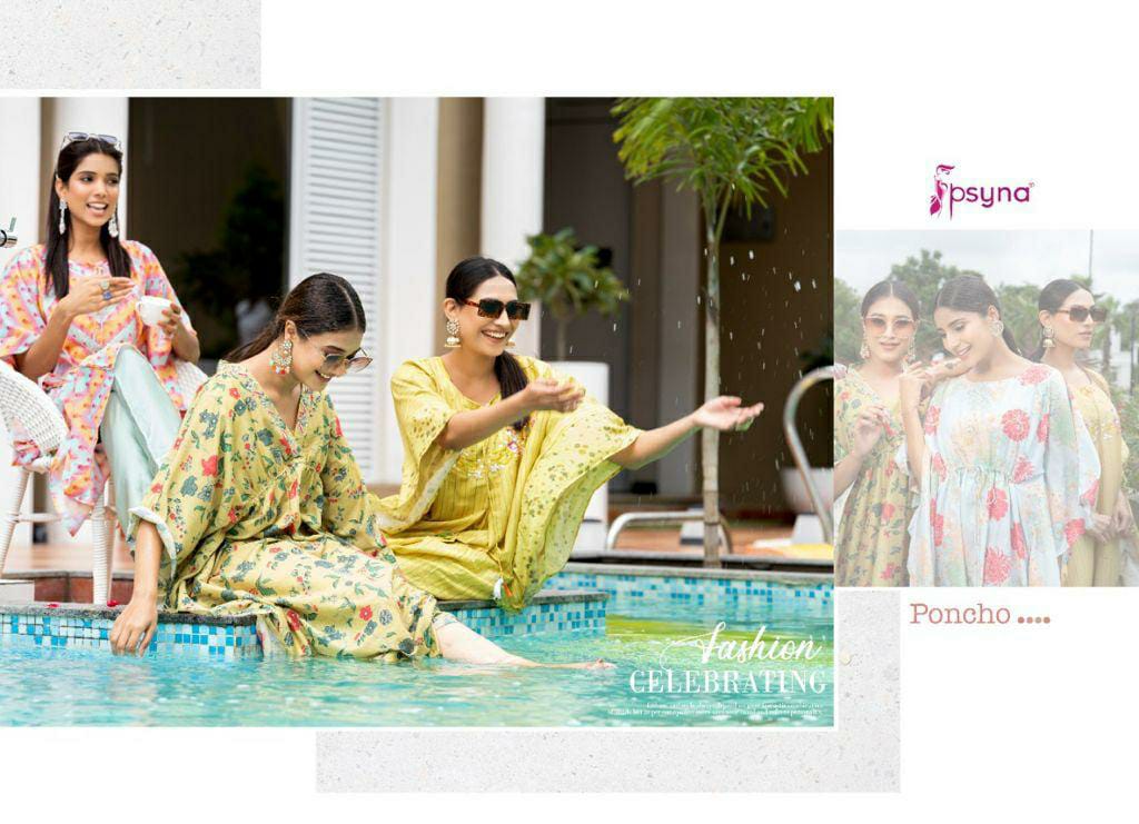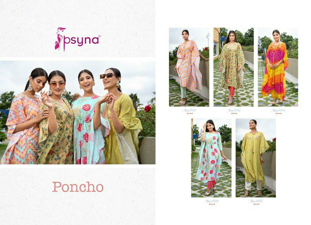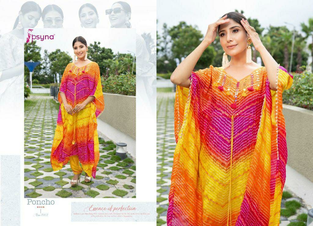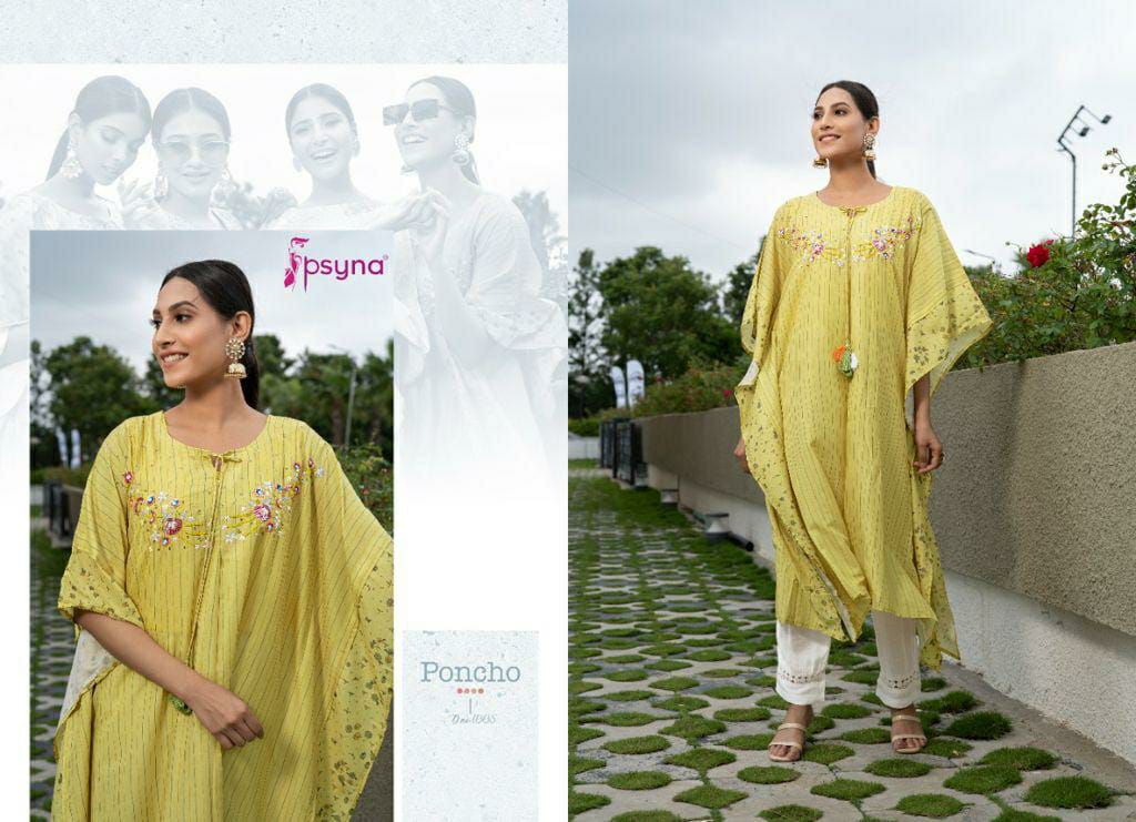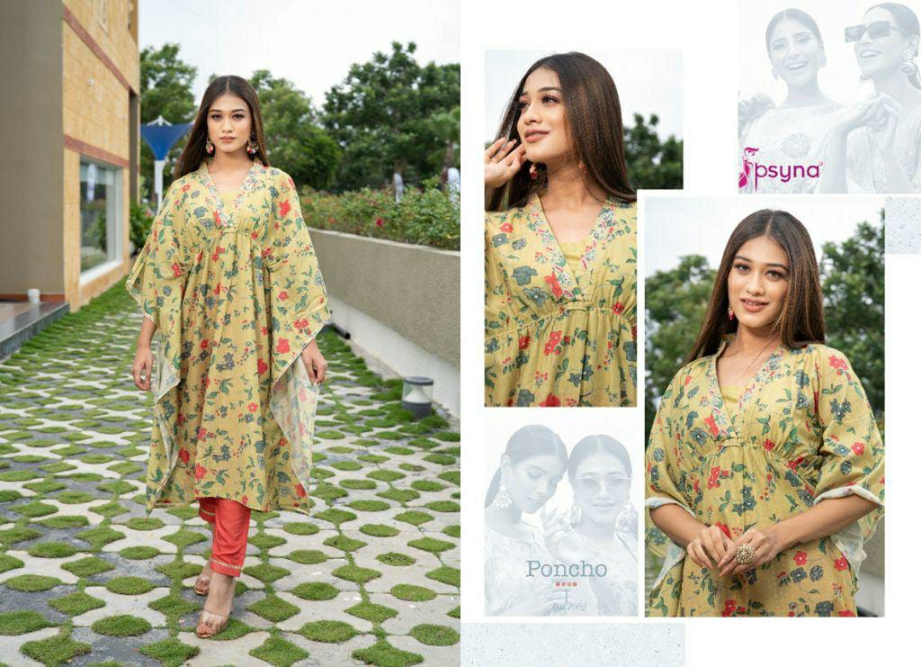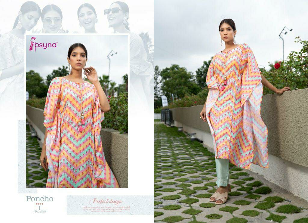 Buy Online Poncho Kaftan Kurti With Pant By Psyna Dealer And Exporter Surat Gujarat 5 Pcs of Full Catalogue at Wholesale Price. Looking for Poncho Kaftan Kurti With Pant By Psyna Dealer And Exporter Surat Gujarat Full Catalouge at Best Price? Buy Now Poncho Kaftan Kurti With Pant By Psyna Dealer And Exporter Surat Gujarat at Wholesale Rate of Rs 4995 with Total 5 Pcs from authroized dealer and supplier of PSYNA Brand. Cost of Each piece is just only Rs 999 which is very low and affordable price to resale the product in your retail store ,This is Surat based Wholesale Supplier & Dealer of PSYNA Brand. Click on Brand name to Know more about PSYNA Brand's products.Call or Whatsapp on 9898838984 for booking or enquiry