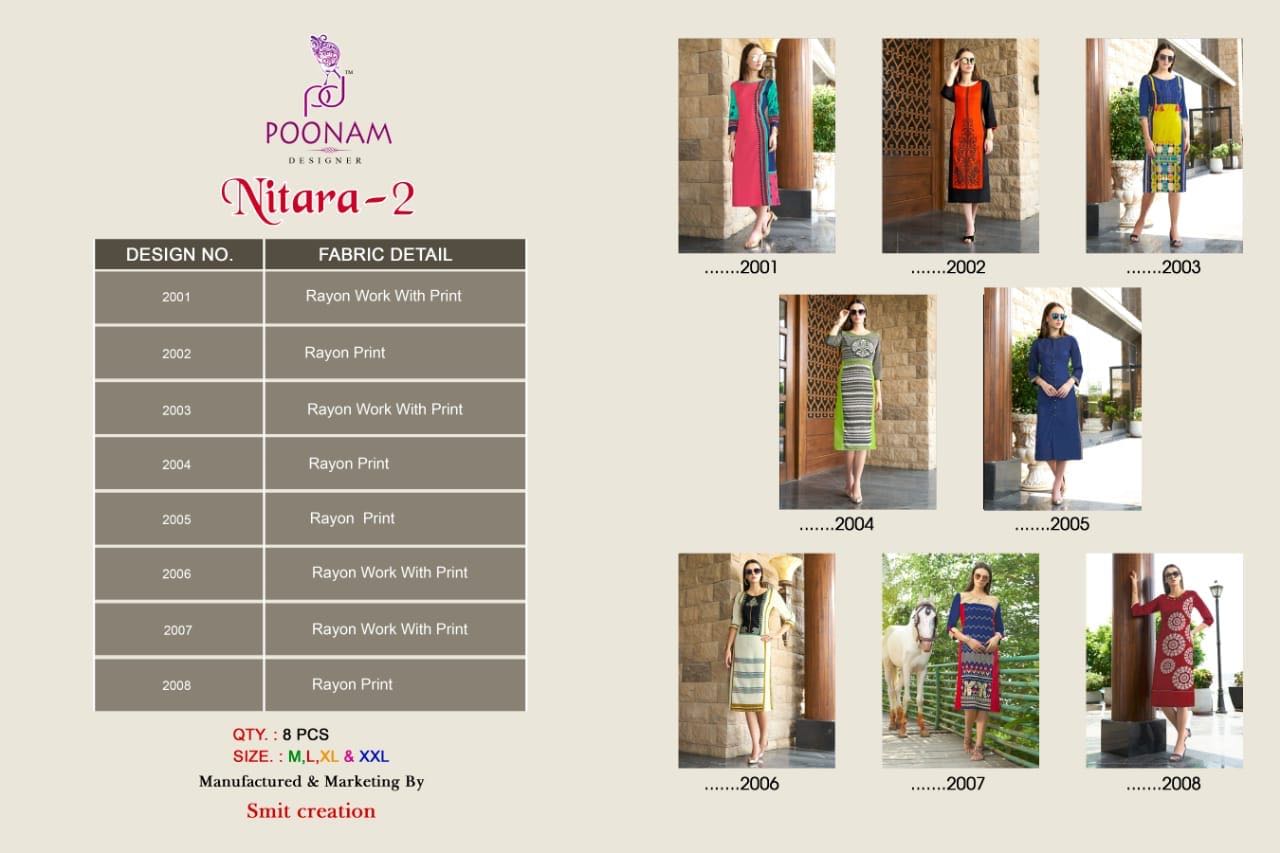 Buy Online Poonam Nitara Vol 2 2001 Series Reyon Printed Kurti Catlog Wholesaler And Supplier Surat 8 Pcs of Full Catalogue at Wholesale Price. Looking for Poonam Nitara Vol 2 2001 Series Reyon Printed Kurti Catlog Wholesaler And Supplier Surat Full Catalouge at Best Price? Buy Now Poonam Nitara Vol 2 2001 Series Reyon Printed Kurti Catlog Wholesaler And Supplier Surat at Wholesale Rate of Rs 3048 with Total 8 Pcs from authroized dealer and supplier of Poonam designer Brand. Cost of Each piece is just only Rs 381 which is very low and affordable price to resale the product in your retail store ,This is Surat based Wholesale Supplier & Dealer of Poonam designer Brand. Click on Brand name to Know more about Poonam designer Brand's products.Call or Whatsapp on 9898838984 for booking or enquiry