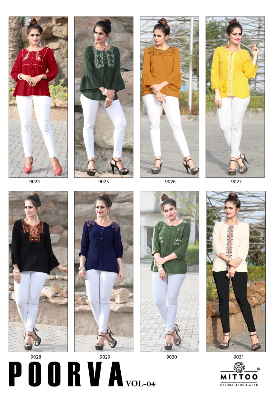 Buy Online Poorva Vol 4 By Mittoo Reyon Crape Western Top Supplier And Wholesale Dealer Surat 8 Pcs of Full Catalogue at Wholesale Price. Looking for Poorva Vol 4 By Mittoo Reyon Crape Western Top Supplier And Wholesale Dealer Surat Full Catalouge at Best Price? Buy Now Poorva Vol 4 By Mittoo Reyon Crape Western Top Supplier And Wholesale Dealer Surat at Wholesale Rate of Rs 2880 with Total 8 Pcs from authroized dealer and supplier of MITTOO Brand. Cost of Each piece is just only Rs 360 which is very low and affordable price to resale the product in your retail store ,This is Surat based Wholesale Supplier & Dealer of MITTOO Brand. Click on Brand name to Know more about MITTOO Brand's products.Call or Whatsapp on 9898838984 for booking or enquiry