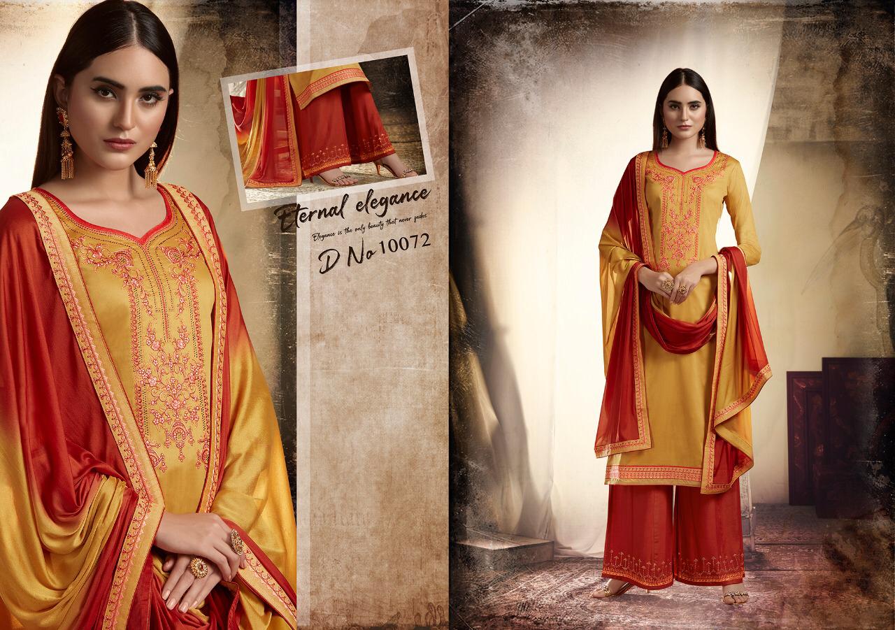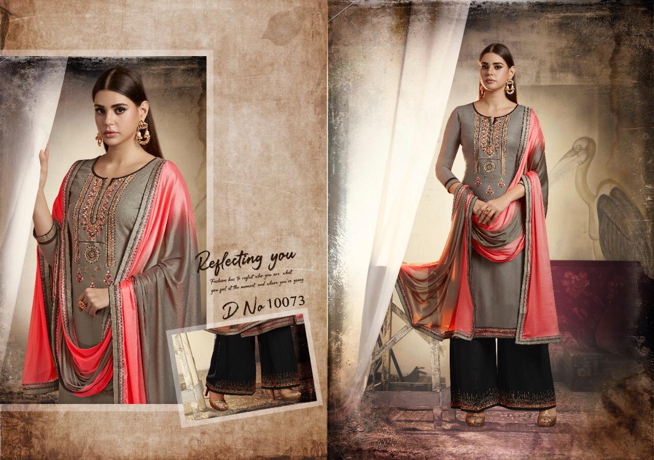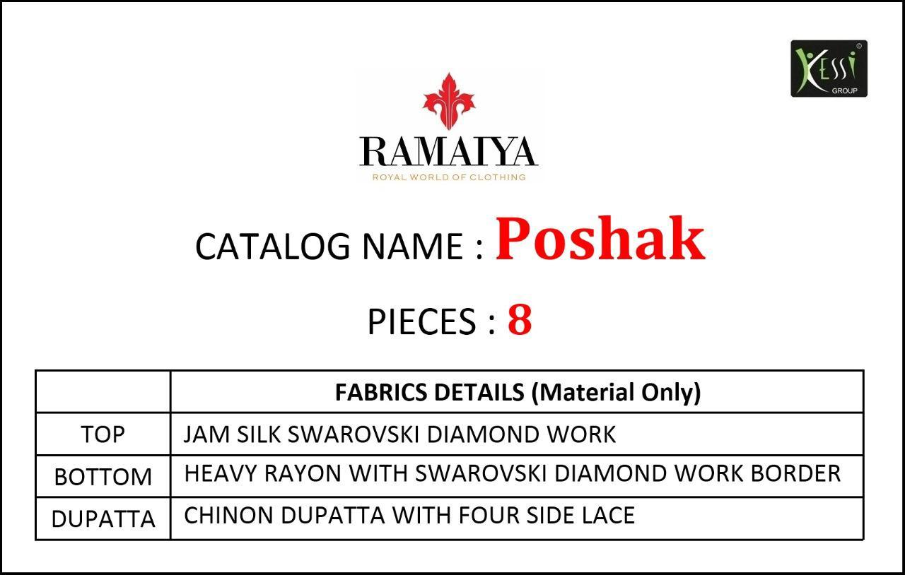 ? *Ramaiya (Kessi Fabrics Pvt. Ltd.)* has launched _Catalog name_ : *Poshak* ? _Fabric Details_ ? ?Top:- JAM SILK SWAROVSKI DIAMOND WORK ?Bottom:- HEAVY RAYON WITH SWAROVSKI DIAMOND WORK BORDER ?Dupatta:- CHINON DUPATTA WITH FOUR SIDE LACE ?Total Design:- 8 Rate. 799/- Set To Set . GST 5 Percent Extra ?Dispatching 5 to 6 days later ?Booking started from now... ?Order yours soon... |