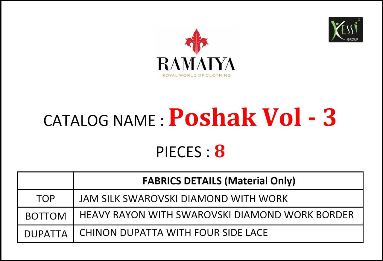 Buy Online Poshak Vol 3 By Ramaiya Jam Silk Dress Materials Wholesale Supplier Surat 8 Pcs of Full Catalogue at Wholesale Price. Looking for Poshak Vol 3 By Ramaiya Jam Silk Dress Materials Wholesale Supplier Surat Full Catalouge at Best Price? Buy Now Poshak Vol 3 By Ramaiya Jam Silk Dress Materials Wholesale Supplier Surat at Wholesale Rate of Rs 6392 with Total 8 Pcs from authroized dealer and supplier of Brand. Cost of Each piece is just only Rs 799 which is very low and affordable price to resale the product in your retail store ,This is Surat based Wholesale Supplier & Dealer of Brand. Click on Brand name to Know more about Brand's products.Call or Whatsapp on 9898838984 for booking or enquiry