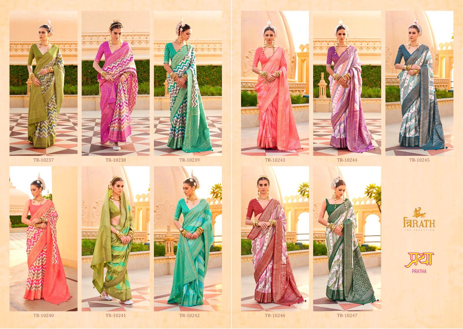 Buy Online Pratha Series 10237 To 10247 By Trirath Fancy Silk With Foil Print Sarre 11 Pcs of Full Catalogue at Wholesale Price. Looking for Pratha Series 10237 To 10247 By Trirath Fancy Silk With Foil Print Sarre Full Catalouge at Best Price? Buy Now Pratha Series 10237 To 10247 By Trirath Fancy Silk With Foil Print Sarre at Wholesale Rate of Rs 18645 with Total 11 Pcs from authroized dealer and supplier of TRIRATH Brand. Cost of Each piece is just only Rs 1695 which is very low and affordable price to resale the product in your retail store ,This is Surat based Wholesale Supplier & Dealer of TRIRATH Brand. Click on Brand name to Know more about TRIRATH Brand's products.Call or Whatsapp on 9898838984 for booking or enquiry