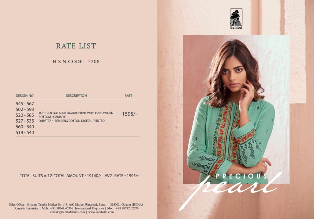 Buy Online Precious Pearl By Sahiba Cotton Digital Printed Hand Work Suits Wholesale Dealer And Exporter Surat 12 Pcs of Full Catalogue at Wholesale Price. Looking for Precious Pearl By Sahiba Cotton Digital Printed Hand Work Suits Wholesale Dealer And Exporter Surat Full Catalouge at Best Price? Buy Now Precious Pearl By Sahiba Cotton Digital Printed Hand Work Suits Wholesale Dealer And Exporter Surat at Wholesale Rate of Rs 19140 with Total 12 Pcs from authroized dealer and supplier of SAHIBA Brand. Cost of Each piece is just only Rs 1595 which is very low and affordable price to resale the product in your retail store ,This is Surat based Wholesale Supplier & Dealer of SAHIBA Brand. Click on Brand name to Know more about SAHIBA Brand's products.Call or Whatsapp on 9898838984 for booking or enquiry