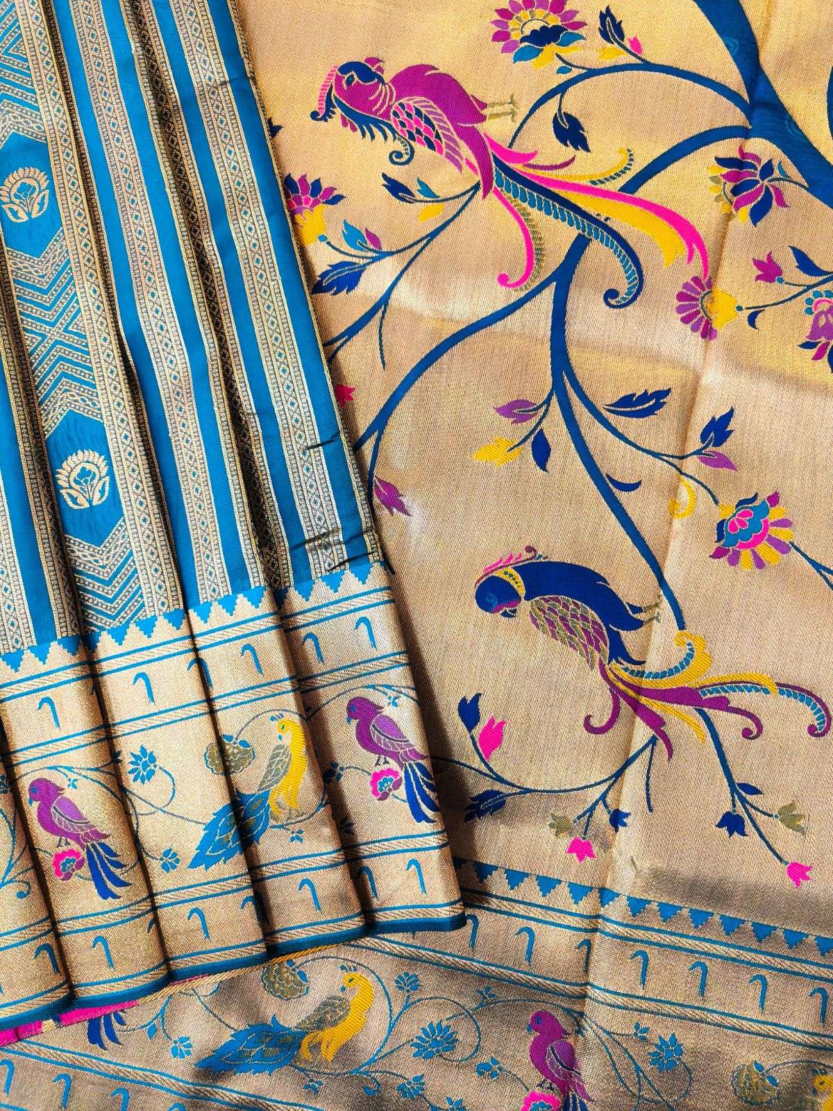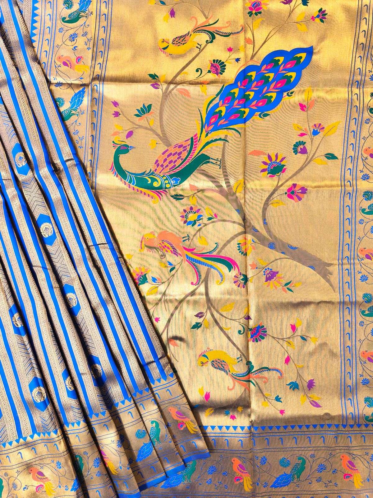 Grace your wardrobe with this Premium Soft Paithani Silk Saree, crafted to reflect royal elegance. The saree showcases a rich zari woven Paithani pallu, paired with a beautifully woven zari border that enhances its traditional charm. The body is adorned with an all-over zari strips pattern, giving it a luxurious and classy appeal. Comes with a running blouse piece, making it perfect for weddings, festive celebrations, and special occasions. ✨ Ready Stock Available |