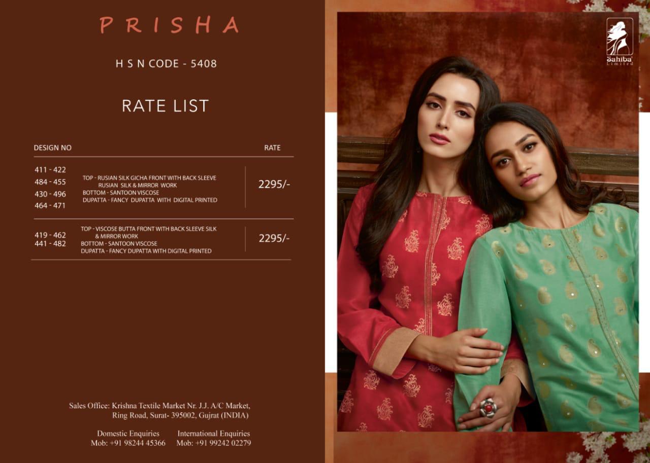 Buy Online Prisha By Sahiba Silk Desinger Party Wear Dresses Wholesale Supplier And Dealer Gujarat 12 Pcs of Full Catalogue at Wholesale Price. Looking for Prisha By Sahiba Silk Desinger Party Wear Dresses Wholesale Supplier And Dealer Gujarat Full Catalouge at Best Price? Buy Now Prisha By Sahiba Silk Desinger Party Wear Dresses Wholesale Supplier And Dealer Gujarat at Wholesale Rate of Rs 27540 with Total 12 Pcs from authroized dealer and supplier of SAHIBA Brand. Cost of Each piece is just only Rs 2295 which is very low and affordable price to resale the product in your retail store ,This is Surat based Wholesale Supplier & Dealer of SAHIBA Brand. Click on Brand name to Know more about SAHIBA Brand's products.Call or Whatsapp on 9898838984 for booking or enquiry