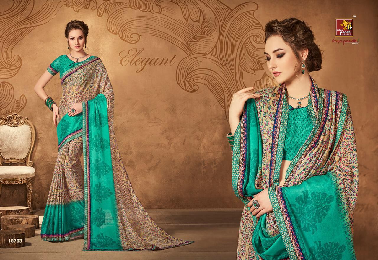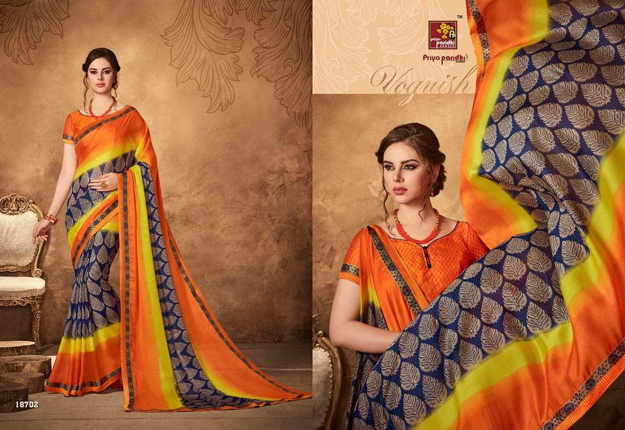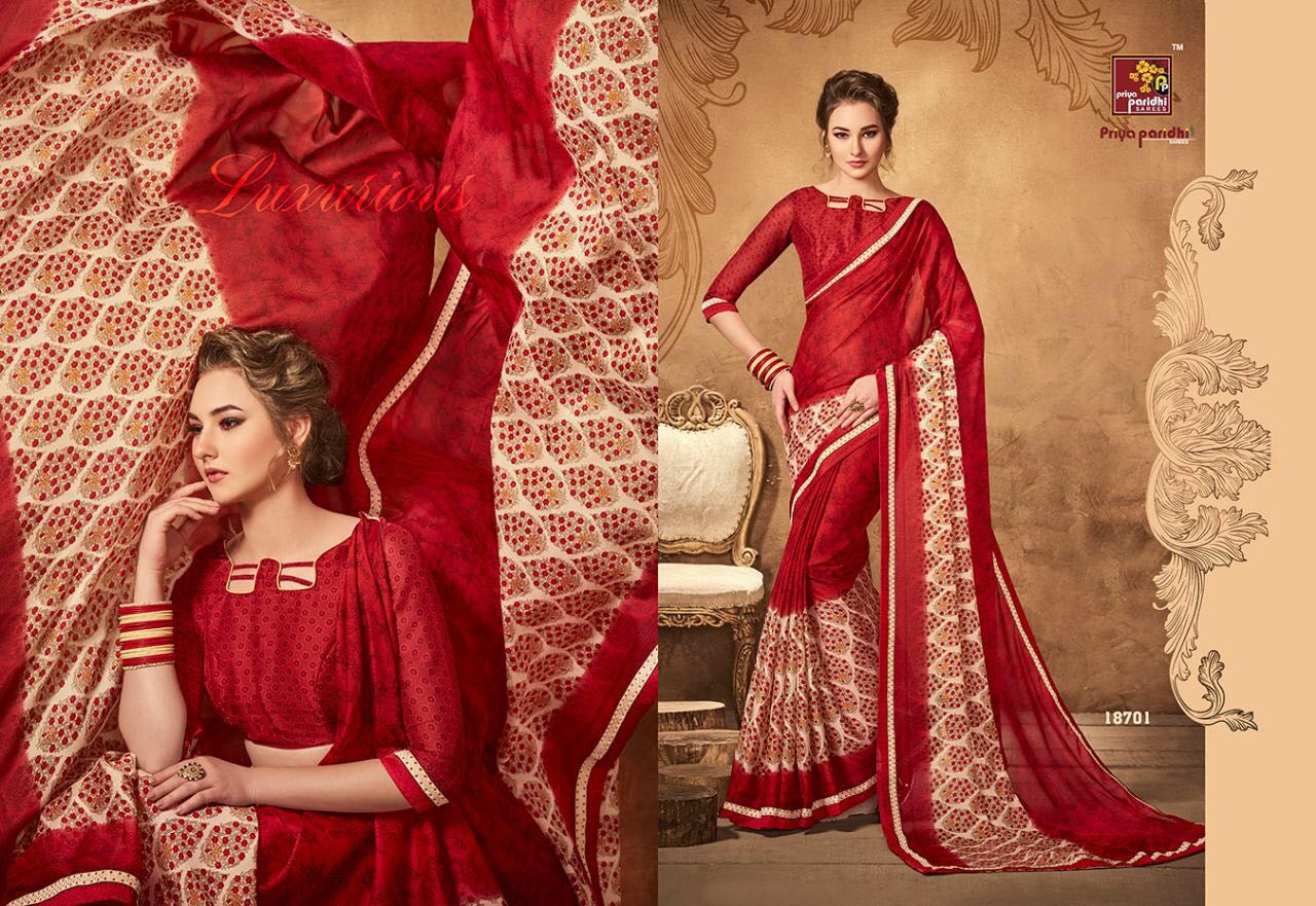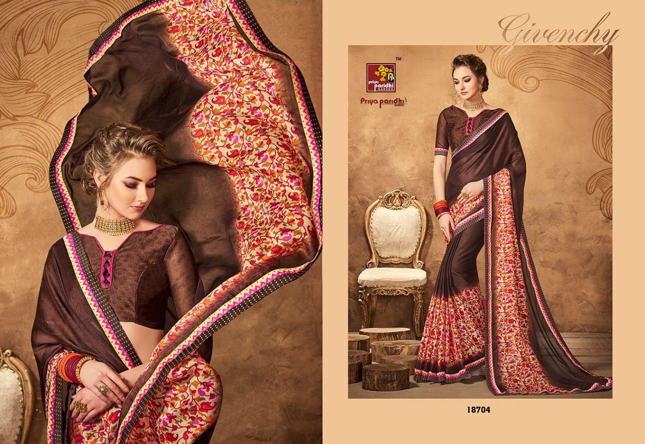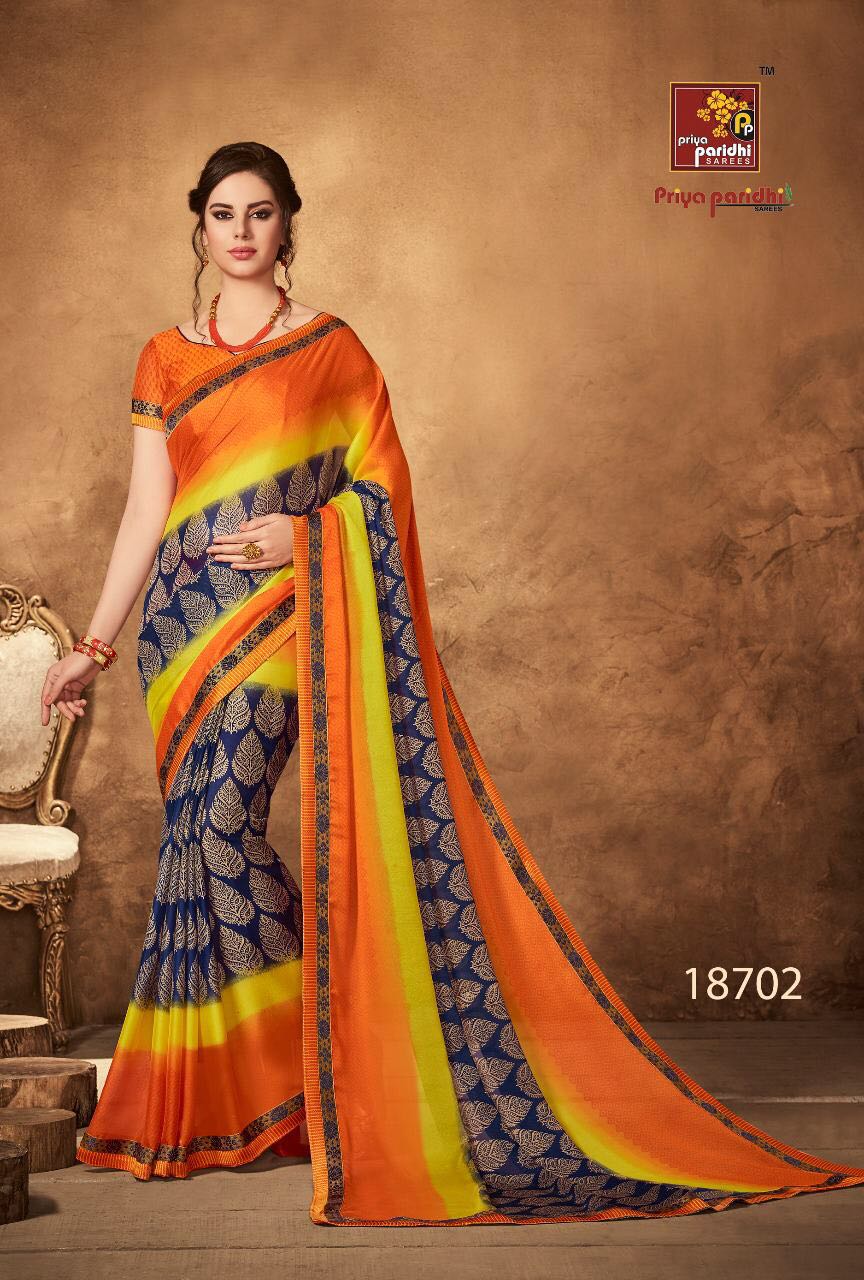 Buy Online Priya Paridhi Zivika Vol 4 18701 Series Georgette Saree 10 Pcs of Full Catalogue at Wholesale Price. Looking for Priya Paridhi Zivika Vol 4 18701 Series Georgette Saree Full Catalouge at Best Price? Buy Now Priya Paridhi Zivika Vol 4 18701 Series Georgette Saree at Wholesale Rate of Rs 5210 with Total 10 Pcs from authroized dealer and supplier of PRIYA PARIDHI Brand. Cost of Each piece is just only Rs 521 which is very low and affordable price to resale the product in your retail store ,This is Surat based Wholesale Supplier & Dealer of PRIYA PARIDHI Brand. Click on Brand name to Know more about PRIYA PARIDHI Brand's products.Call or Whatsapp on 9898838984 for booking or enquiry