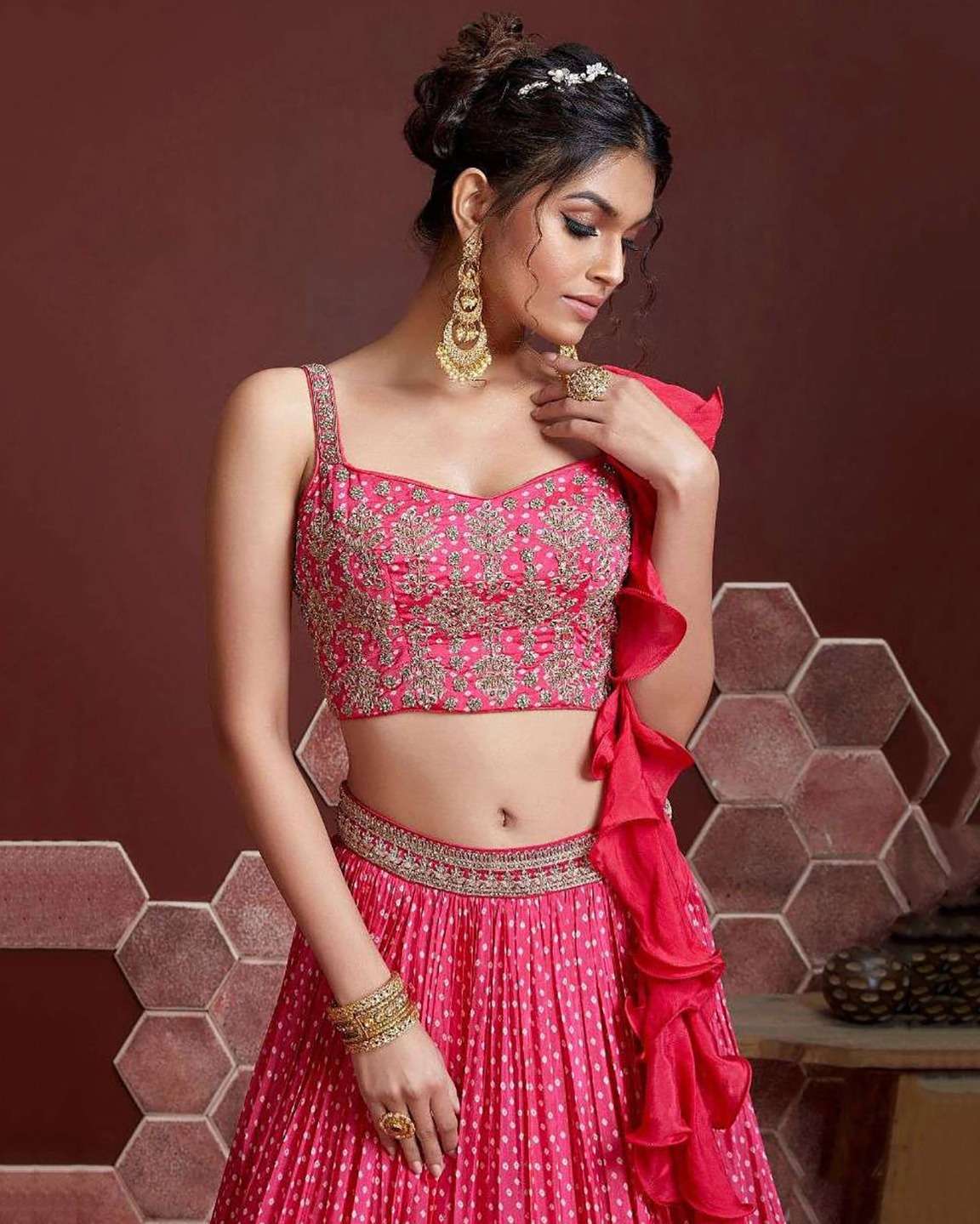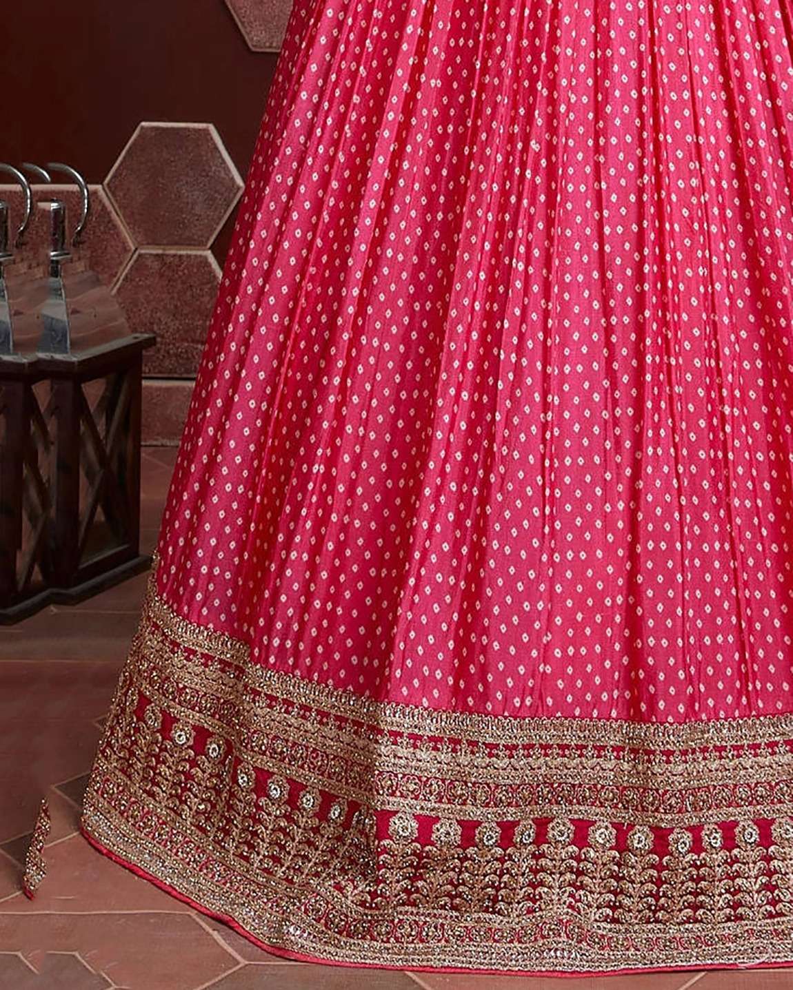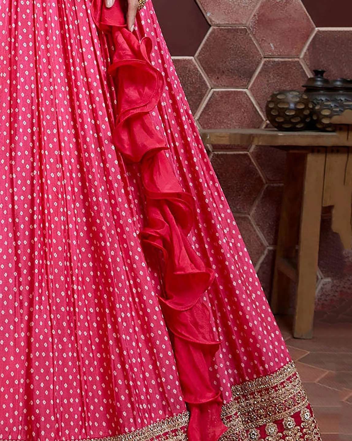 Be the sunshine of everyone's eyes dressed in this pink-colored digital print Chinon silk lehenga choli. The lehenga is beautified with heavy embroidery and digital print work with Swarovski which is eye-catching.
