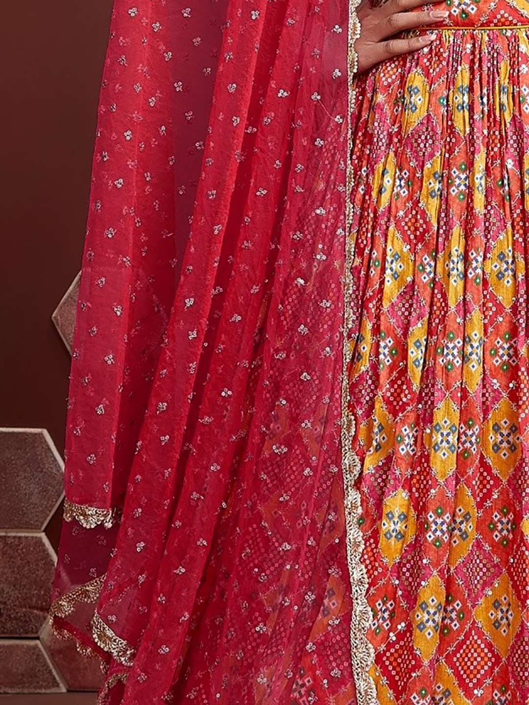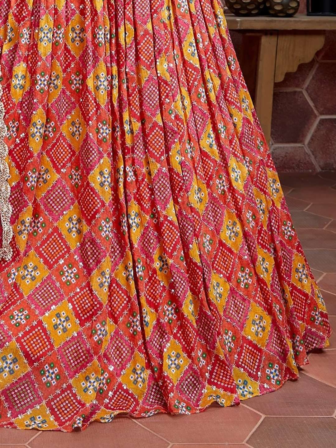 *Lehenga:* The flared pure chinnon silk lehenga is designed with a colorful Bandhani-inspired position digital print in a mix of warm tones with intricate zari and sequins embroidery work, creating a joyful and energetic vibe ideal for celebrations.
