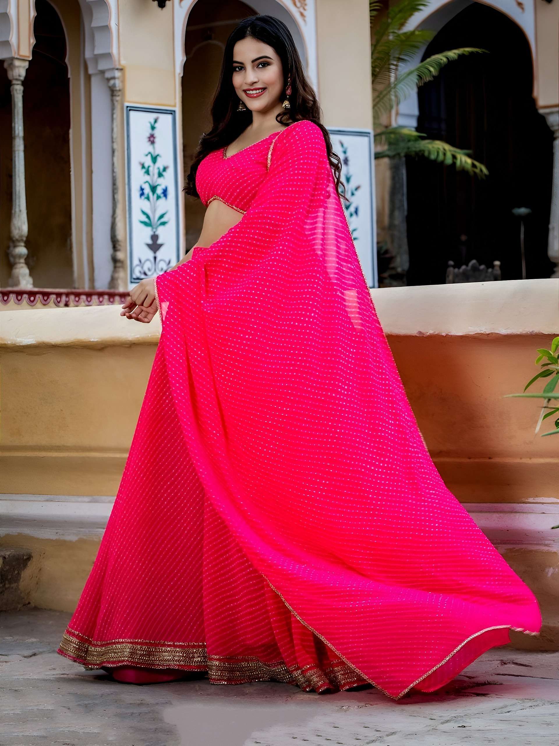 💃 *LEHENGA DETAILS (Semi-Stitched)* • Fabric: Soft Georgette • Work: Zari and Cording Lacework with Leheriya Print • Flare: 4.5 mtr approx • Size: Semi-Stitched (Fits up to 43" Waist and 43" Length)
