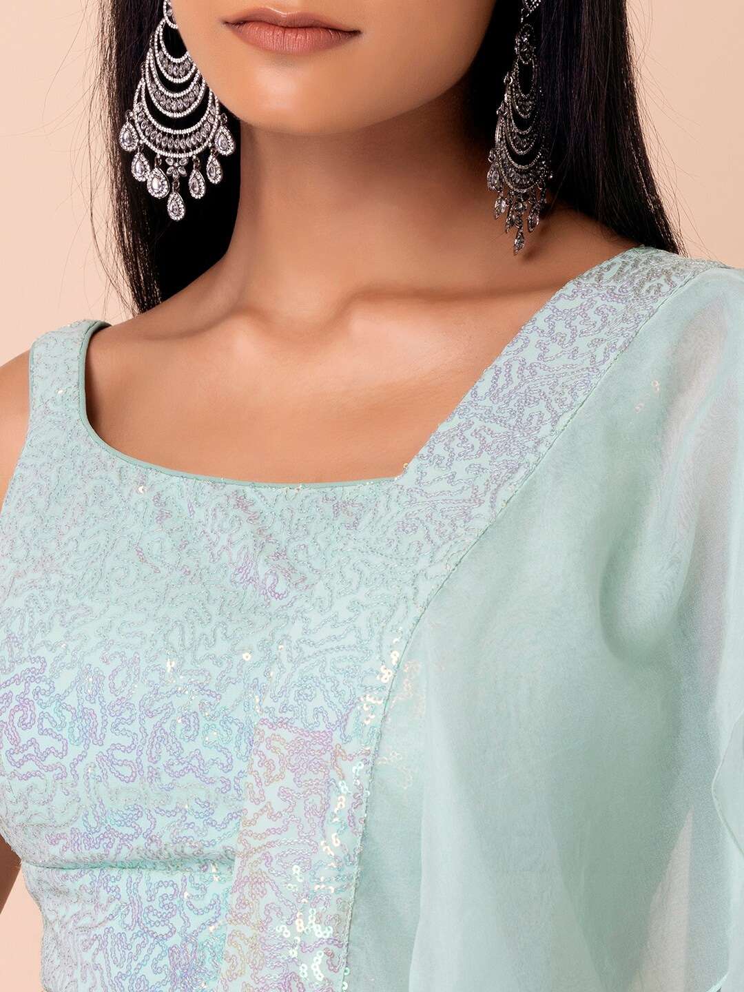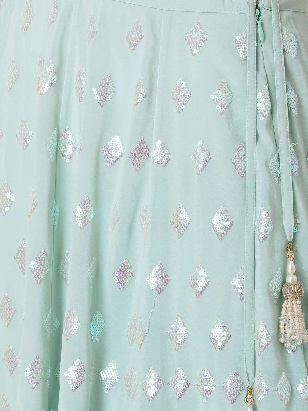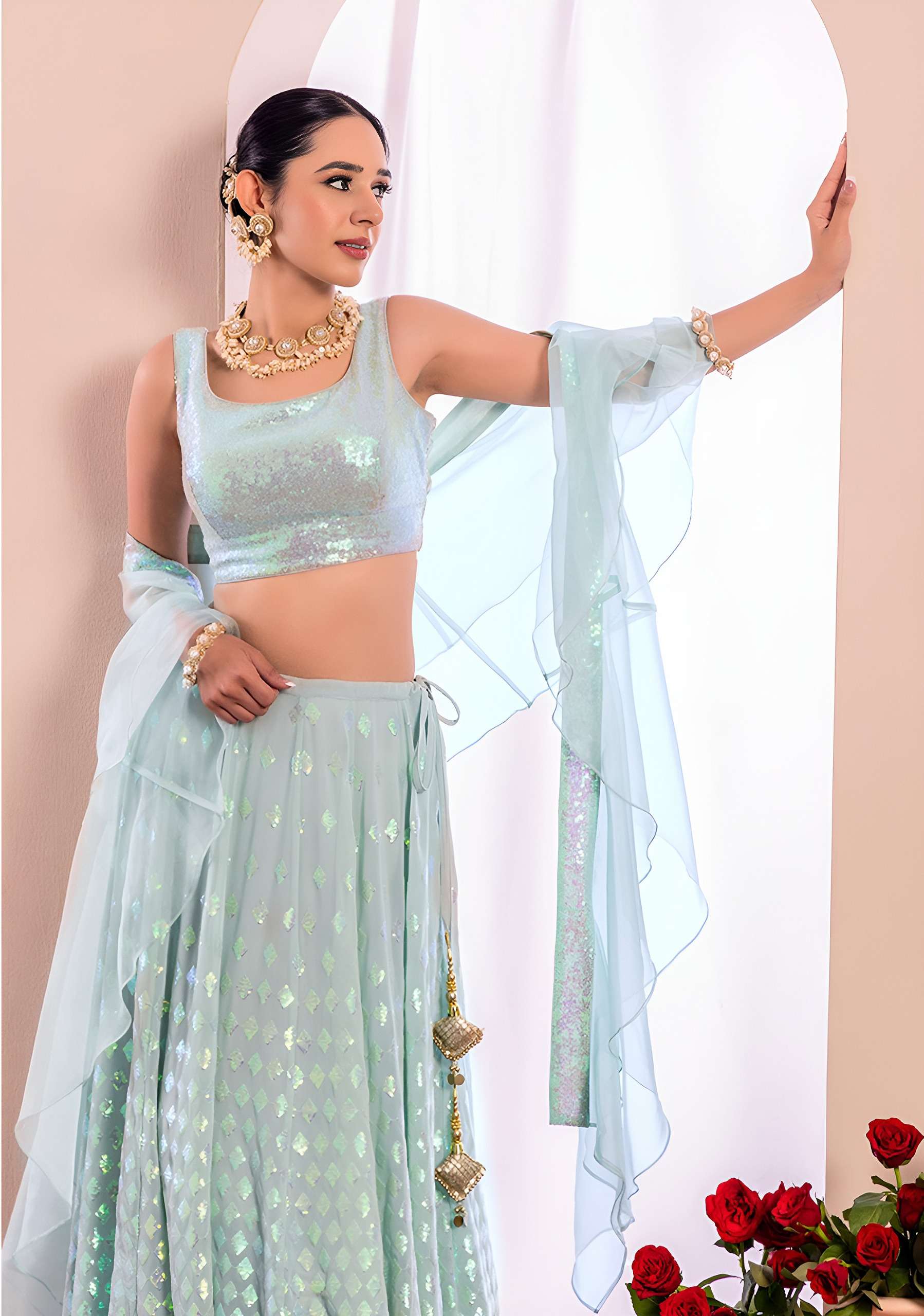 💛 A pastel blue flared georgette lehenga with intricate sequins and thread embroidered diamond and floral shape motifs all over. The hemline is finished with a subtle shimmer border and flowy fabric that gives it a voluminous and regal look..