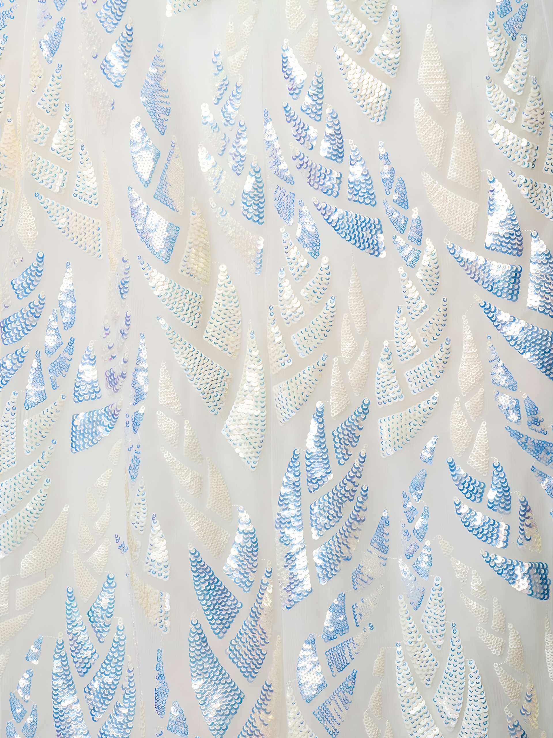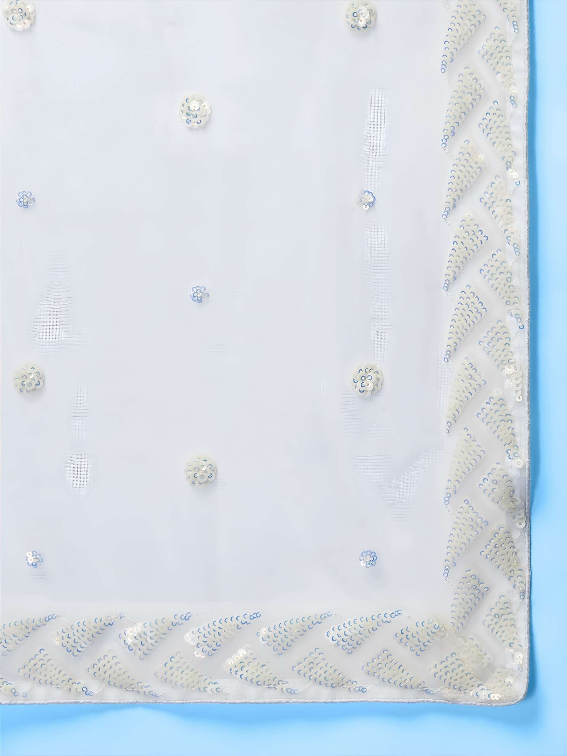 This white lehenga set shines with elegant sequins leaf embroidery layered over soft net fabric, creating a dreamy festive silhouette. Paired with a stylish embroidered blouse and lightweight dupatta, the ensemble is perfect for weddings, receptions, and grand celebrations, offering both comfort and luxury appeal.
