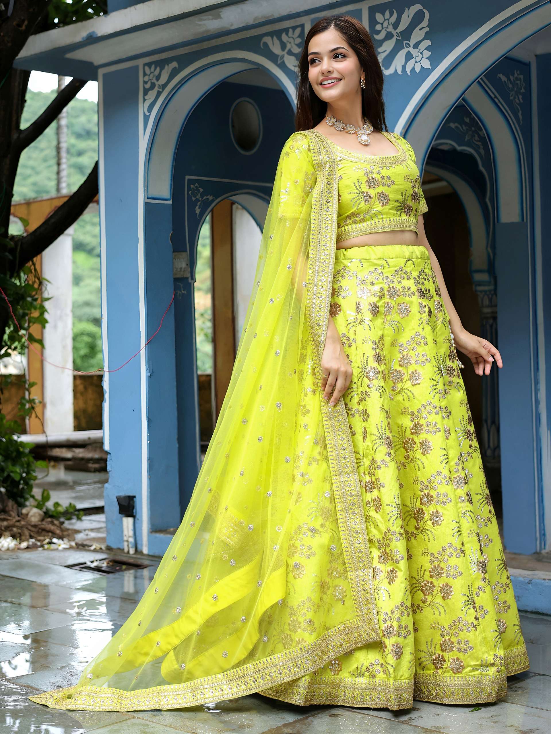 **Lehenga (Semi-Stitched)* Fabric: Slub Silk Work: zari, dori and sequins embroidery work Flair: 3.50 mtr approx Size : waist-43" Length-43" Canvas and Cancan layer attached