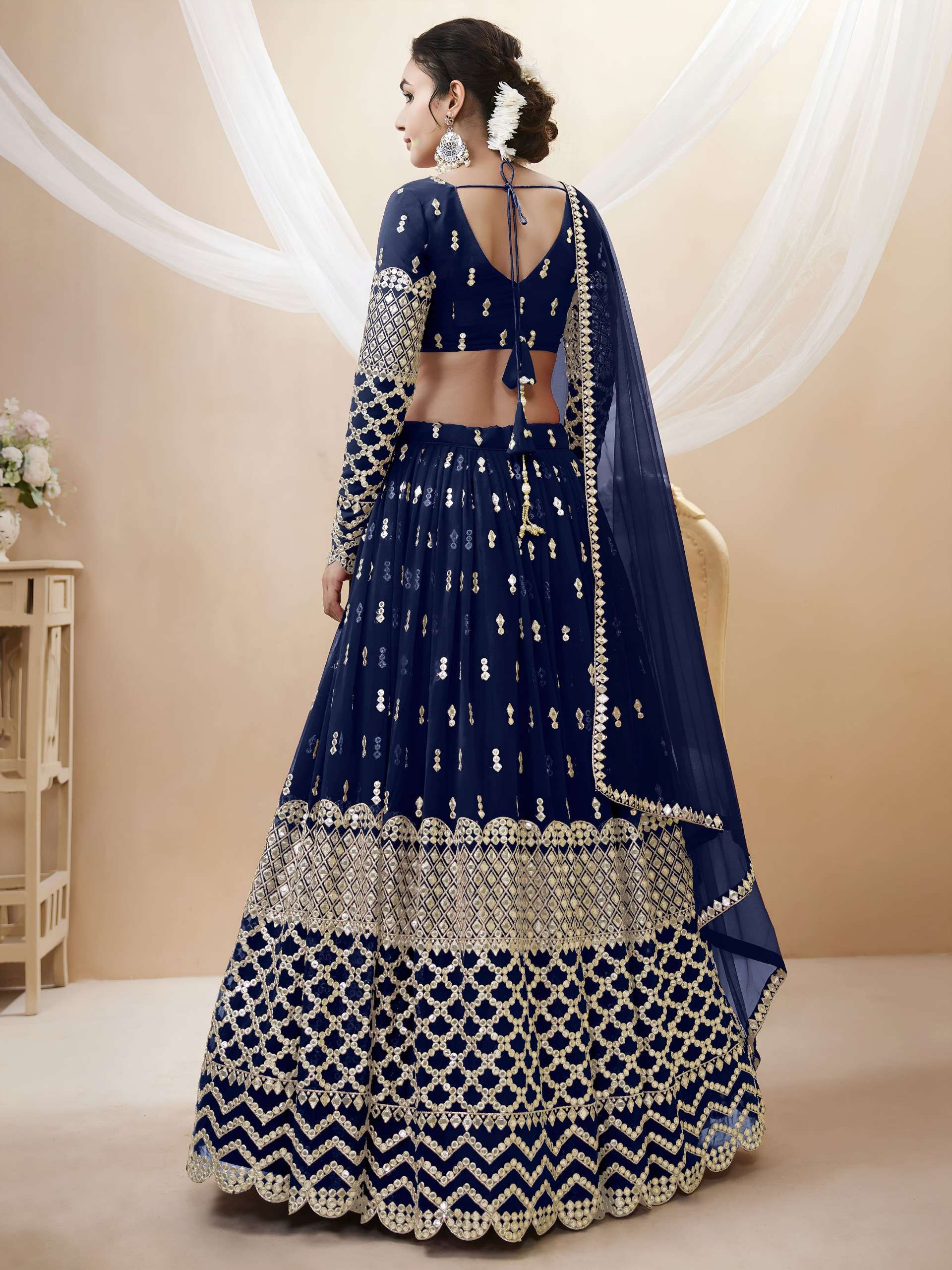 ✨ *Lehenga* : A graceful navy-blue georgette lehenga adorned with sparkling zari and sequin butti work, finished with a bold geometric embroidered border that adds royal festive flair 👑✨.