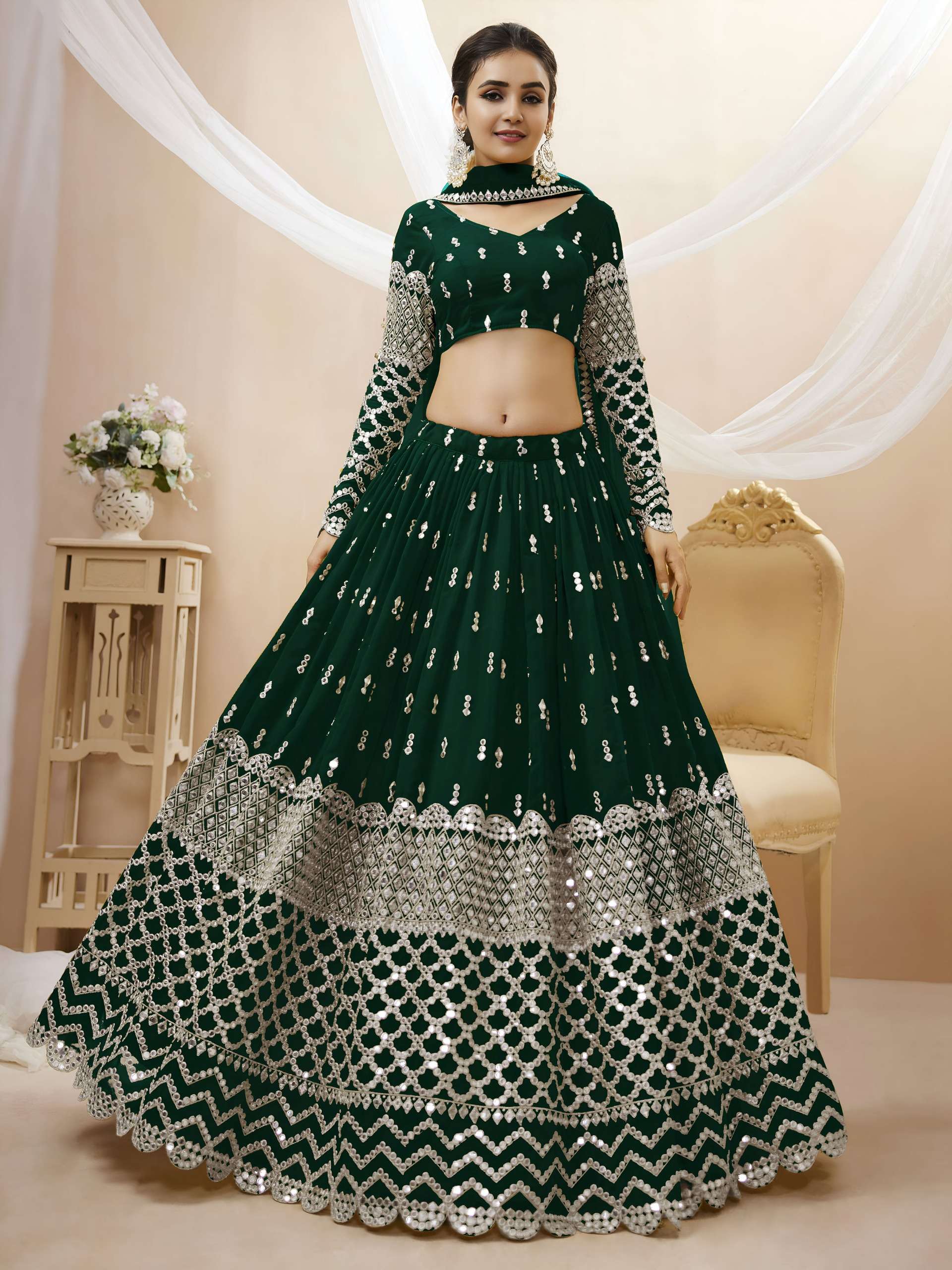 Gst extra ✨ *Lehenga* : A rich emerald green georgette lehenga adorned with shimmering zari and sequin butti work, finished with an intricate geometric embroidered border that adds grand festive elegance 👑✨.