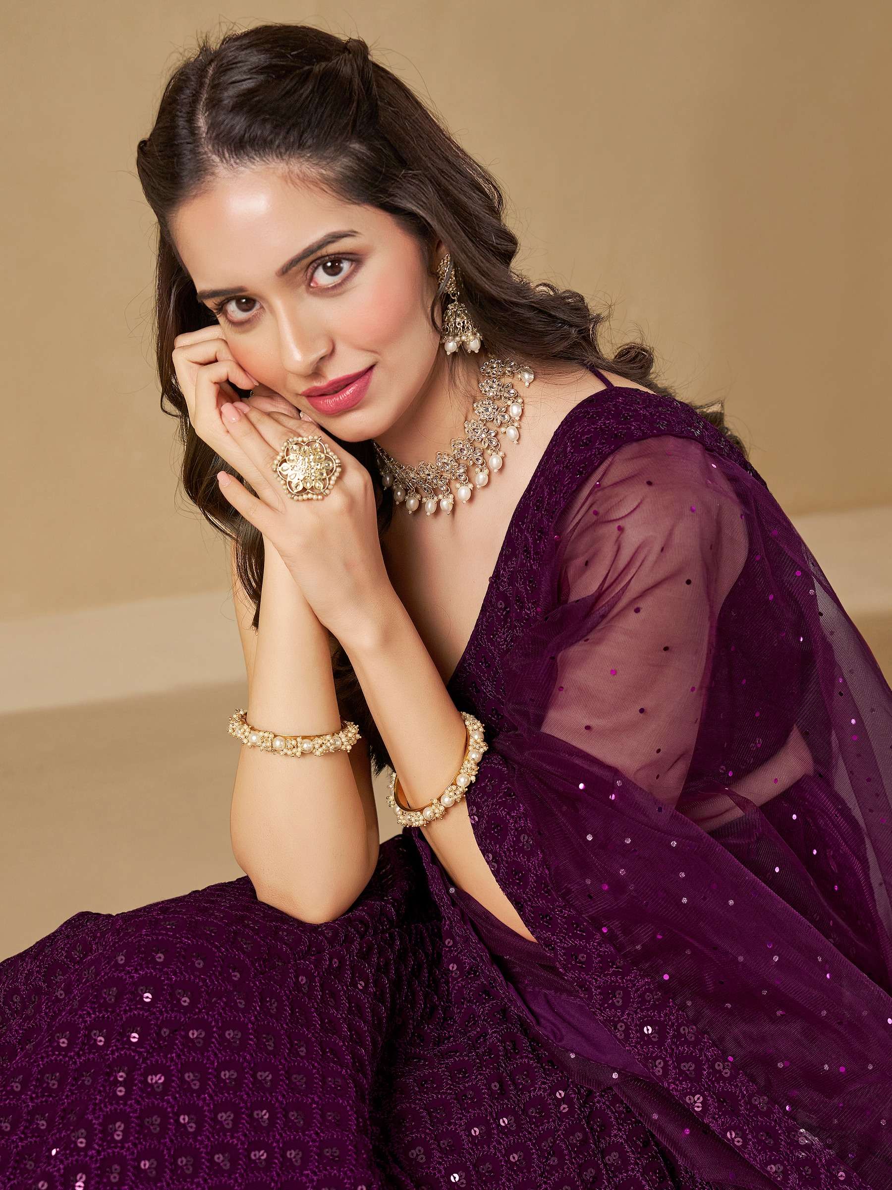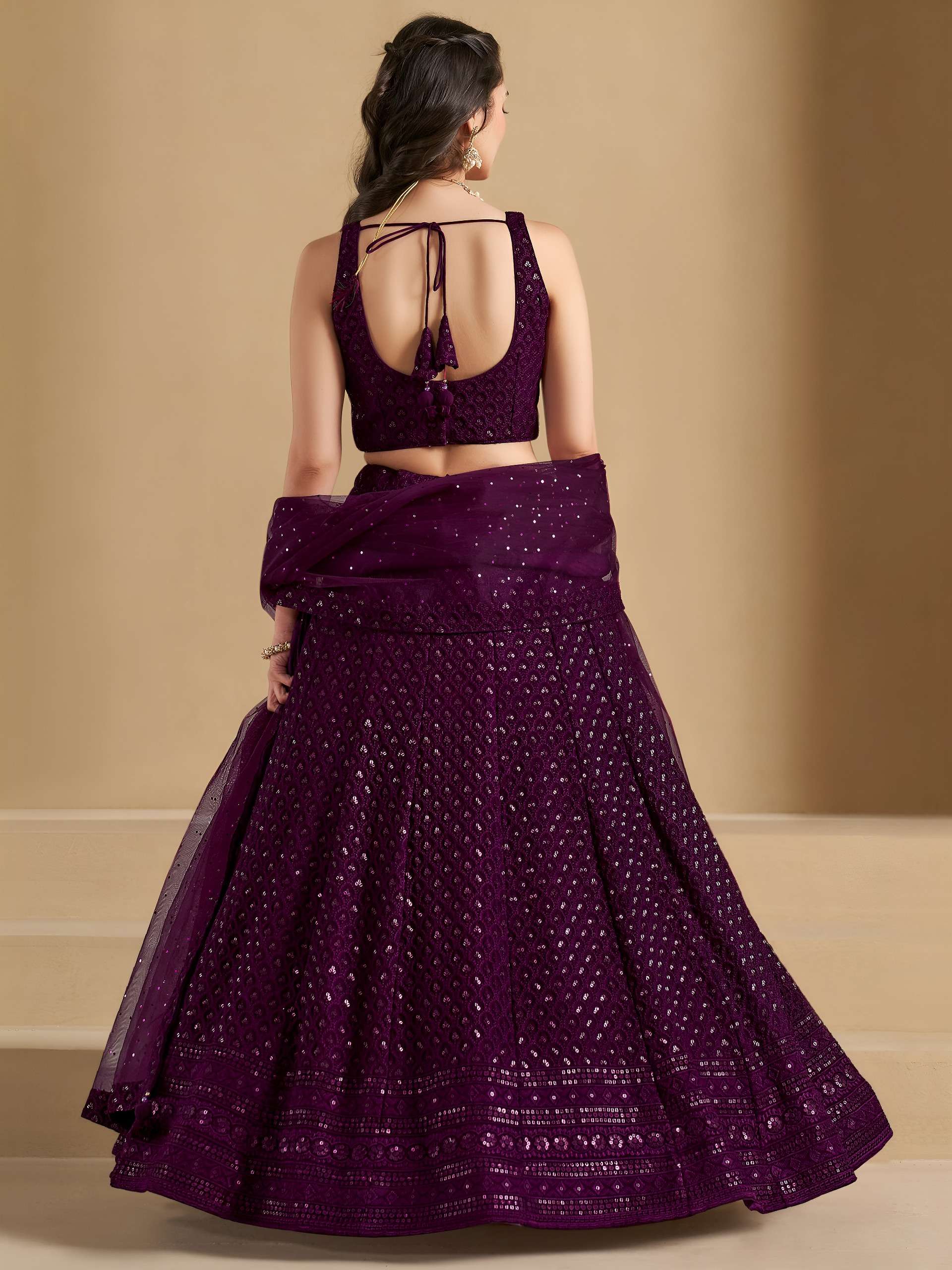 This lovable wine georgette lehenga choli features exquisite sequins and thread embroidery, offering a chic monochrome design perfect for parties and festive occasions.