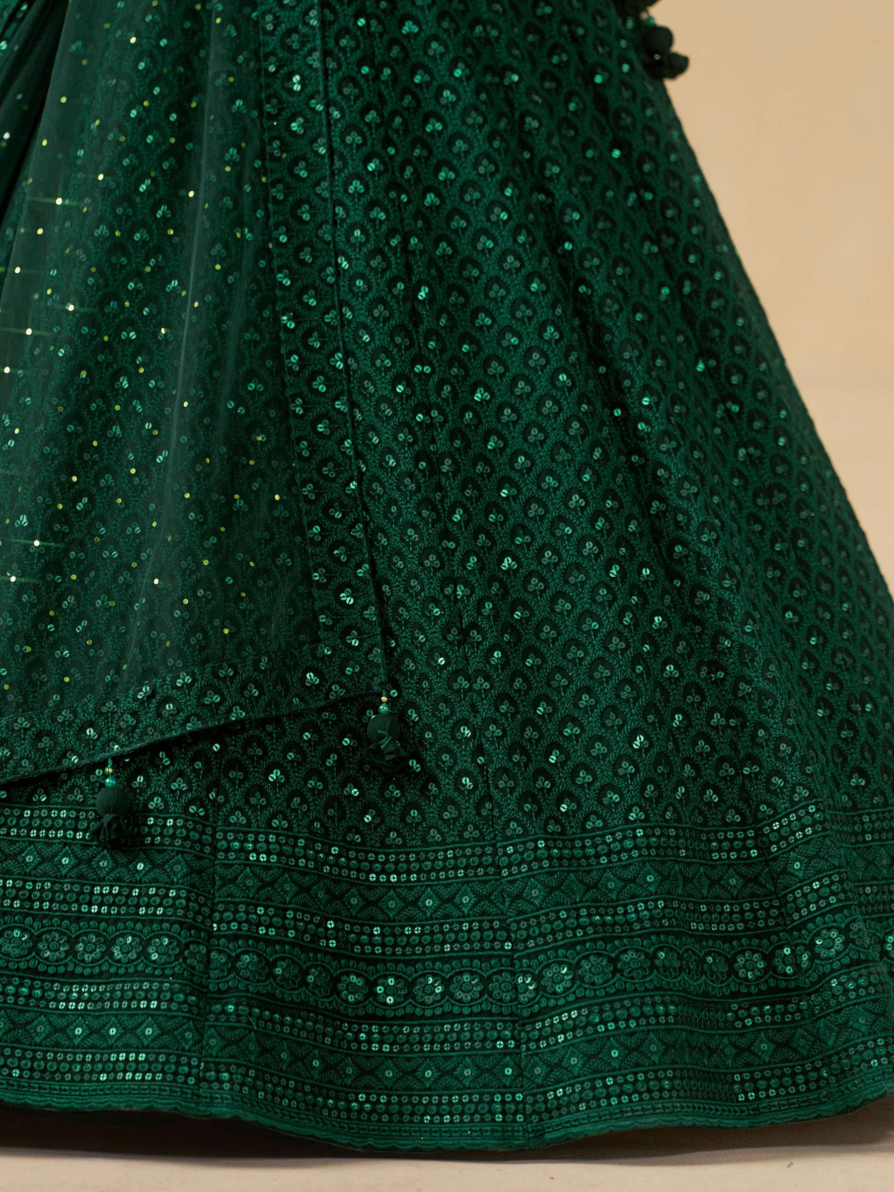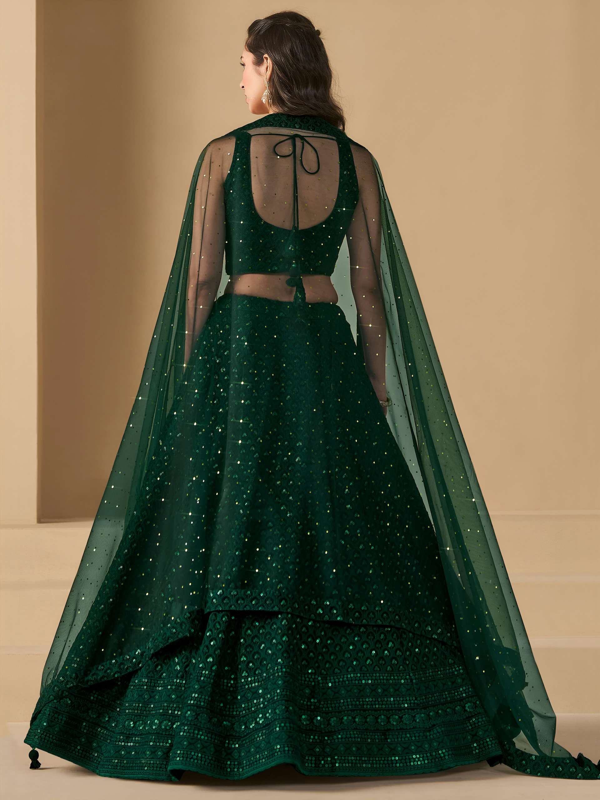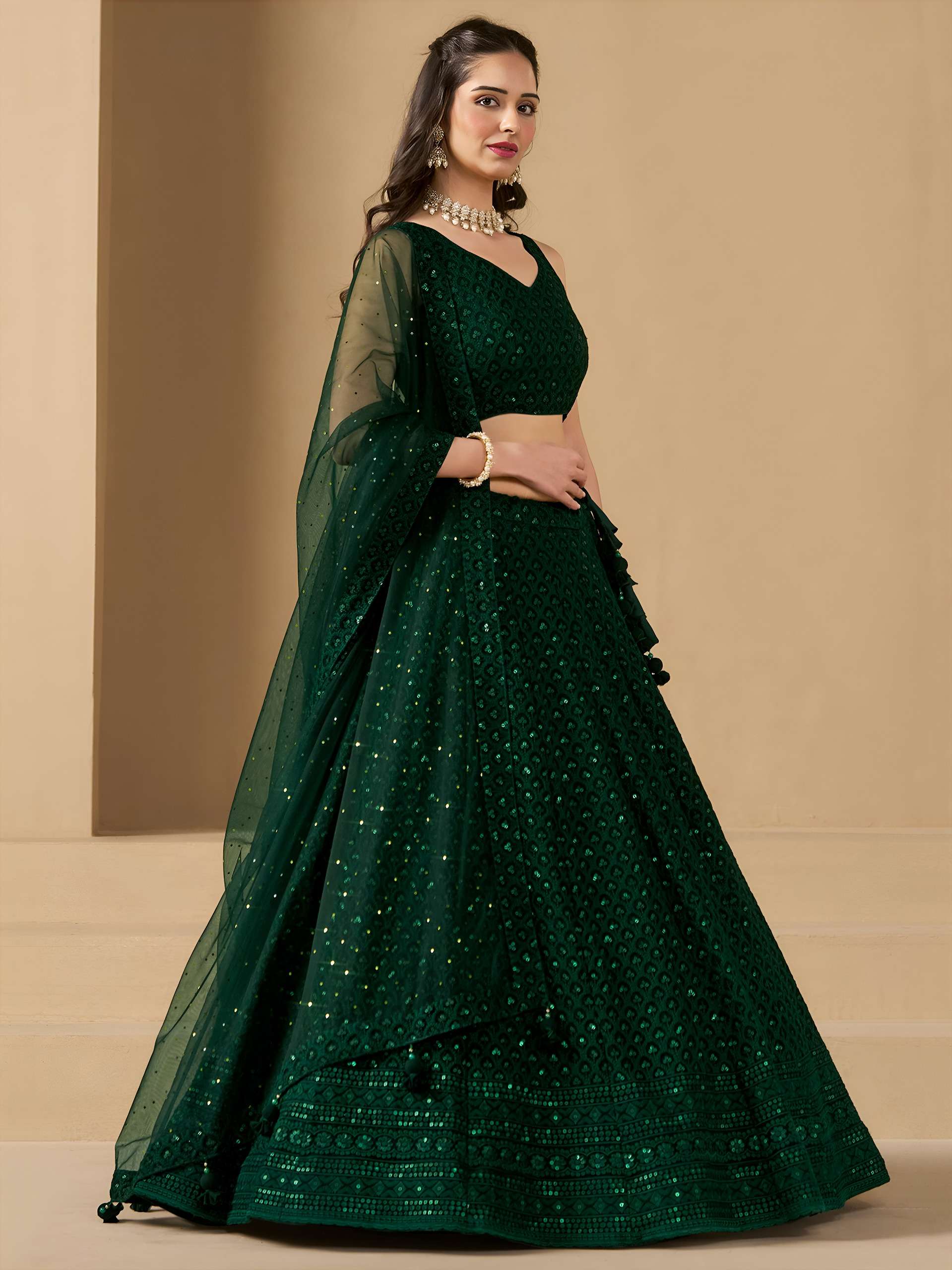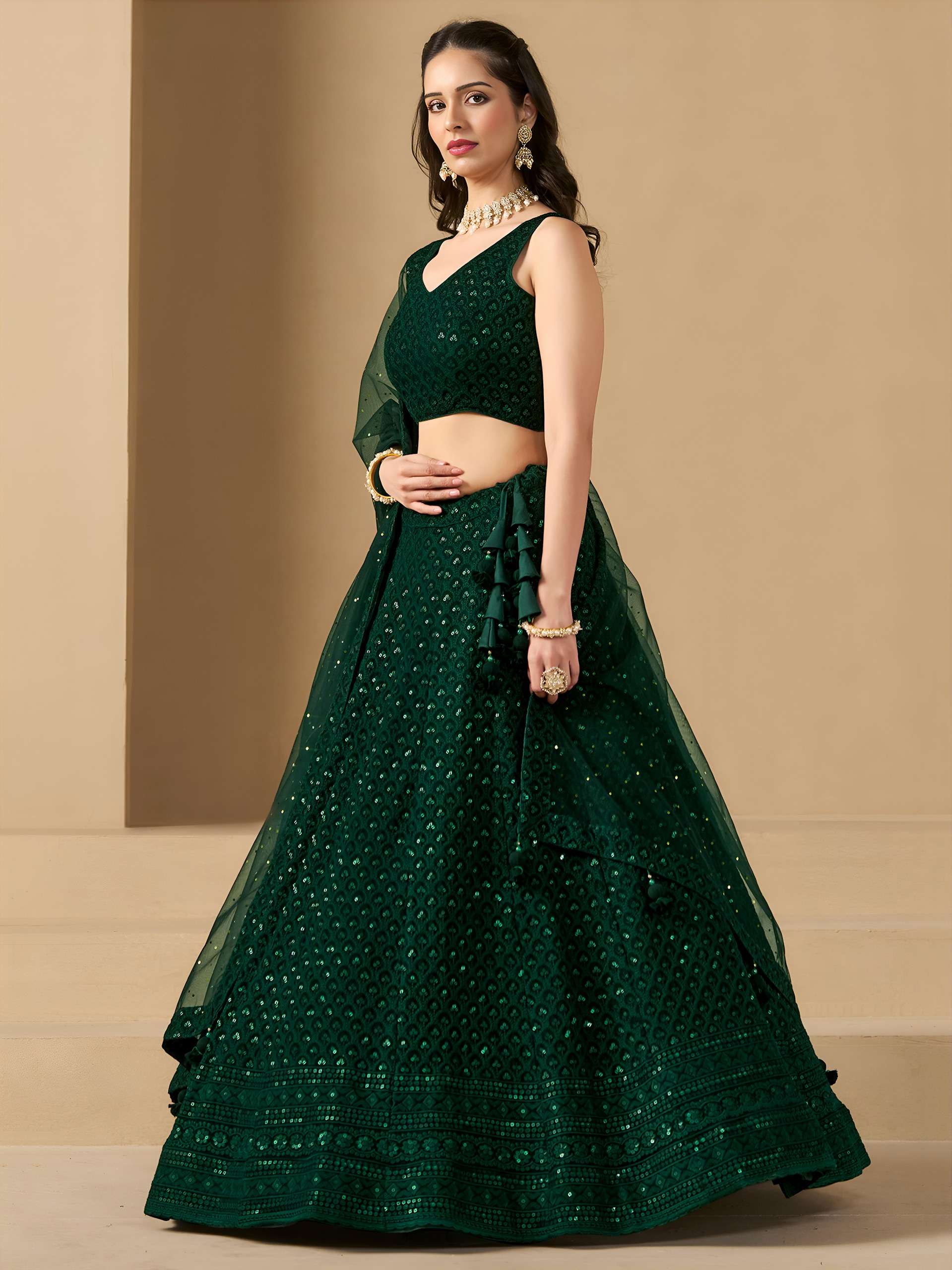 Turn heads in this captivating green georgette lehenga choli, beautifully designed with sequins and thread embroidery. The monochrome look adds elegance, perfect for parties and festive occasions.