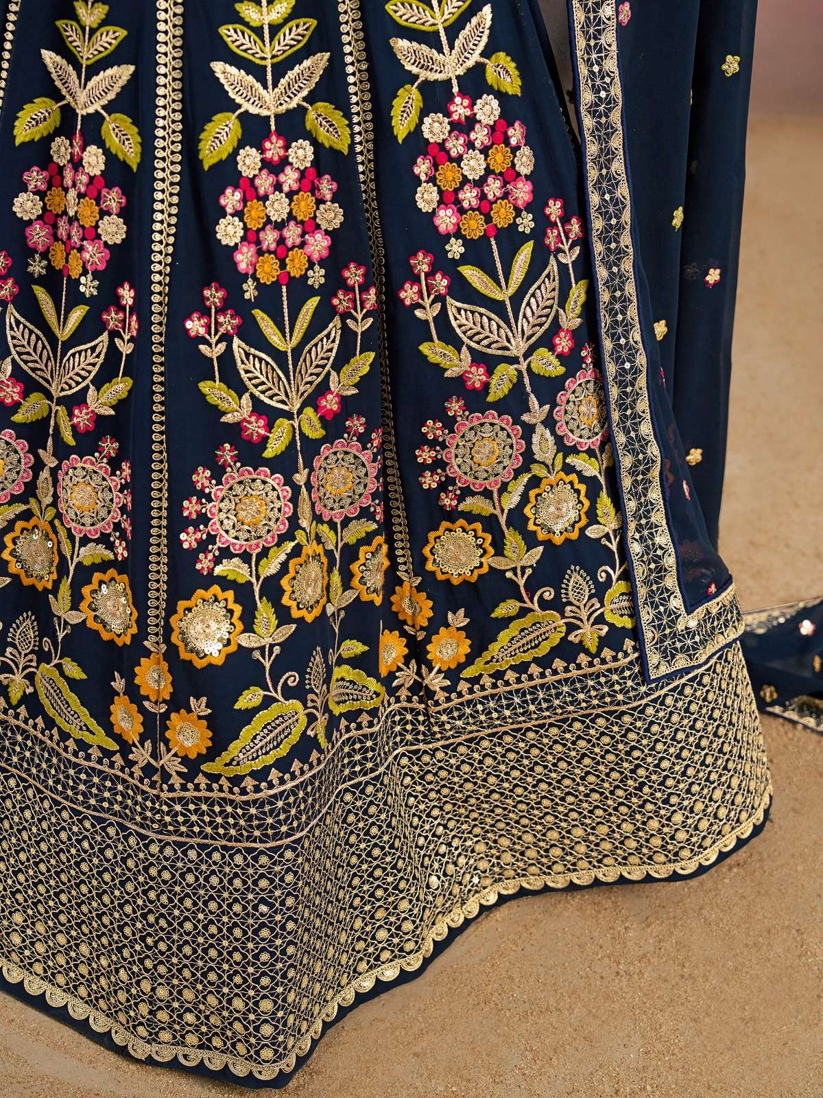✨ *Lehenga* : Made from premium georgette fabric in a deep navy blue shade, the lehenga is adorned with vibrant multi-color floral embroidery, golden zari detailing, and intricate resham and sequins work. The flared silhouette and broad embroidered hem give it a royal flair.
