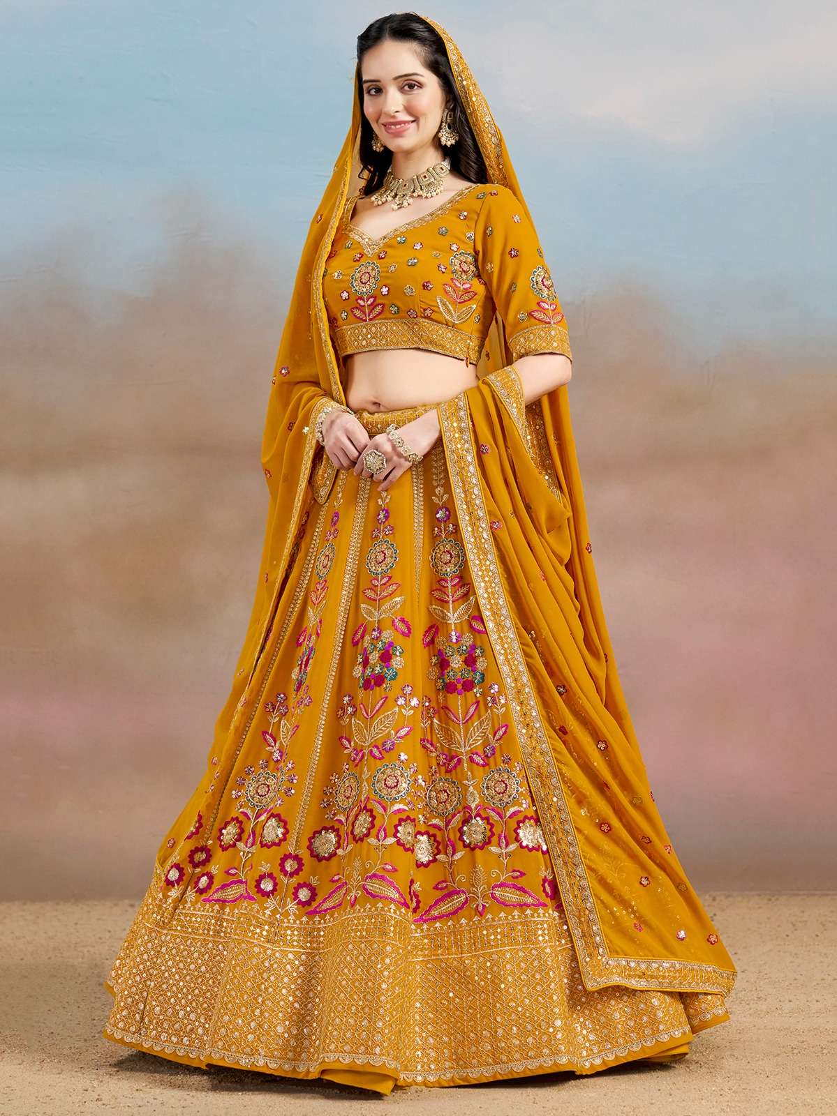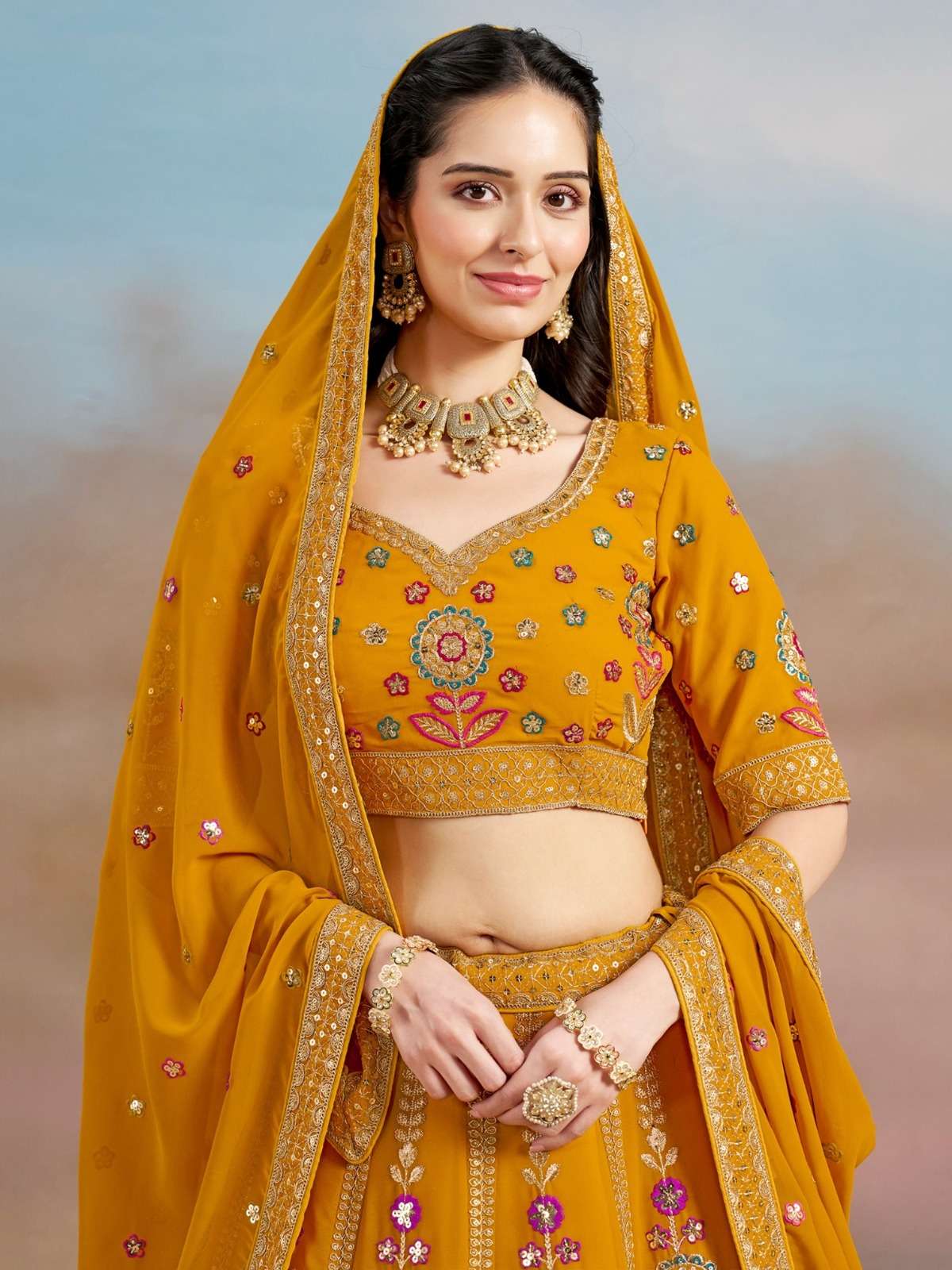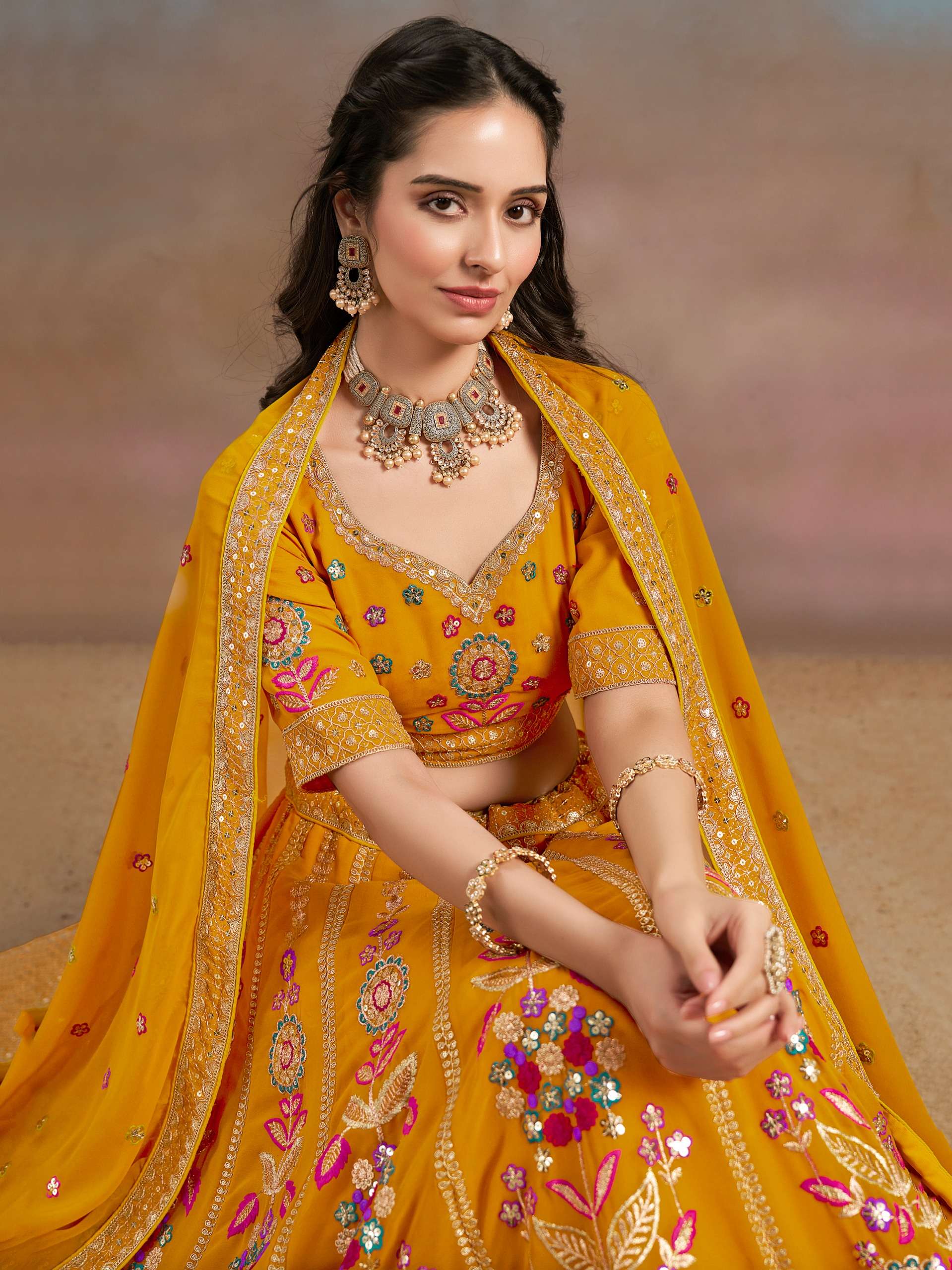 This mustard yellow georgette lehenga choli set is a stunning festive ensemble that radiates warmth and charm. The lehenga features a rich floral embroidered pattern with multicolor resham threads with intricate zari, sequins and dori work, creating a vibrant garden-like effect along the flare. ✨🌸