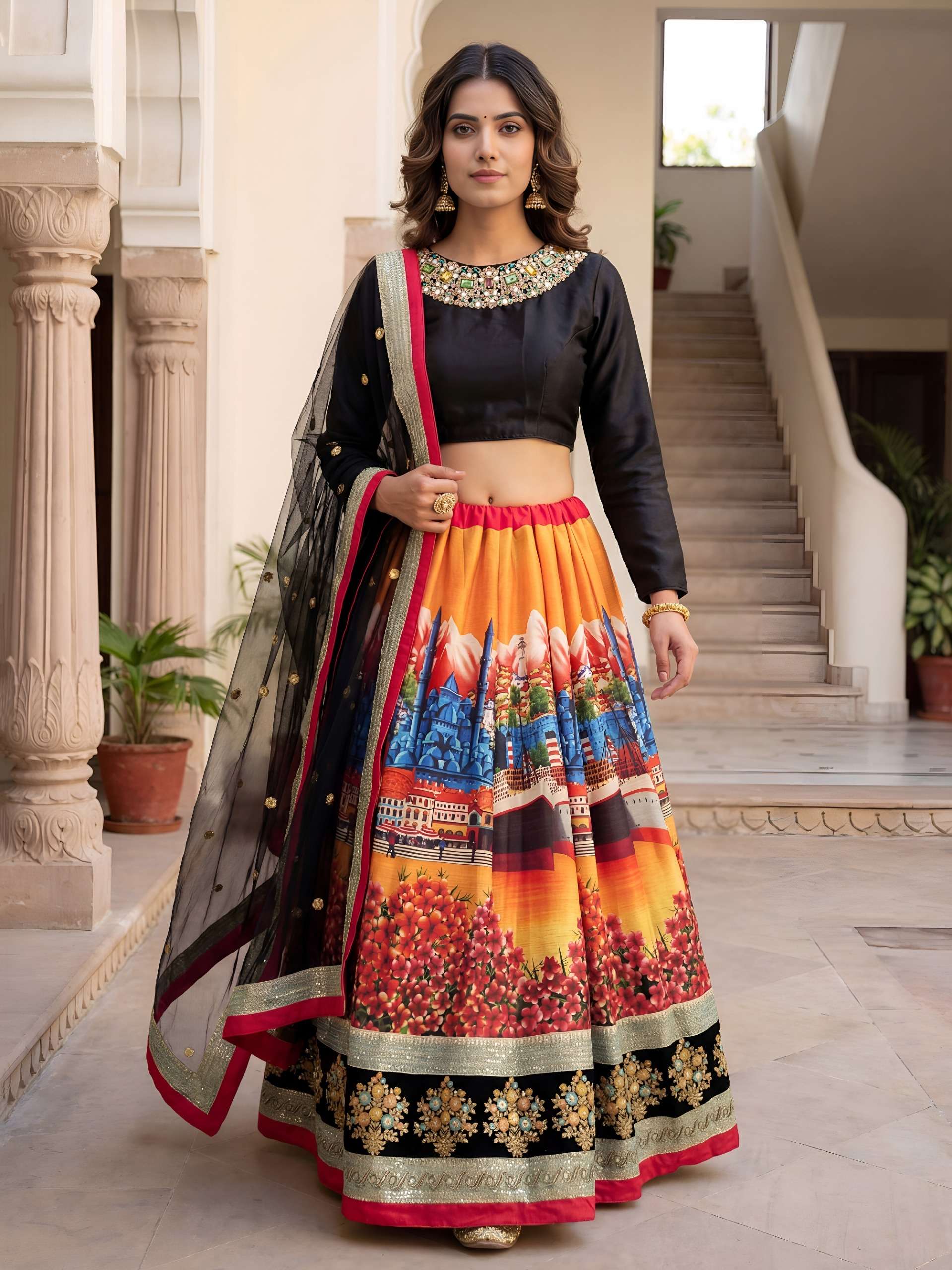 🖤 *Black Blouse with Digital Printed Scenic Lehenga Choli* ✨ Wedding • Graceful • Special Occasions 🌟