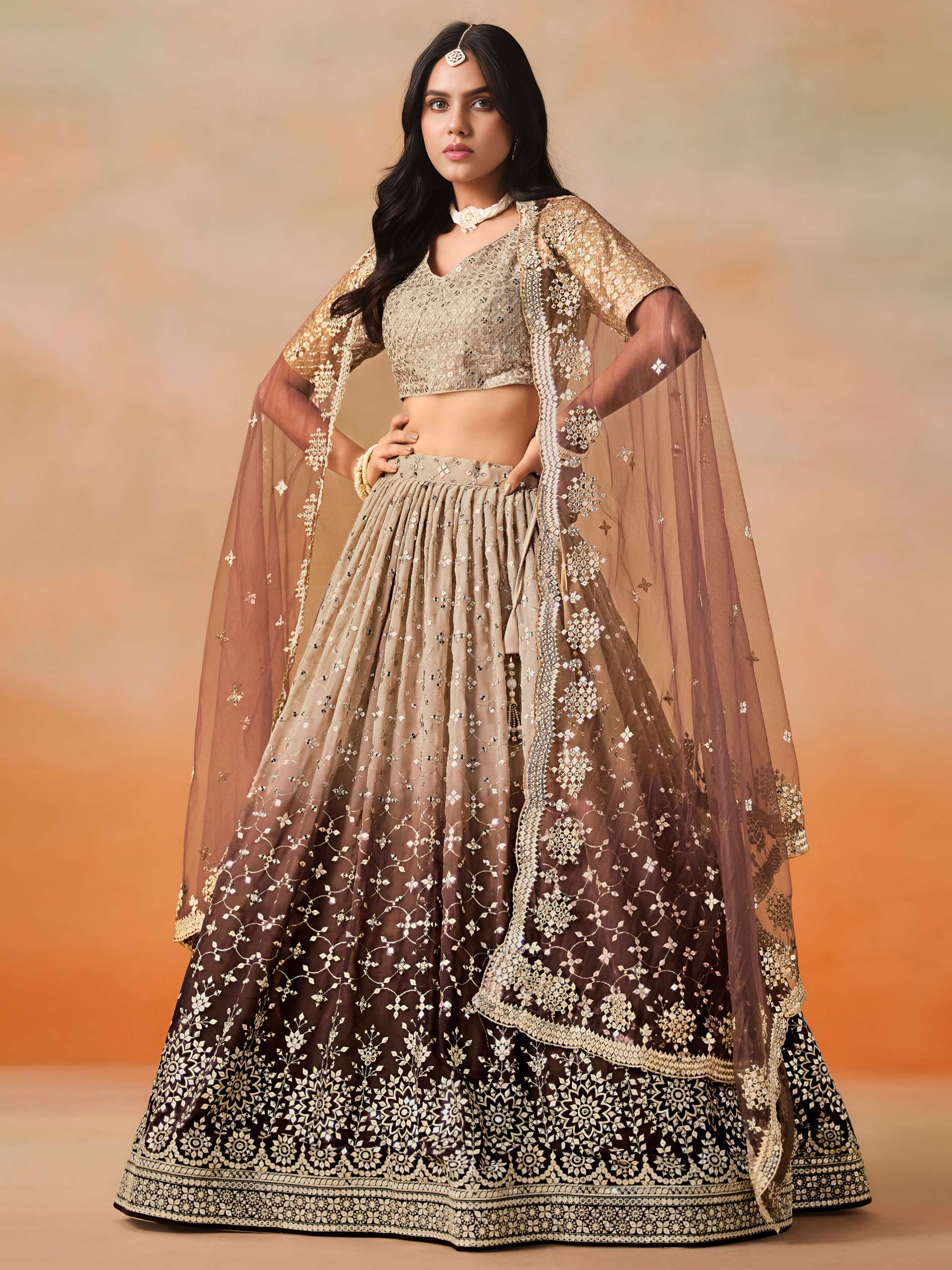 **Lehenga:* The Georgette Ombre lehenga features a beautiful gradient from beige to deep brown, adorned with heavy silver zari and sequins embroidery in elaborate floral and geometric patterns, creating a luxurious and traditional look.