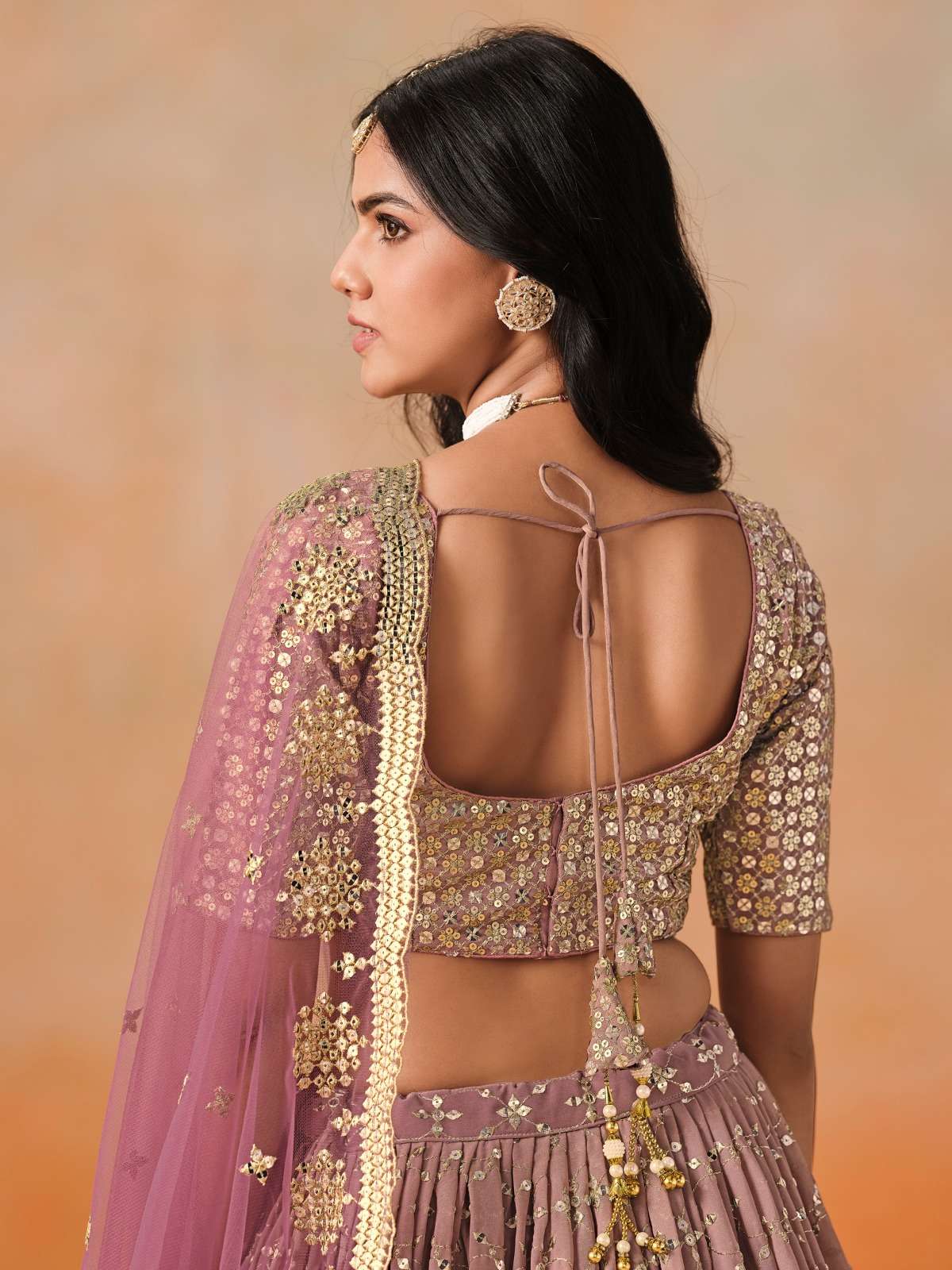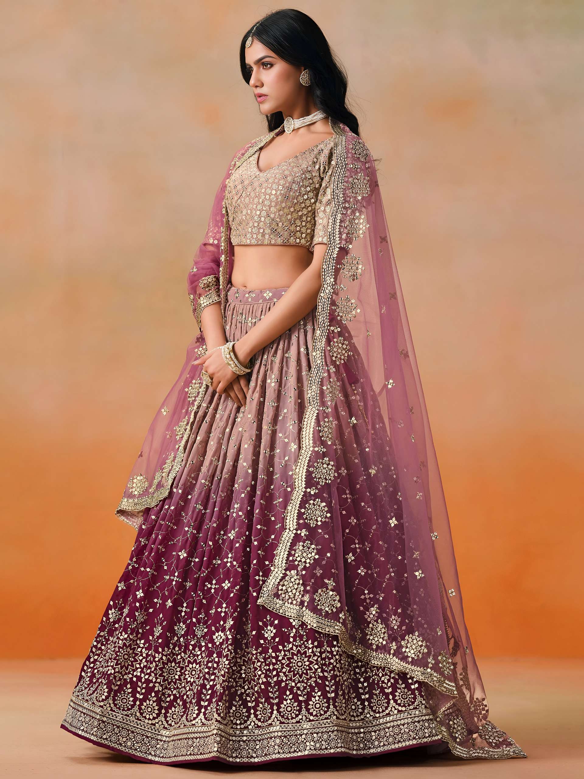 *Lehenga:* The Georgette Ombre lehenga features an elegant ombré gradient from mauve to deep maroon, richly embellished with intricate zari, sequin, and thread embroidery in floral and geometric patterns.