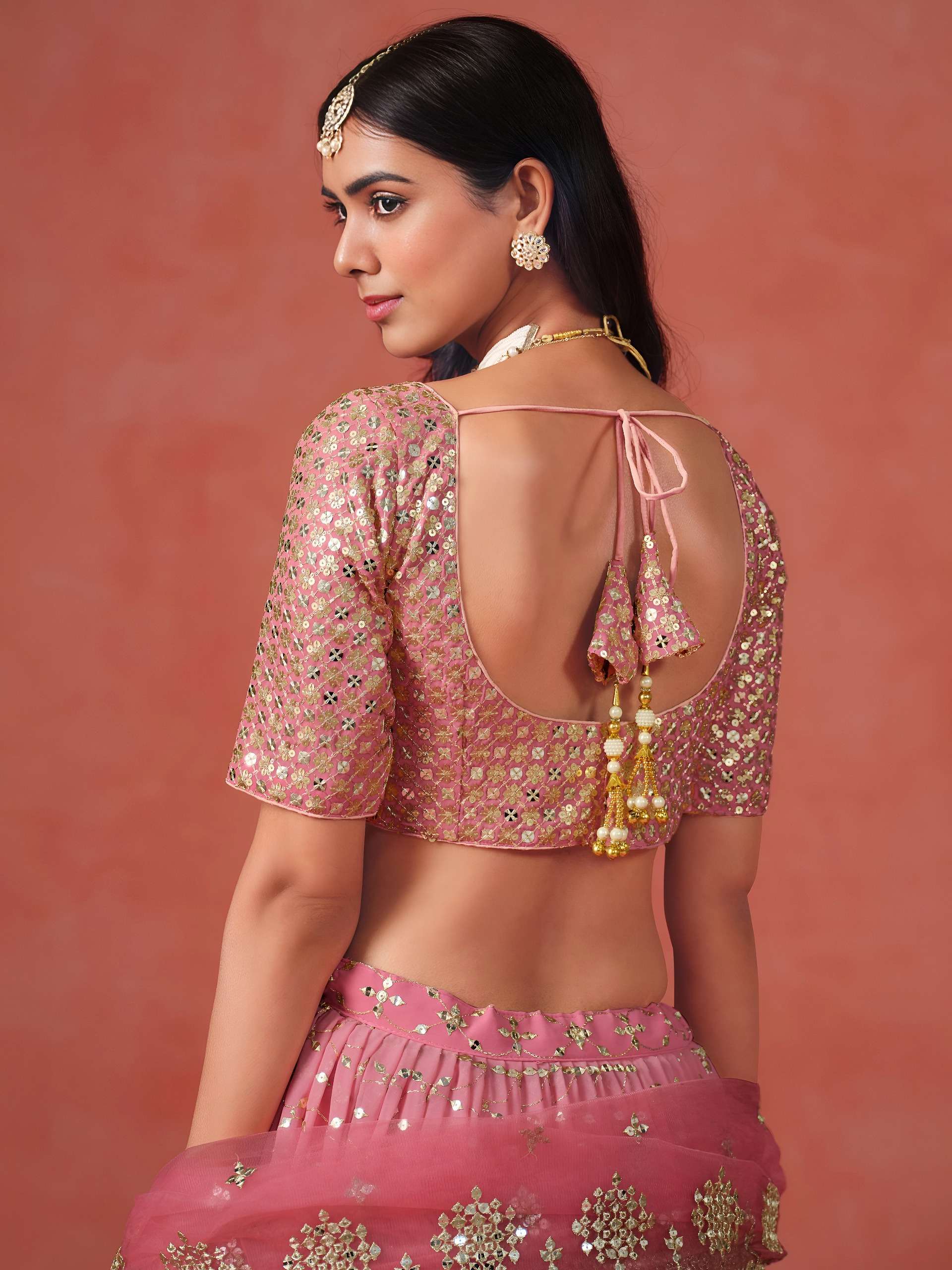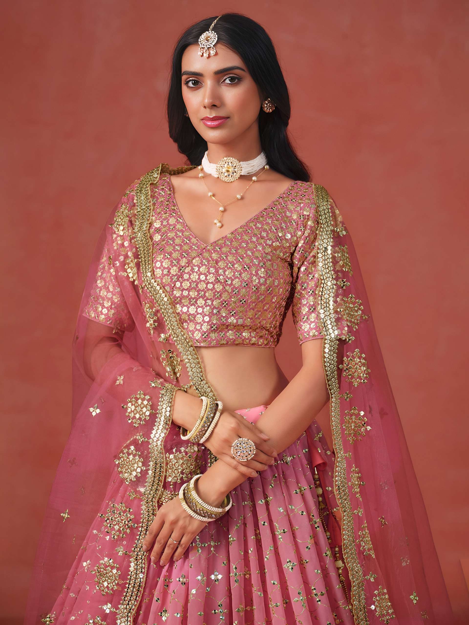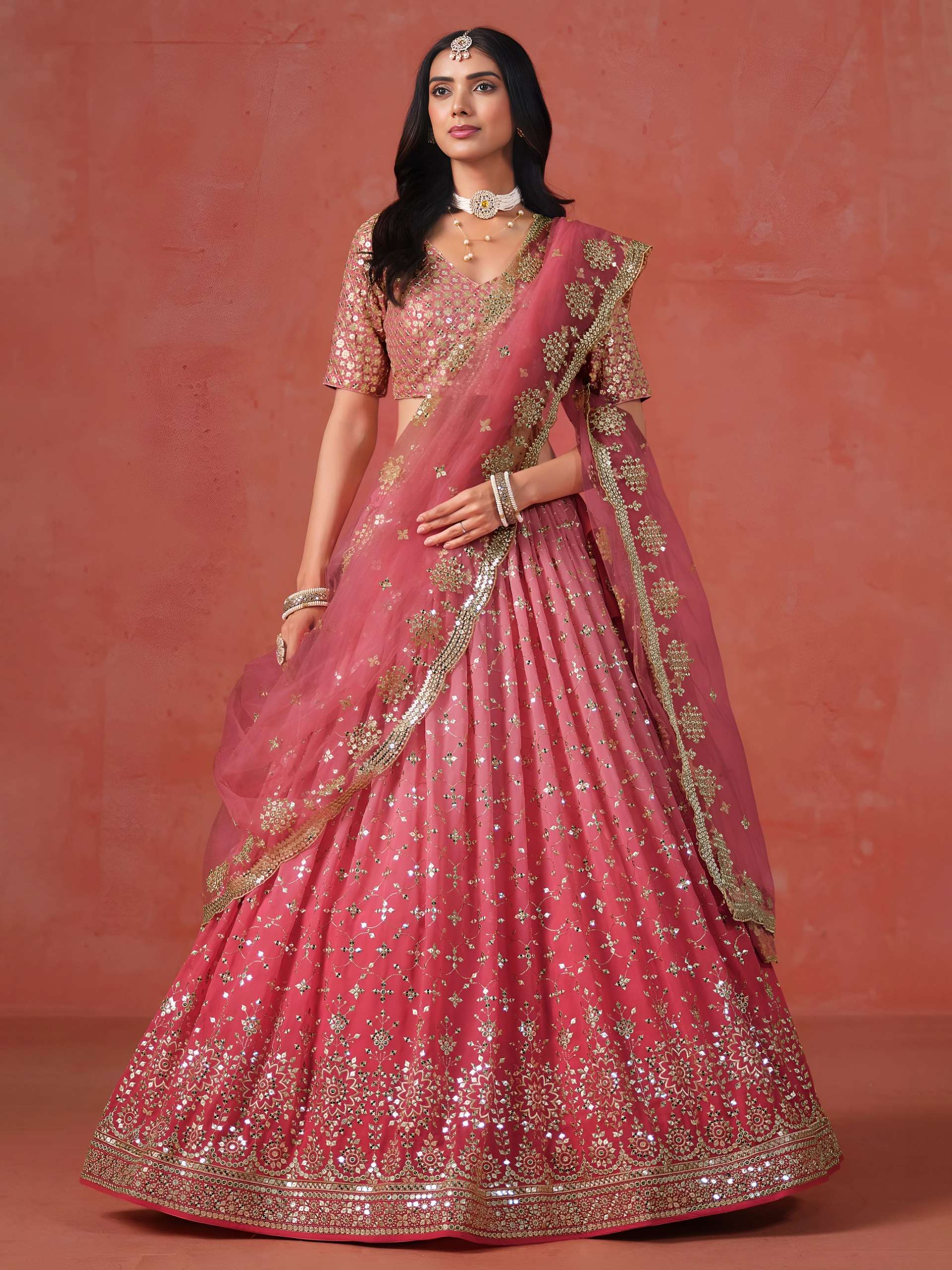 *Lehenga:* The Georgette Ombre lehenga features a beautiful gradient from soft peach to deeper pink, richly decorated with floral and geometric embroidery in sequins and zari for a sparkling, festive look.