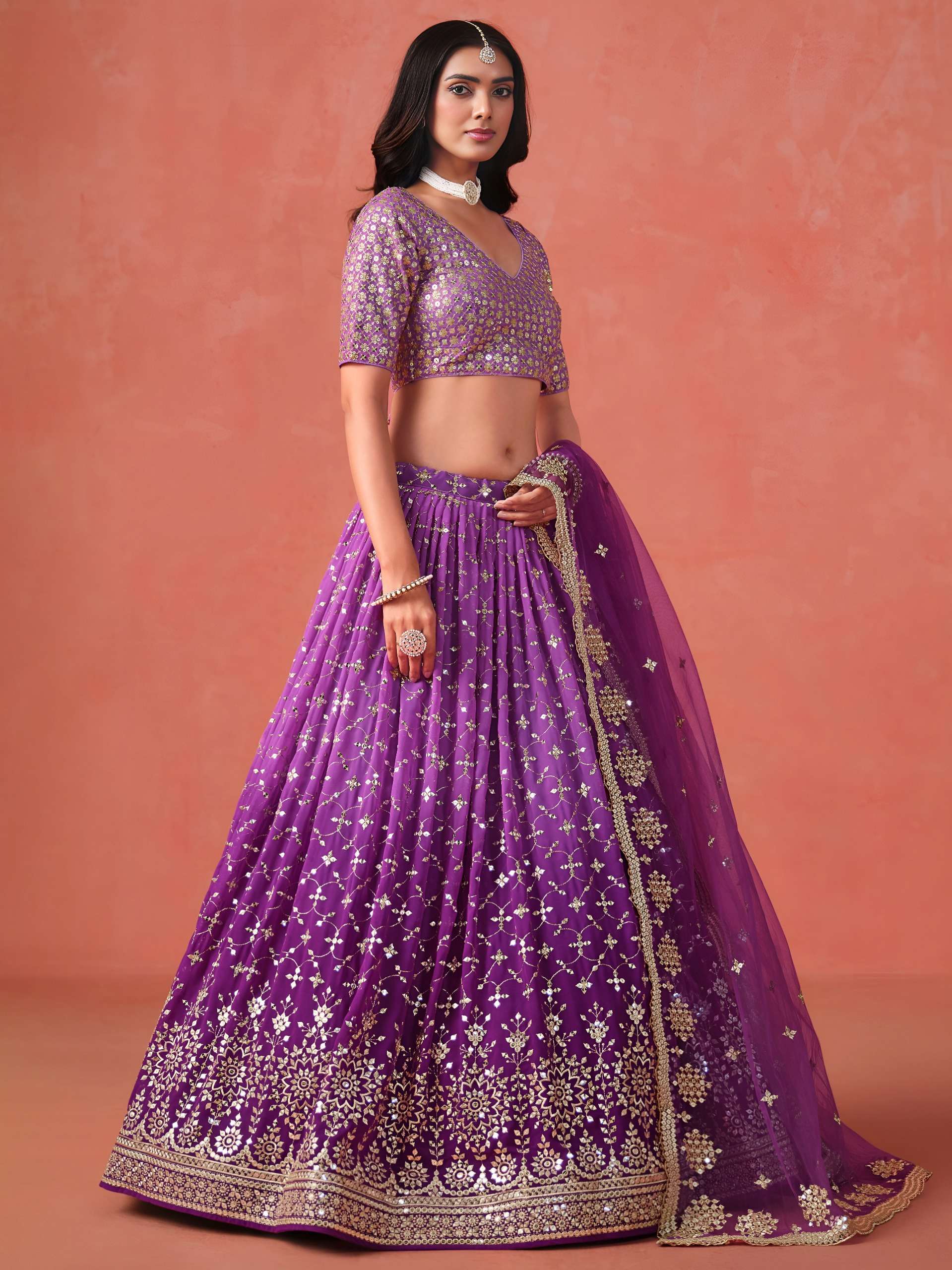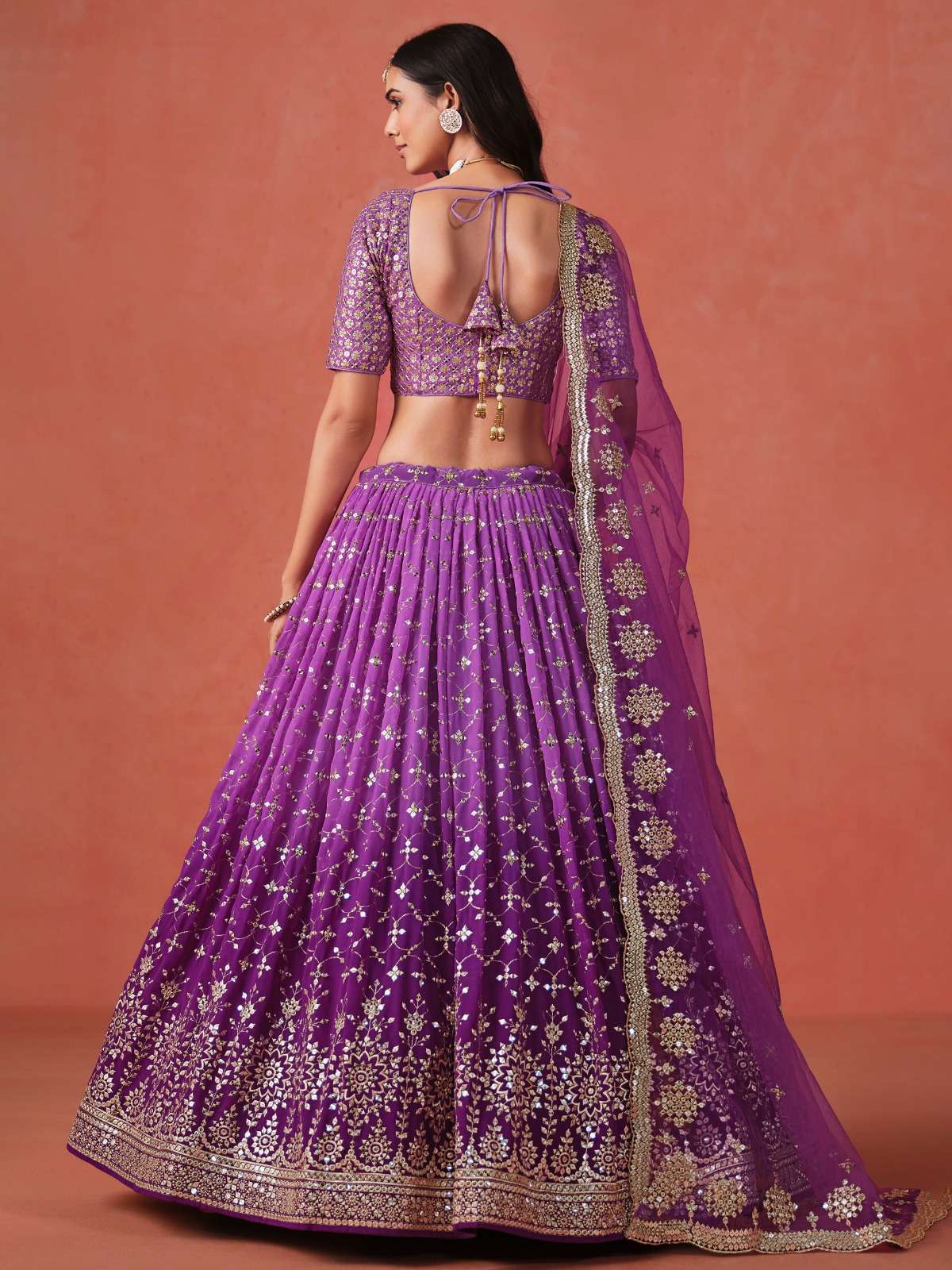 *Lehenga:* The Georgette Ombre flared purple lehenga is adorned with all-over zari, sequins, and thread embroidery in intricate floral and geometric patterns, creating a luxurious and radiant look.