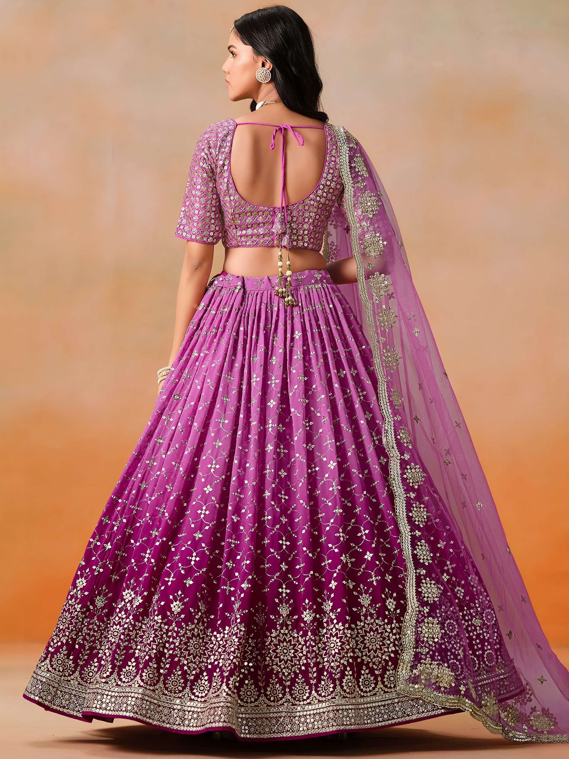 *Lehenga:* The Georgette Ombre lehenga is in a rich rani pink shade, crafted from flowy fabric and adorned with intricate silver zari and sequins embroidery. The embroidery pattern includes traditional floral and geometric motifs that intensify near the hem, creating a regal and grand look.