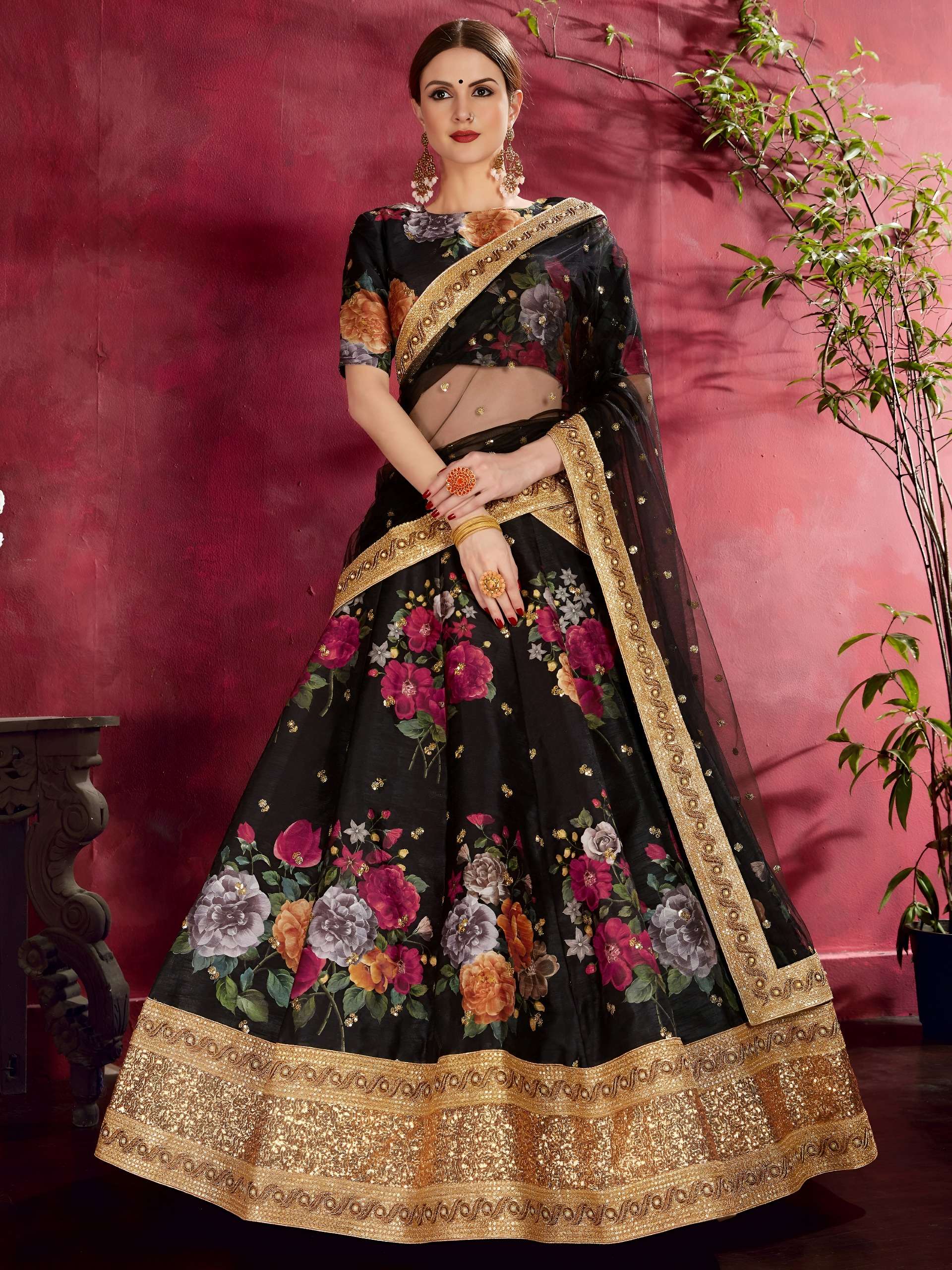 This stunning black lehenga set features vibrant floral prints paired with a matching blouse and a graceful net dupatta 🌸✨. The rich golden embroidered border and delicate sequin detailing create a perfect blend of elegance and festive charm, making it ideal for weddings and special celebrations.