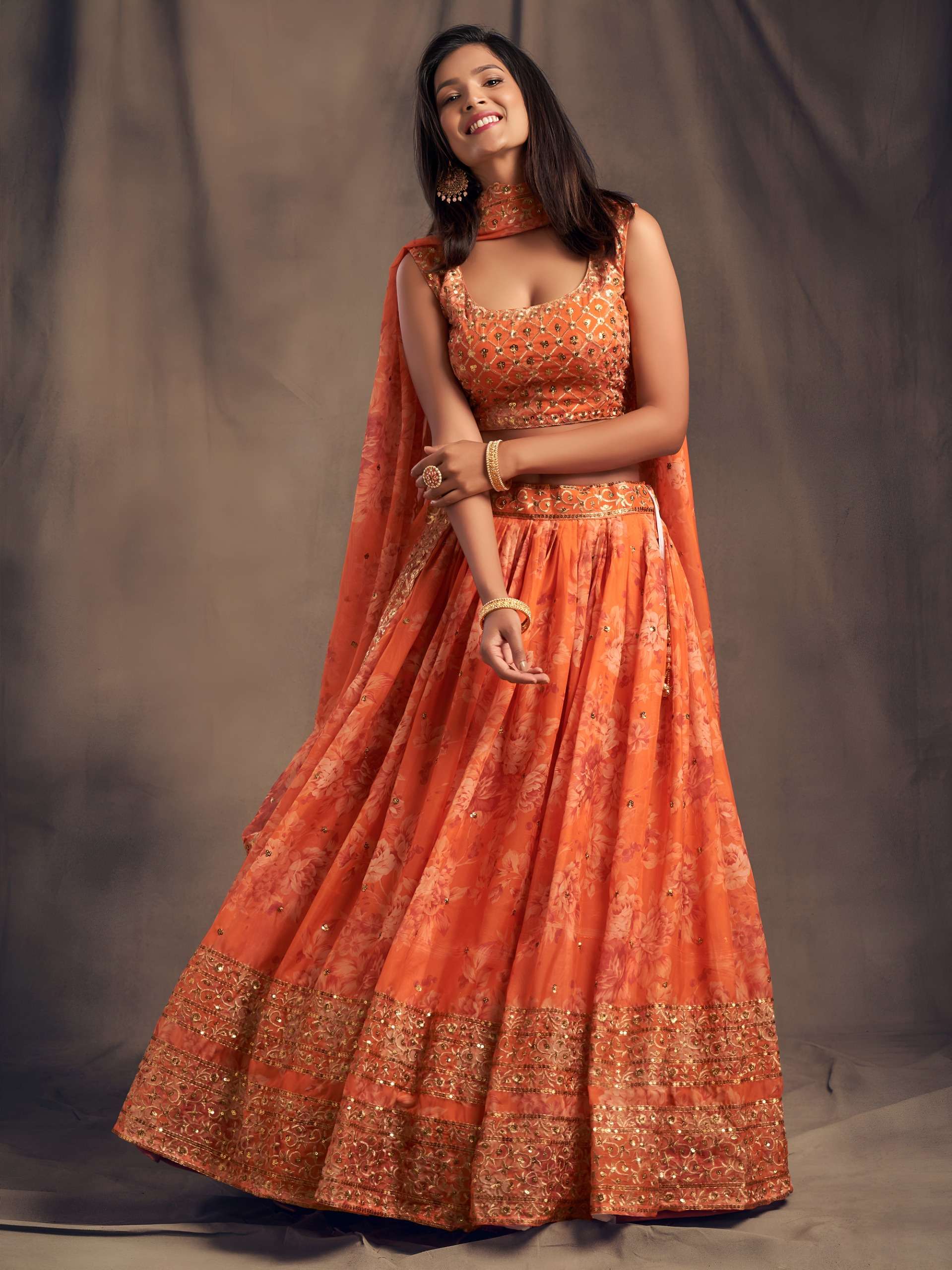 🧡 *Orange Floral Printed Designer Lehenga Choli* ✨ Wedding • Graceful • Special Occasions 🌟