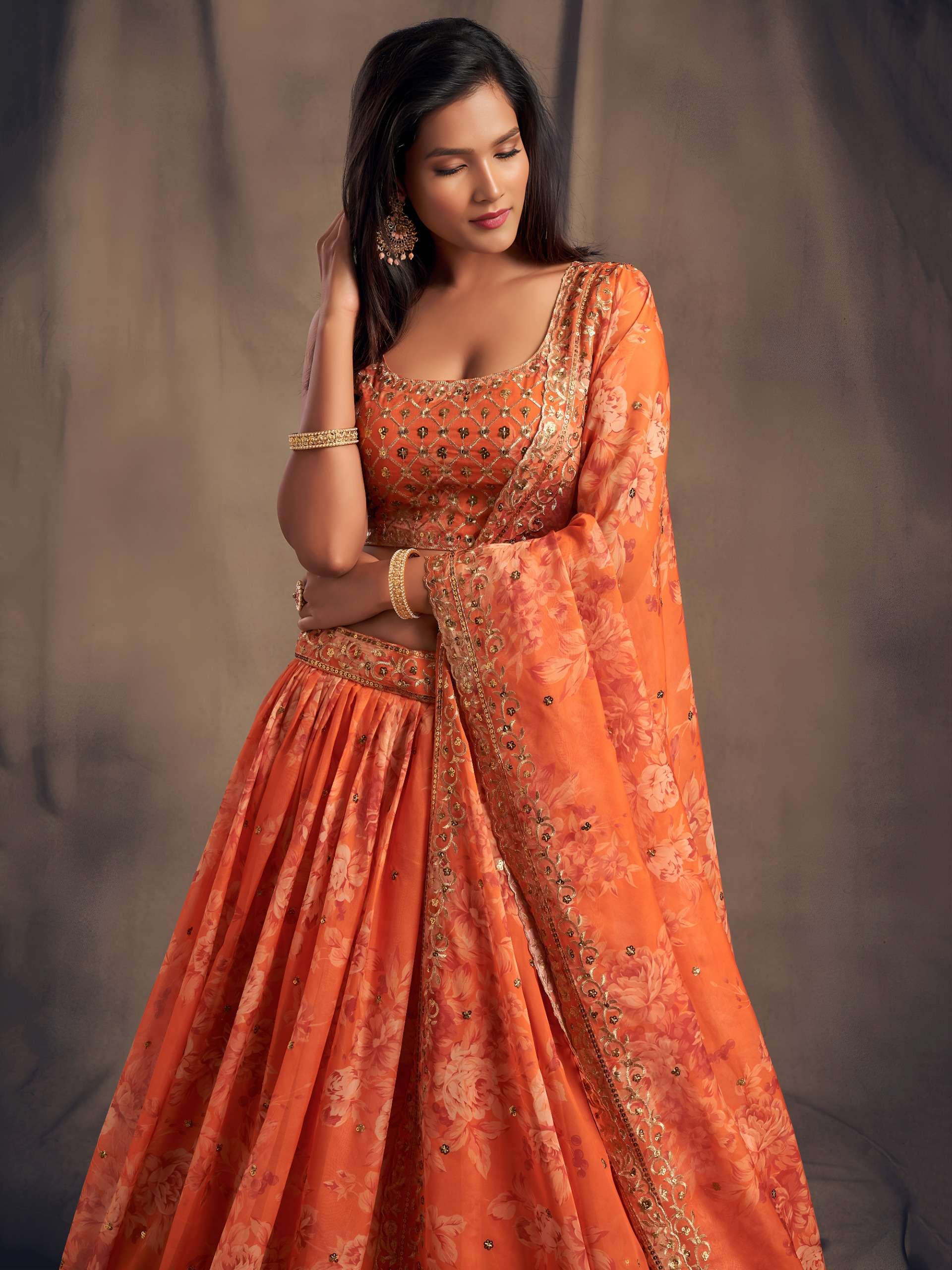 This orange floral printed lehenga choli blends vibrant color with intricate craftsmanship 🧡✨. Paired with a matching blouse and dupatta, it creates a stunning festive and wedding-ready look.