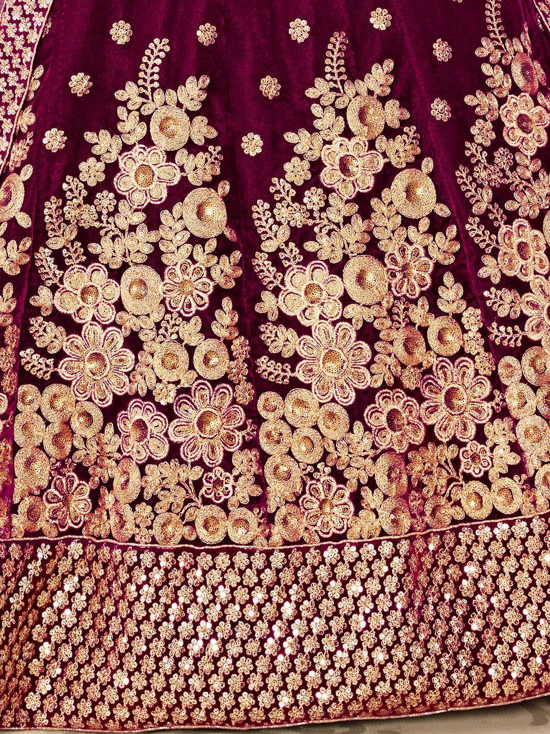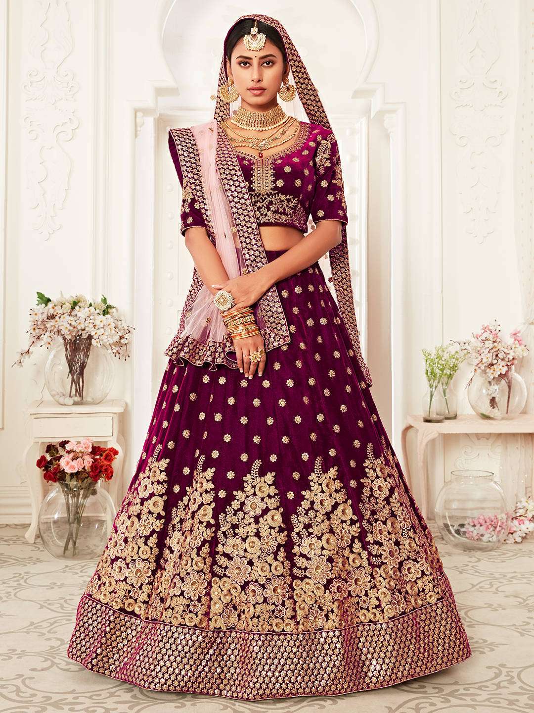 Look divine on your special day by wearing this purple colour velvet bridal lehenga Choli. Eye-catching and figure accentuating embellished in richly crafted with Thread, Dori & Sequins embroidered work. The Blouse is also of matching velvet fabric with embroidered work and an embellished light pink colour net dupatta.
