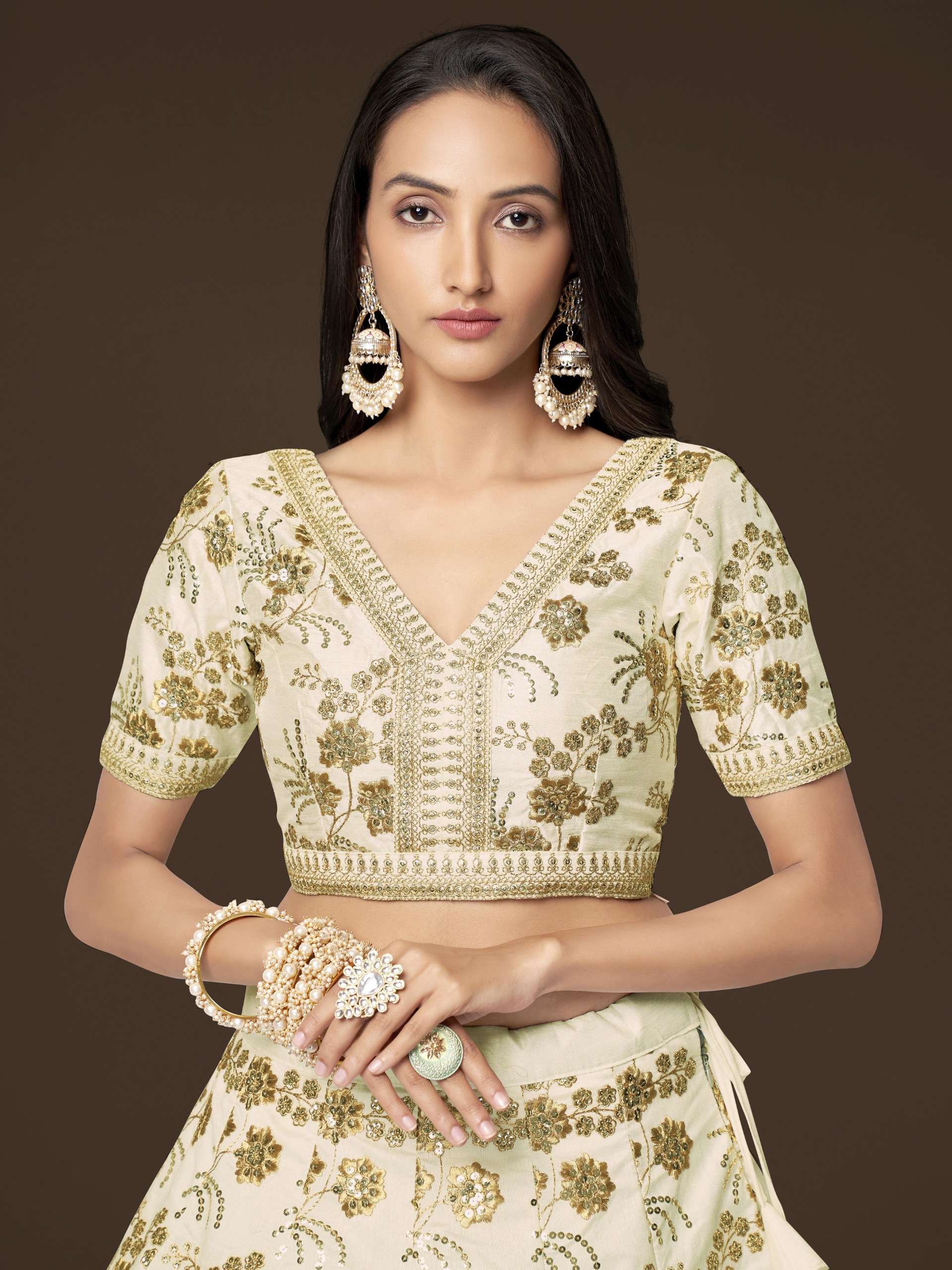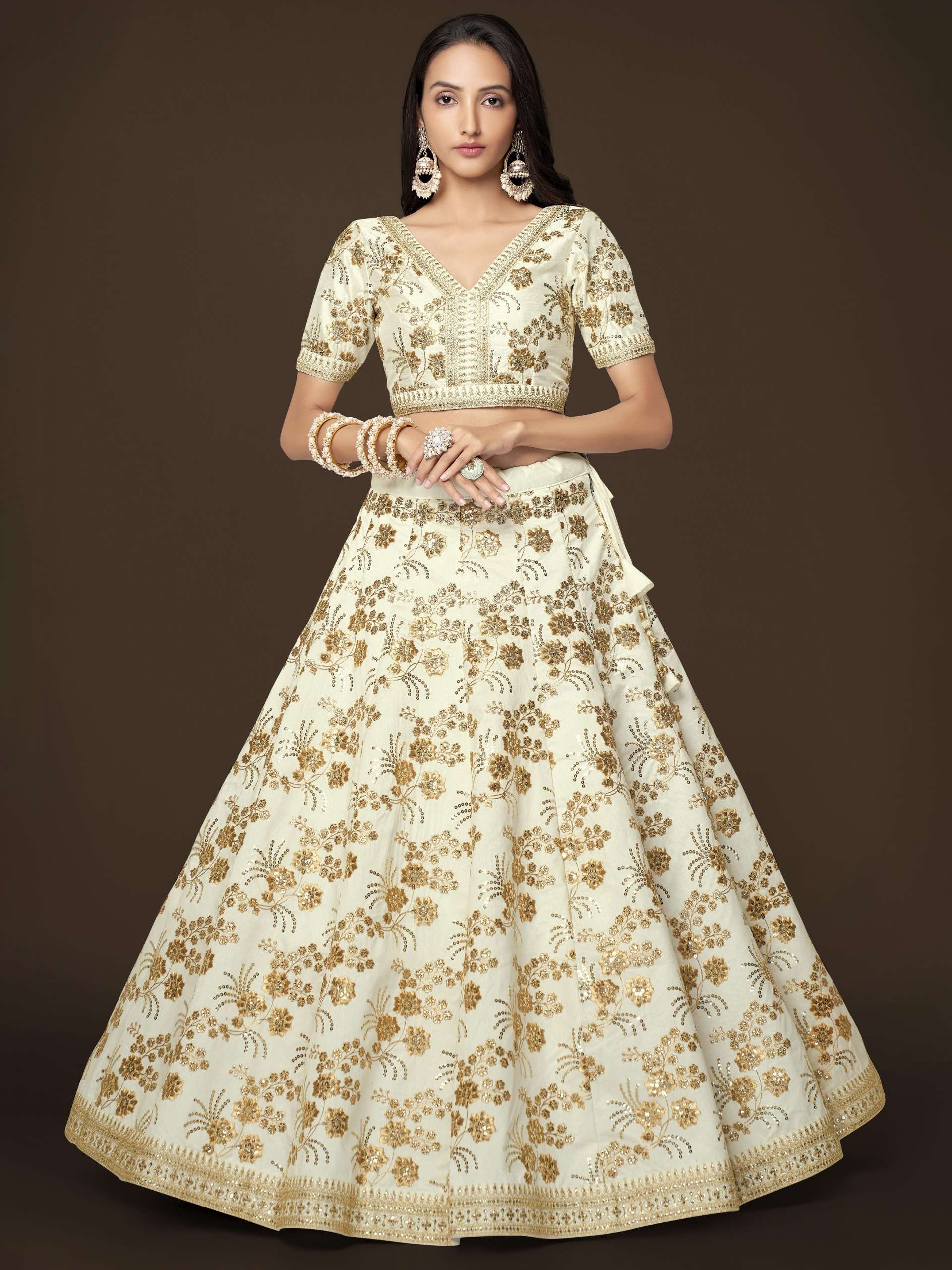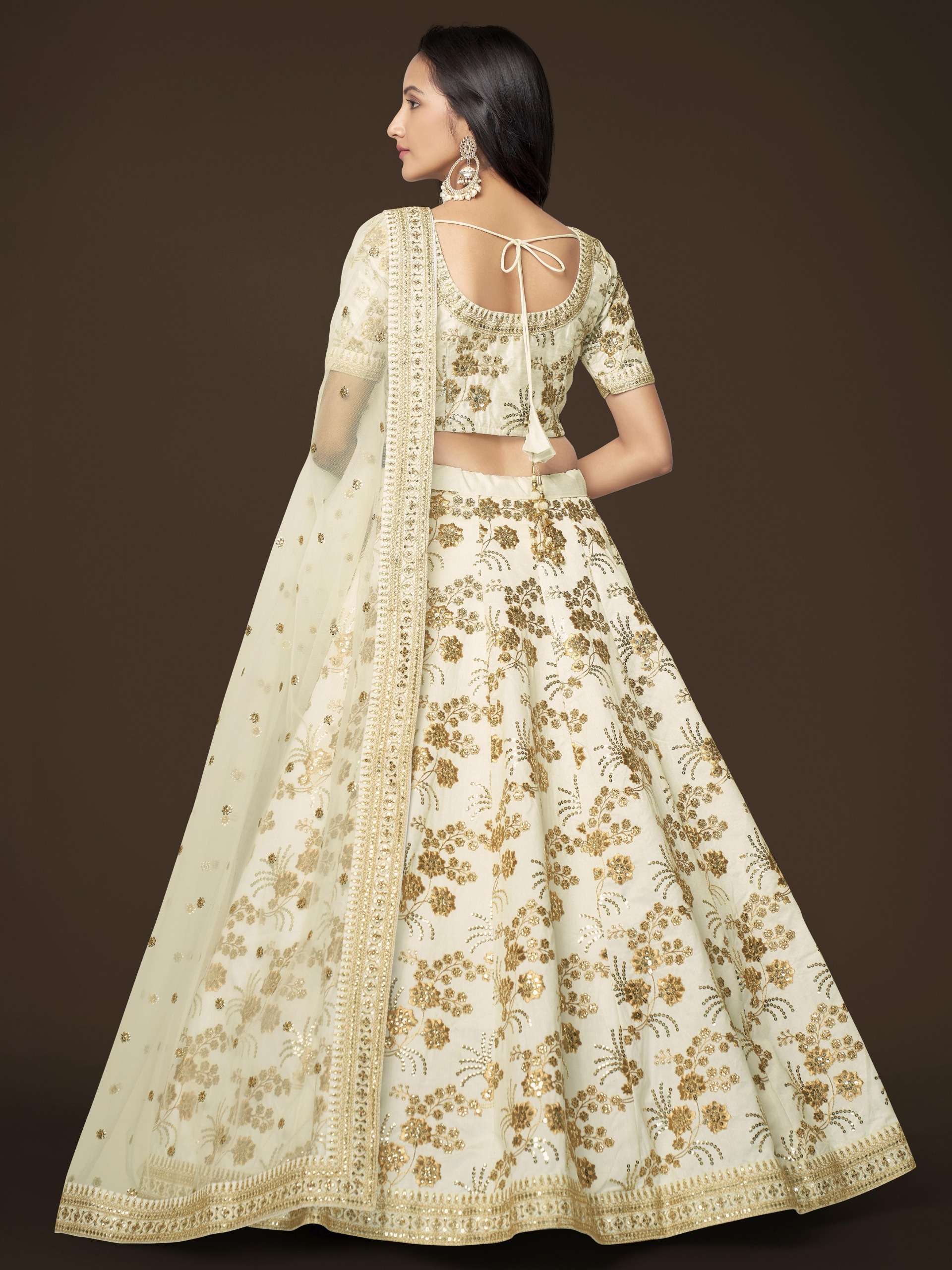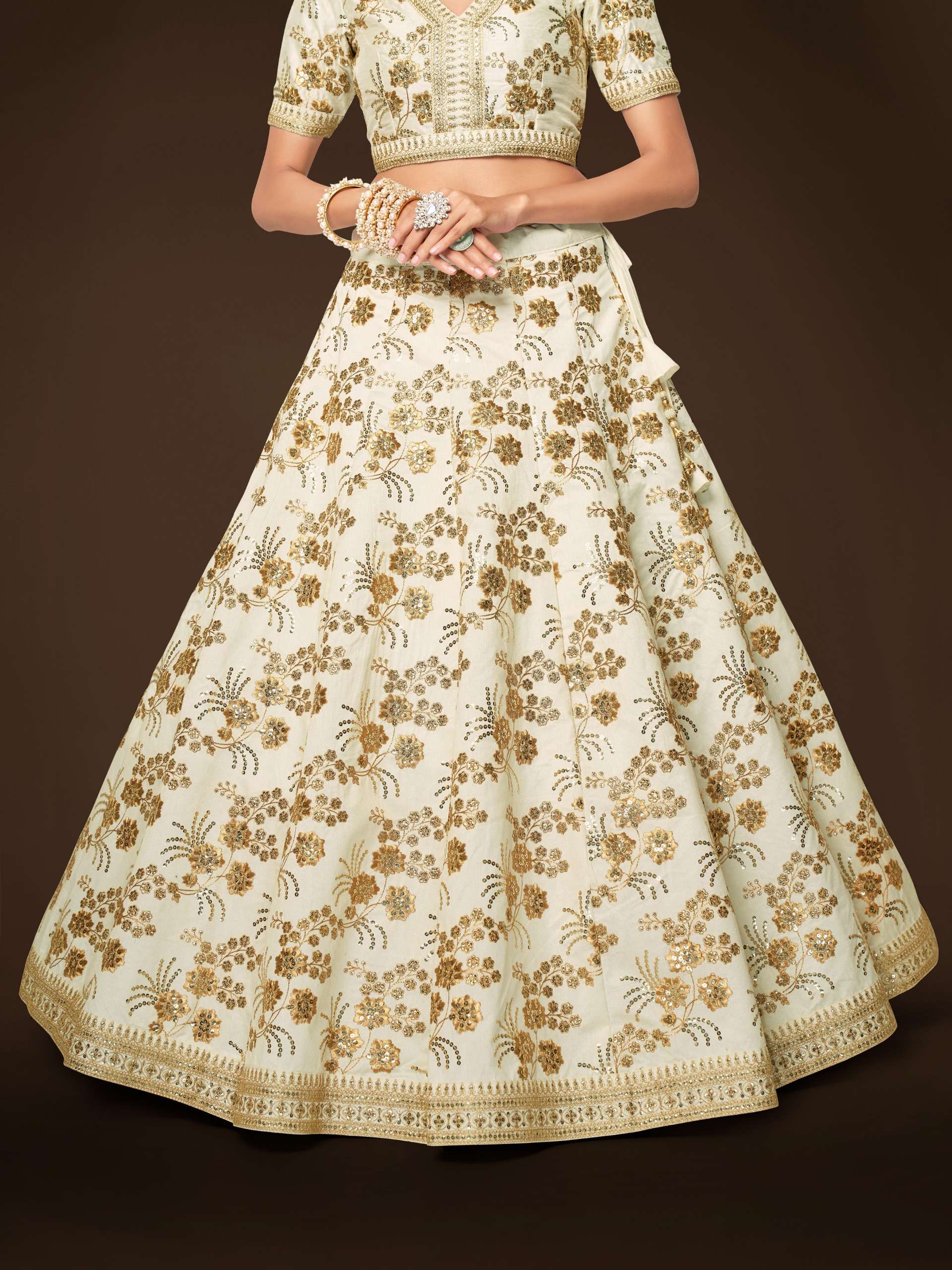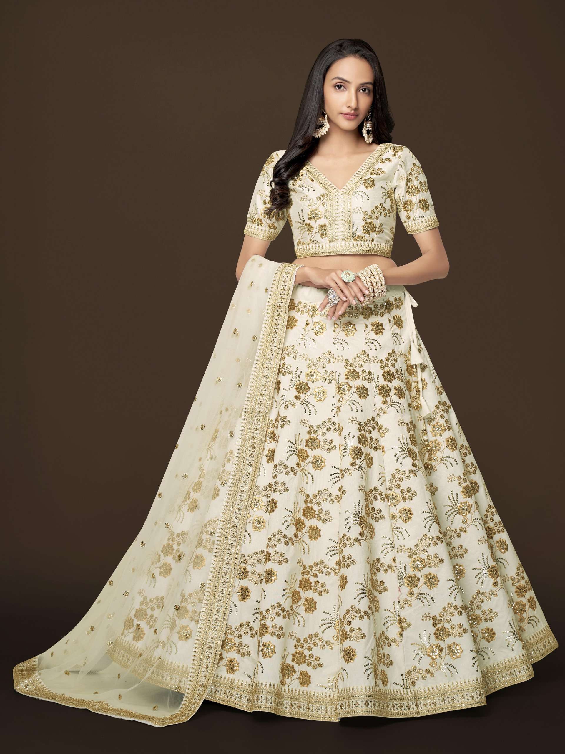Look like a gorgeous diva in this graceful white color lehenga made of slub silk material embellished with dori work, zari sequin work, and embroidery work.