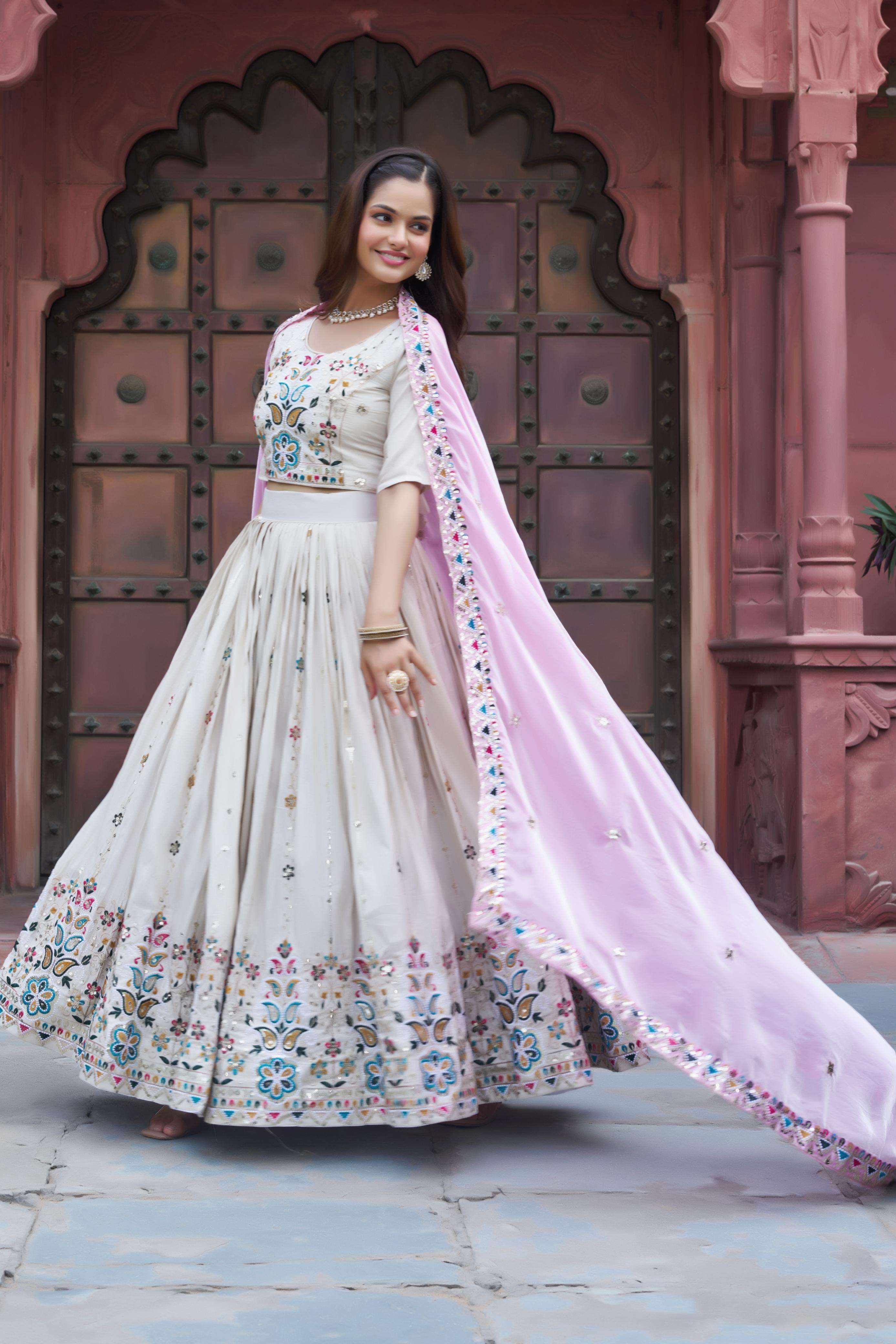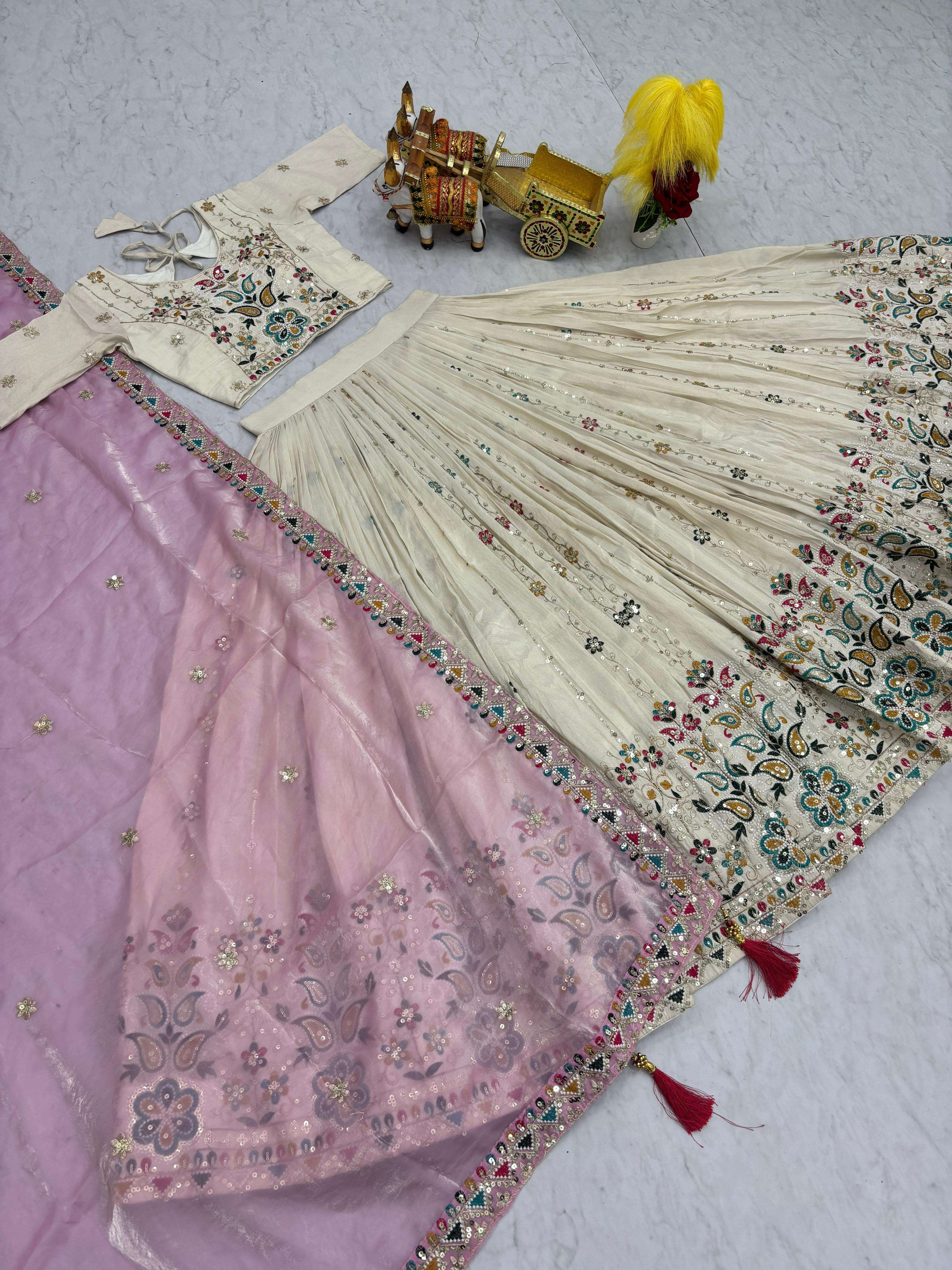 👉**👗Lehenga👗**👈 *Fabric:-* Pure Tissue silk *Inner:-* Micro Cotton *Work:-* Heavy Embroidery Sequence & Thred Work *Flair:-* 3.50 Meter *Attached Canvas and Cancan* *With DORI* *Size:-* 44 *(Full-Stitched)*