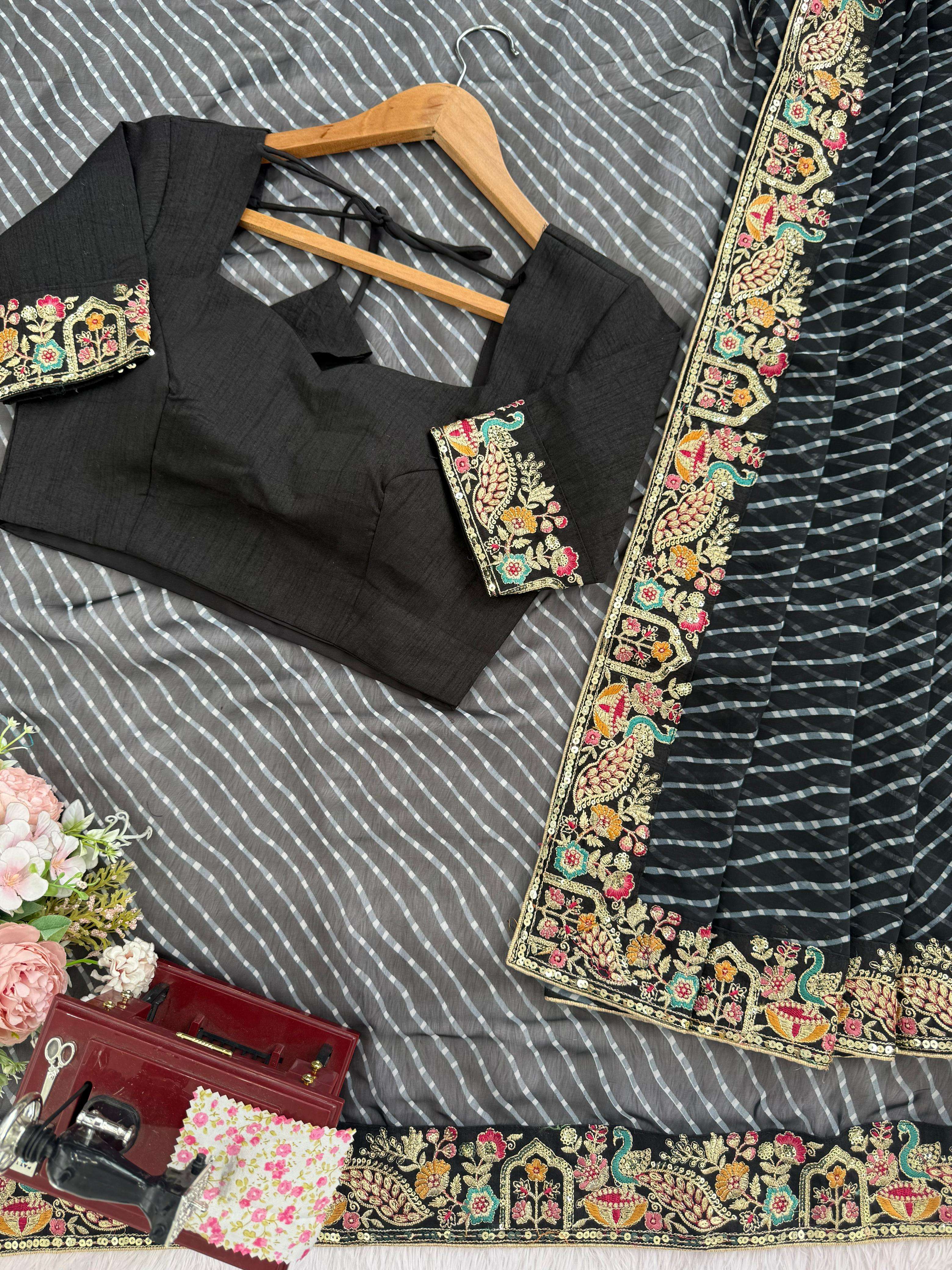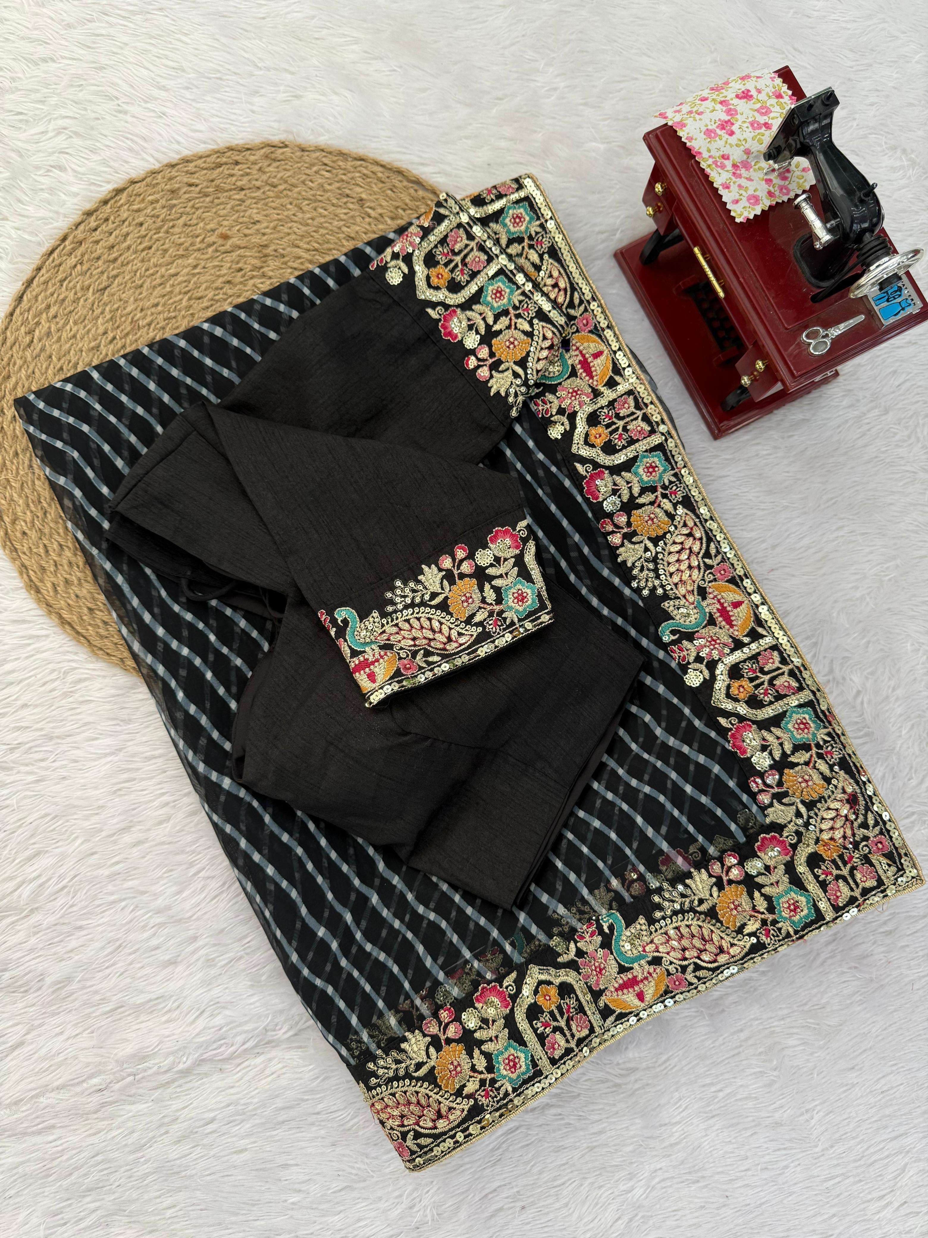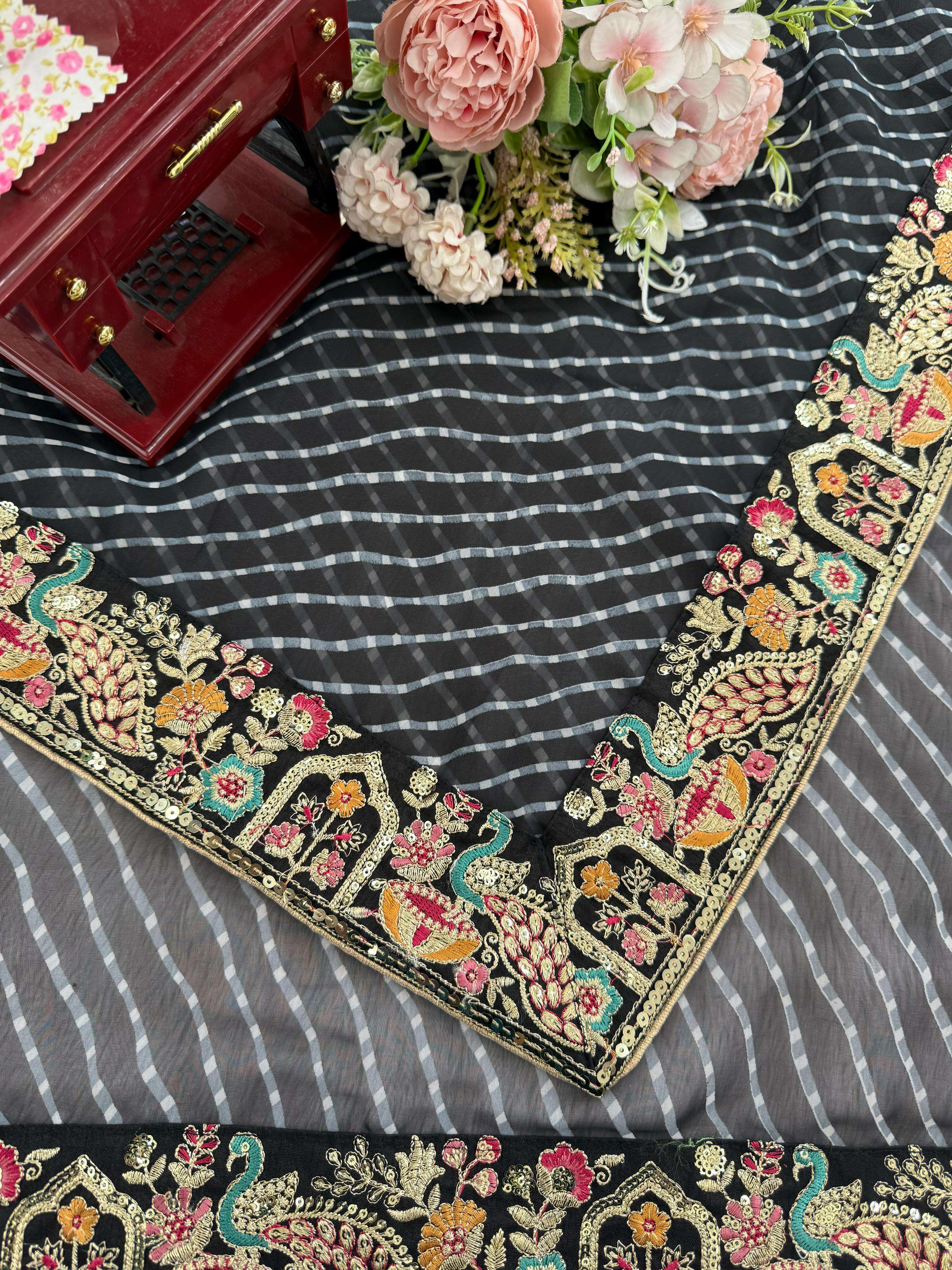 ⸻ 💃🏻 *SAREE DETAILS* • *Fabric*: Faux Georgette • *Work*: Elegant Thred & Sequins Embroidery With Badhani Print • *Cut*: 5.5M • *Weight*: Approx. 850 Grams