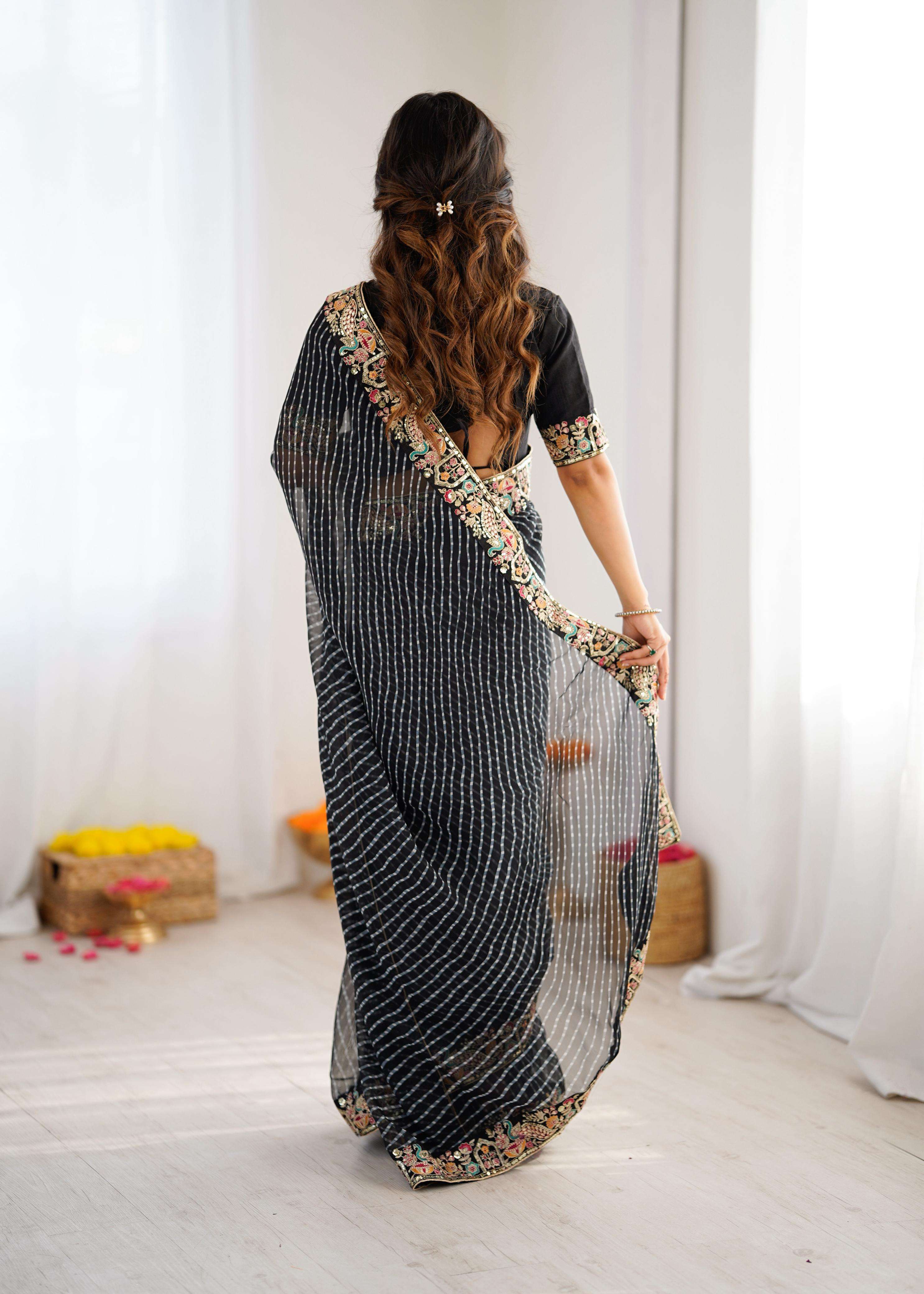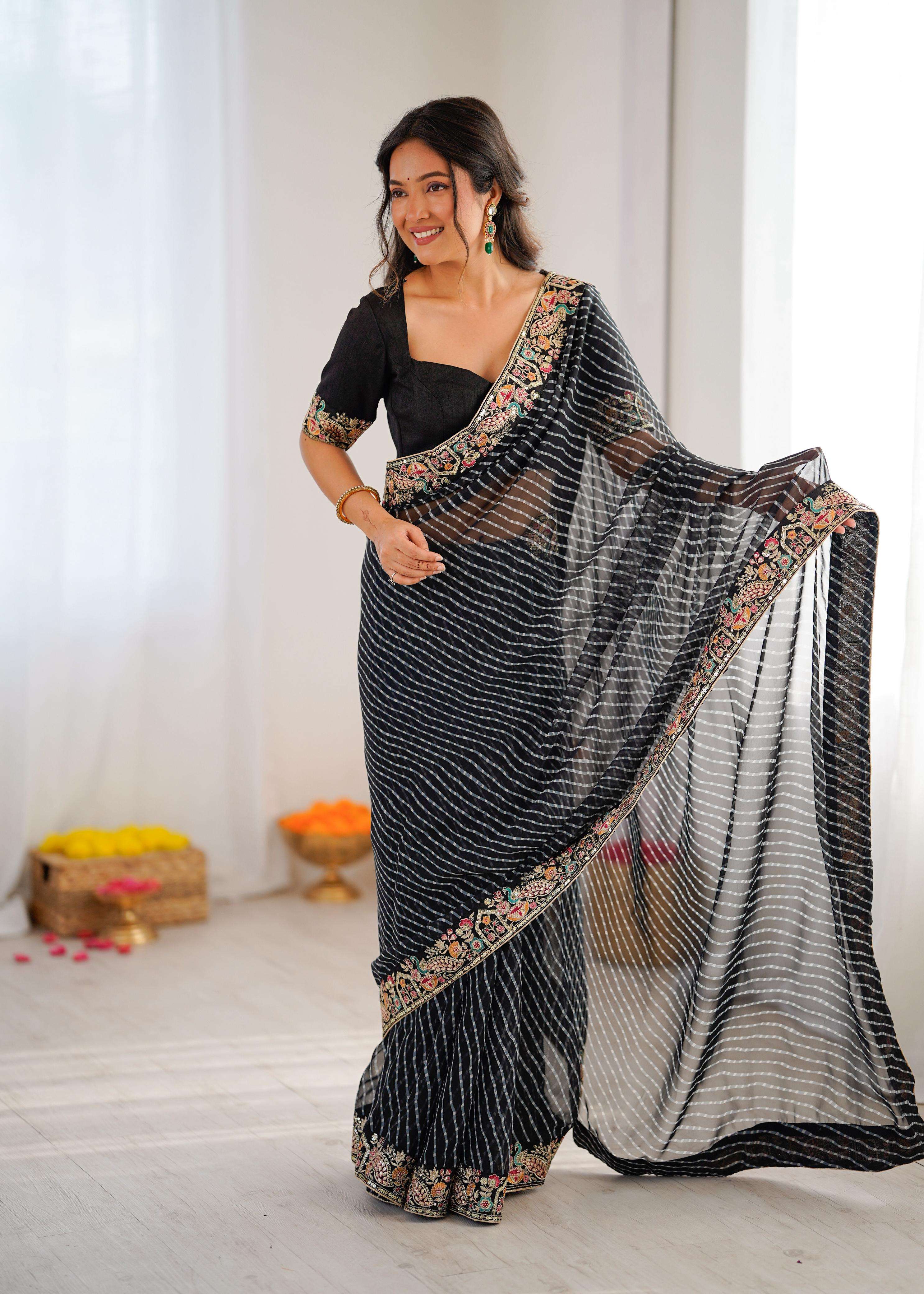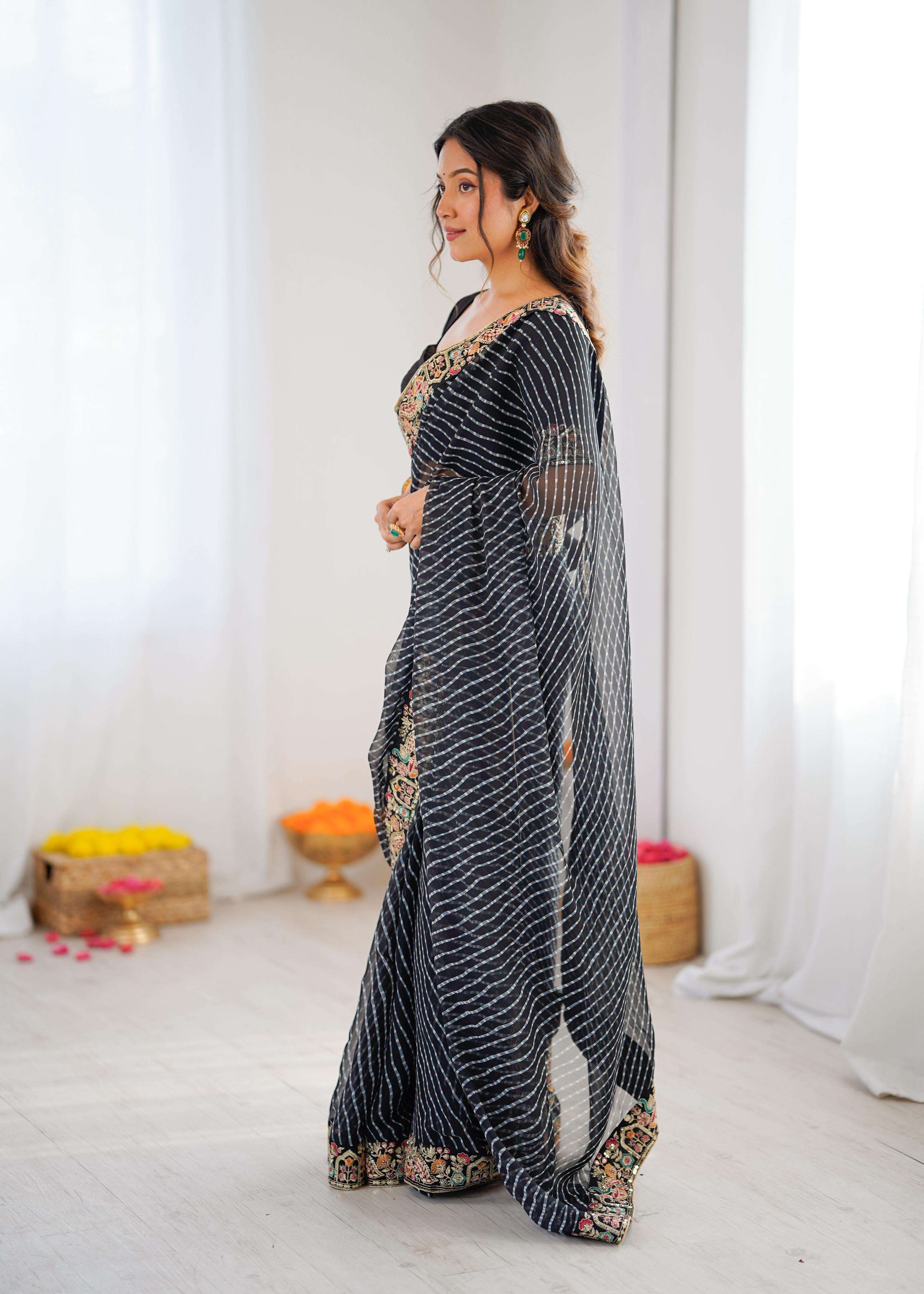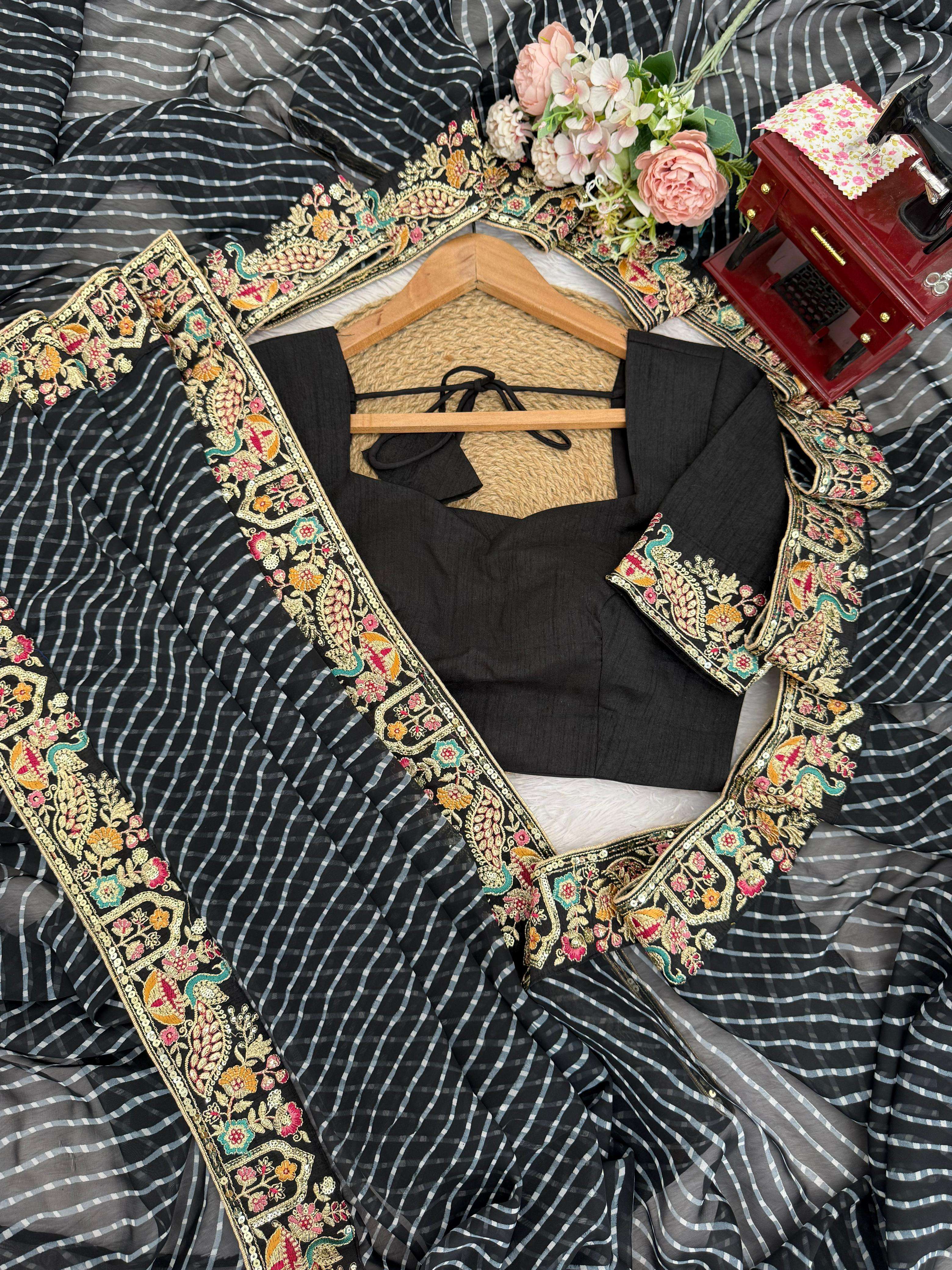 ⸻ 💃🏻 *SAREE DETAILS* • *Fabric*: Faux Georgette • *Work*: Elegant Thred & Sequins Embroidery With Badhani Print • *Cut*: 5.5M • *Weight*: Approx. 850 Grams