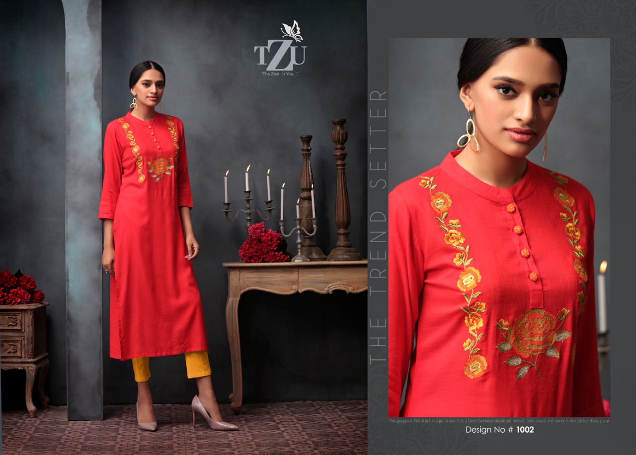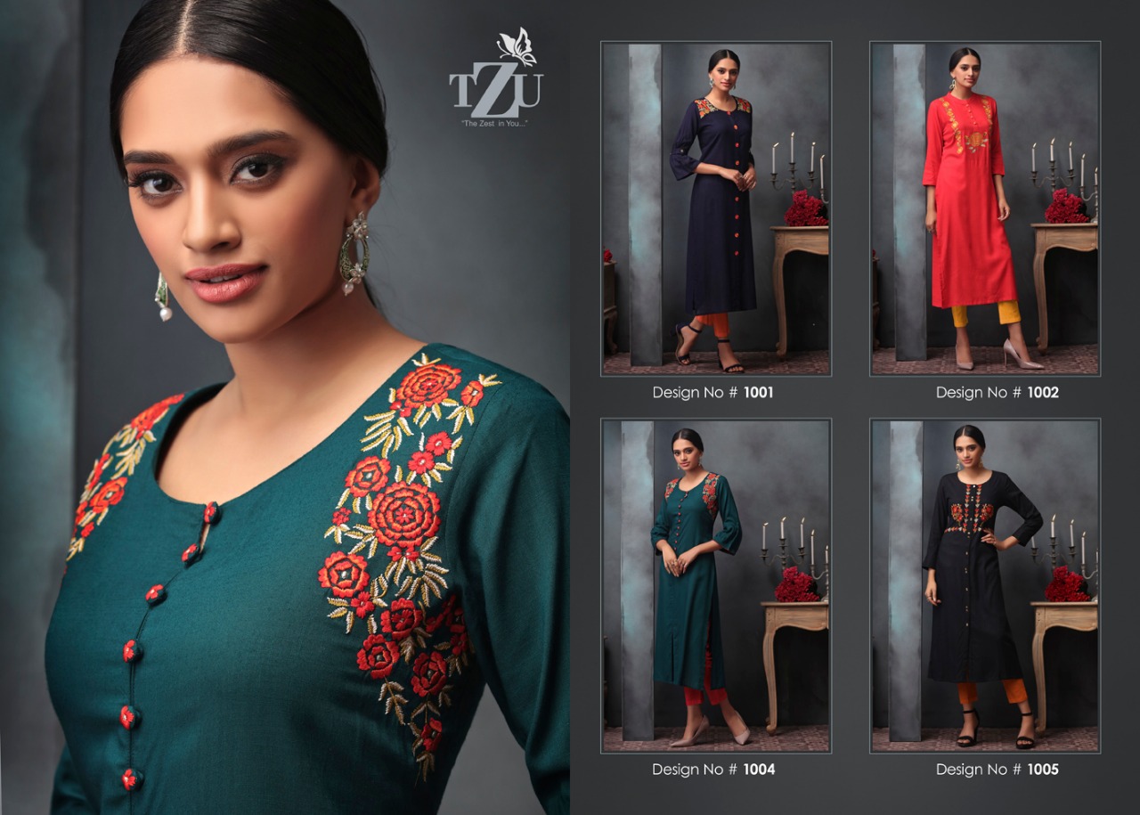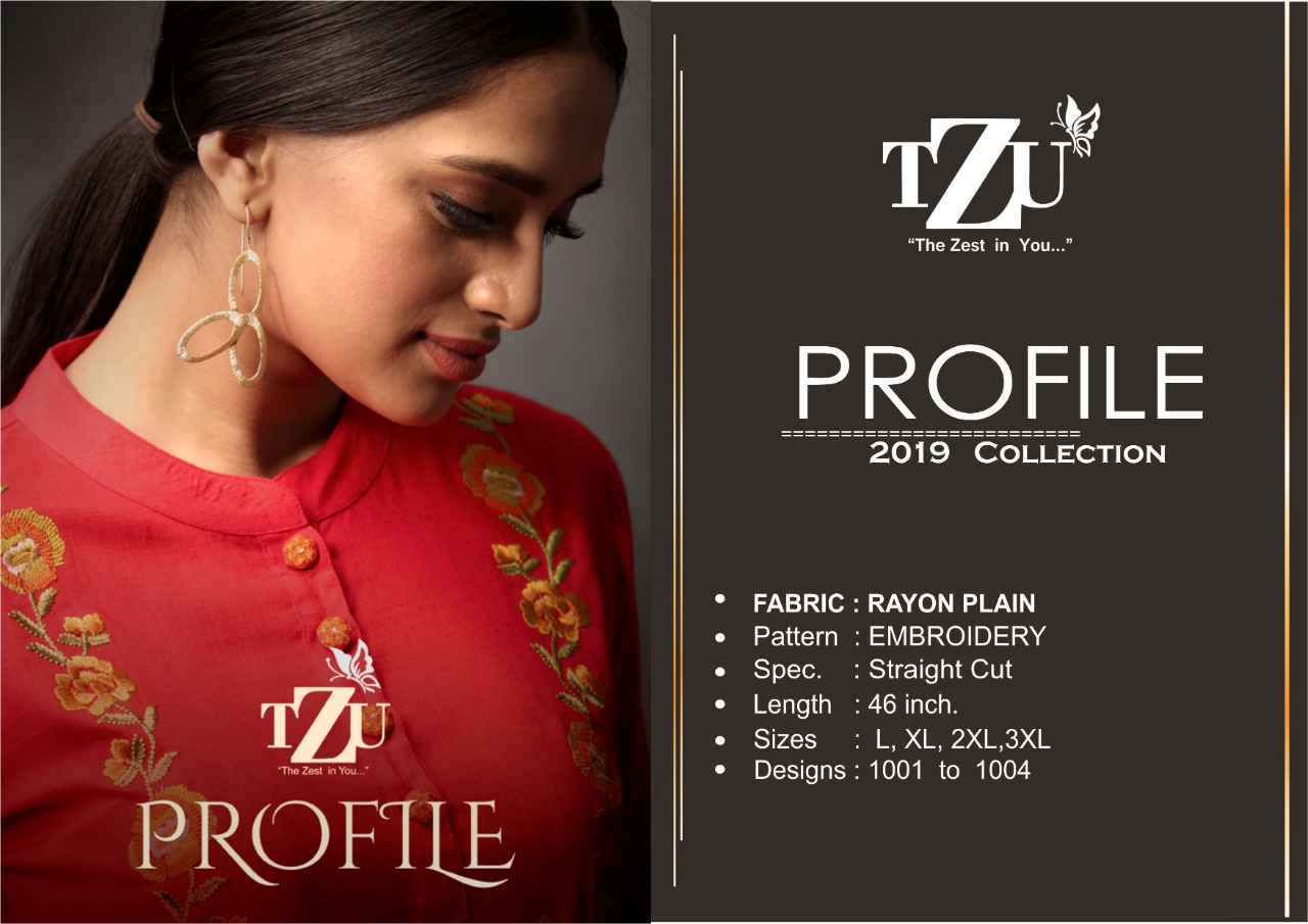 Buy Online Profile By Tzu Lifestyle 1001 Series Fancy Designer Reyon Embroidery Kurti Collection Wholesaler Surat 4 Pcs of Full Catalogue at Wholesale Price. Looking for Profile By Tzu Lifestyle 1001 Series Fancy Designer Reyon Embroidery Kurti Collection Wholesaler Surat Full Catalouge at Best Price? Buy Now Profile By Tzu Lifestyle 1001 Series Fancy Designer Reyon Embroidery Kurti Collection Wholesaler Surat at Wholesale Rate of Rs 2980 with Total 4 Pcs from authroized dealer and supplier of Brand. Cost of Each piece is just only Rs 745 which is very low and affordable price to resale the product in your retail store ,This is Surat based Wholesale Supplier & Dealer of Brand. Click on Brand name to Know more about Brand's products.Call or Whatsapp on 9898838984 for booking or enquiry