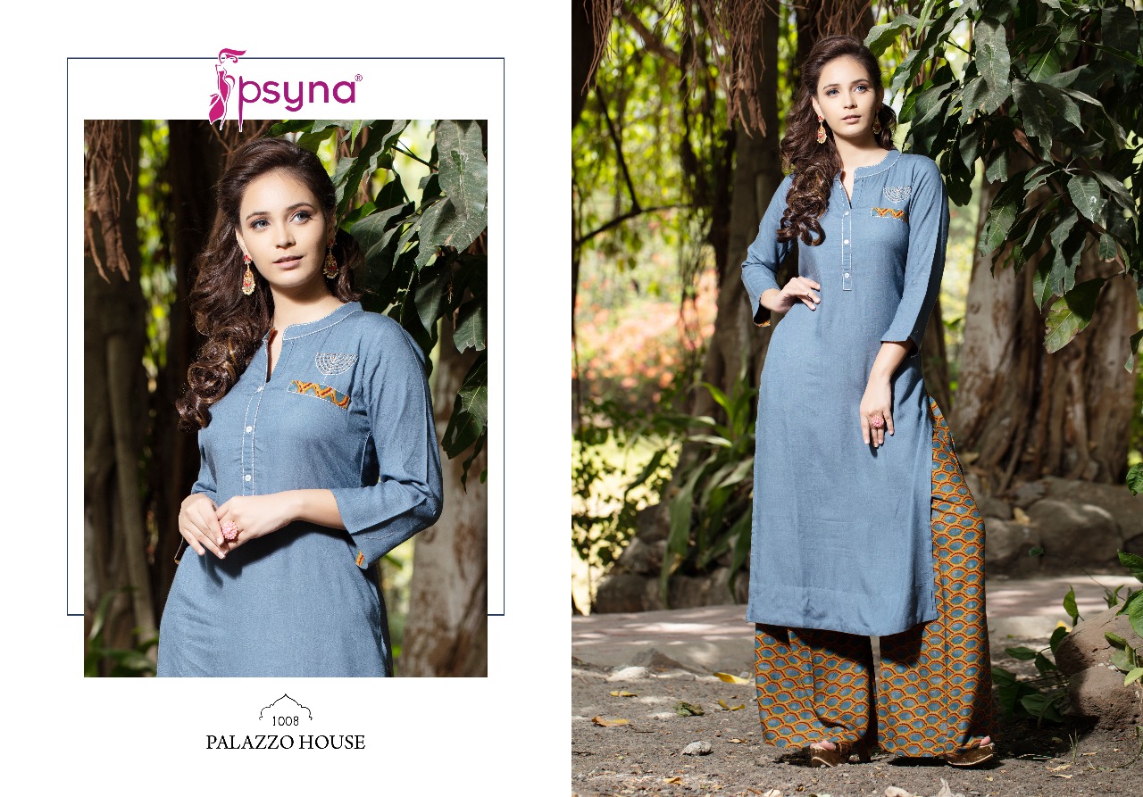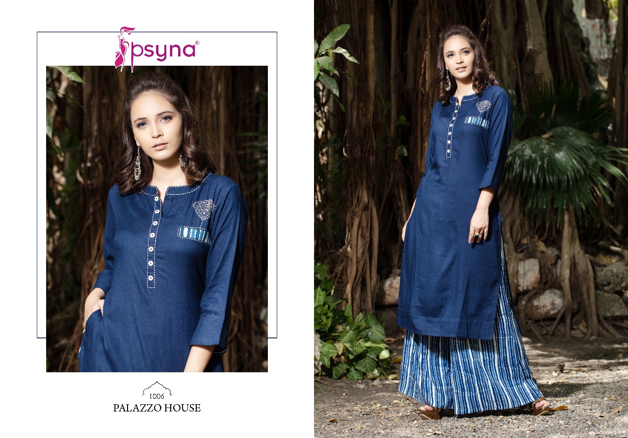 Buy Online Psyna Palazzo House Full Stitched Kurti And Palazzo Wholesale Supplier 10 Pcs of Full Catalogue at Wholesale Price. Looking for Psyna Palazzo House Full Stitched Kurti And Palazzo Wholesale Supplier Full Catalouge at Best Price? Buy Now Psyna Palazzo House Full Stitched Kurti And Palazzo Wholesale Supplier at Wholesale Rate of Rs 7500 with Total 10 Pcs from authroized dealer and supplier of PSYNA Brand. Cost of Each piece is just only Rs 750 which is very low and affordable price to resale the product in your retail store ,This is Surat based Wholesale Supplier & Dealer of PSYNA Brand. Click on Brand name to Know more about PSYNA Brand's products.Call or Whatsapp on 9898838984 for booking or enquiry