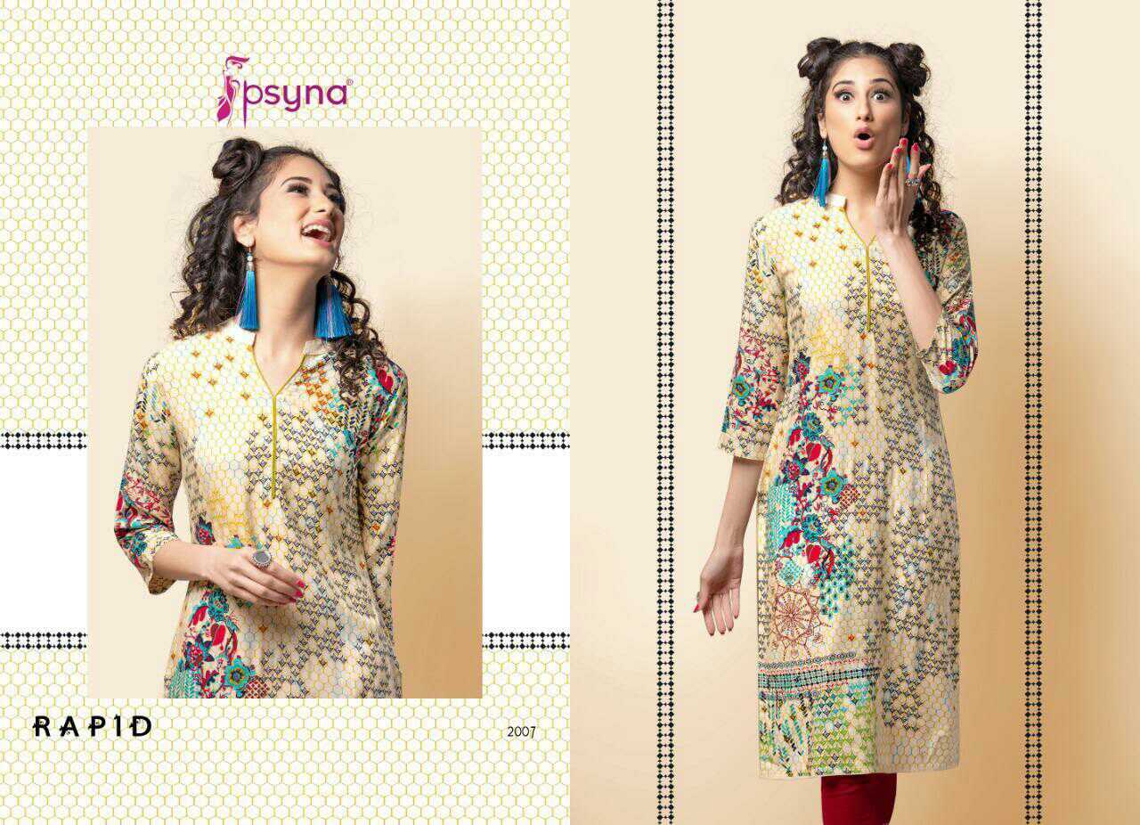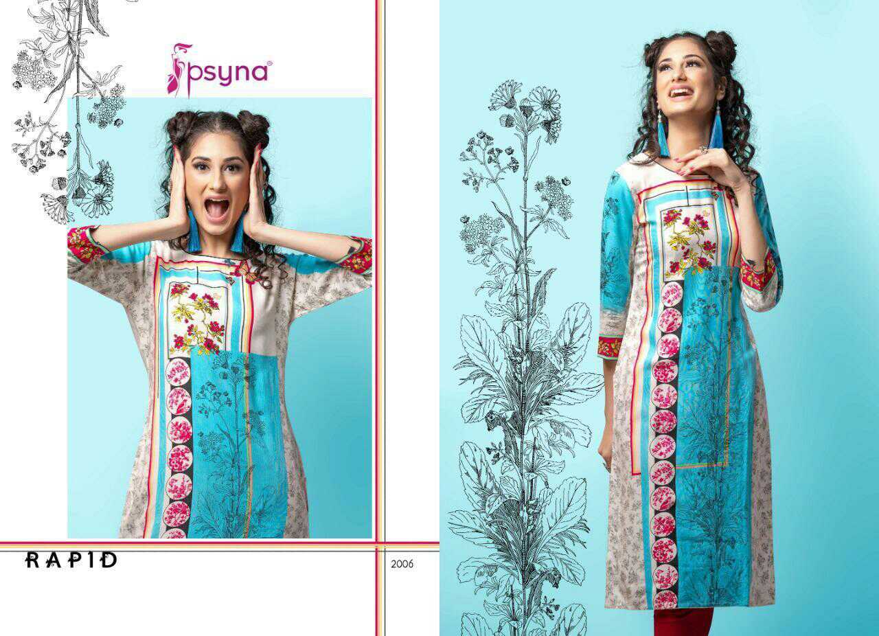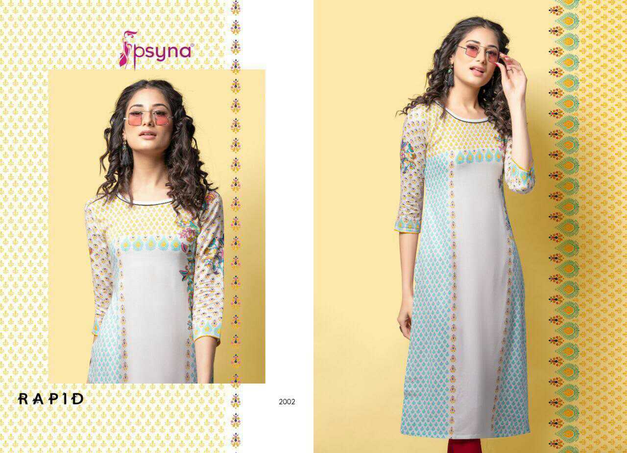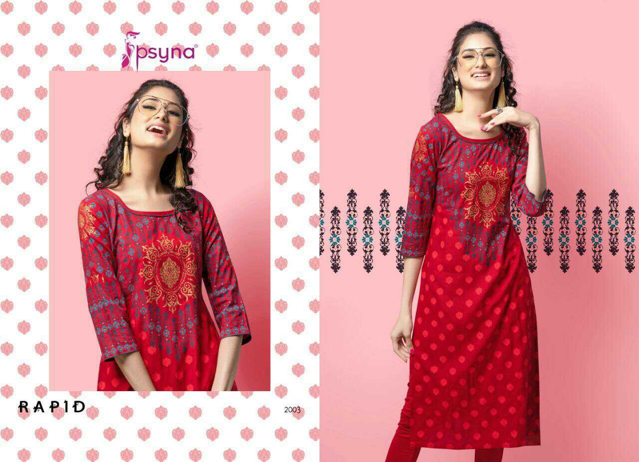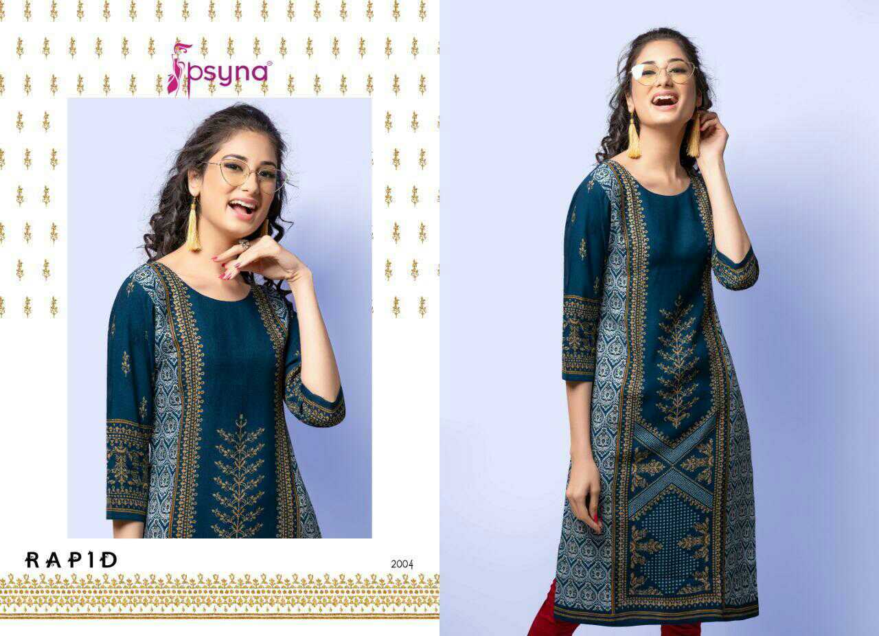 Buy Online Psyna Rapid 2 Reyon Kurtis Wholesale Supplier Gujarat 9 Pcs of Full Catalogue at Wholesale Price. Looking for Psyna Rapid 2 Reyon Kurtis Wholesale Supplier Gujarat Full Catalouge at Best Price? Buy Now Psyna Rapid 2 Reyon Kurtis Wholesale Supplier Gujarat at Wholesale Rate of Rs 2997 with Total 9 Pcs from authroized dealer and supplier of PSYNA Brand. Cost of Each piece is just only Rs 333 which is very low and affordable price to resale the product in your retail store ,This is Surat based Wholesale Supplier & Dealer of PSYNA Brand. Click on Brand name to Know more about PSYNA Brand's products.Call or Whatsapp on 9898838984 for booking or enquiry