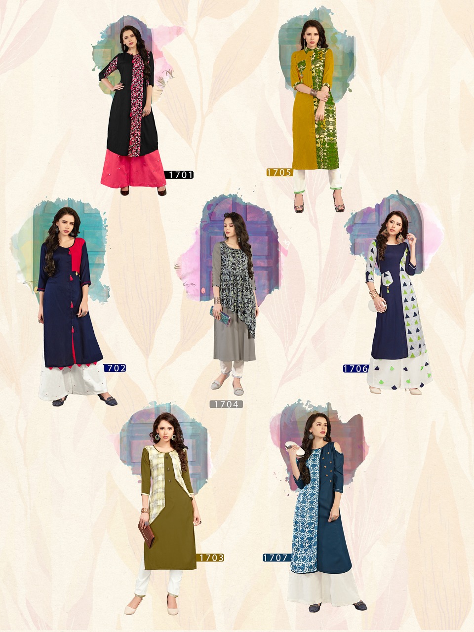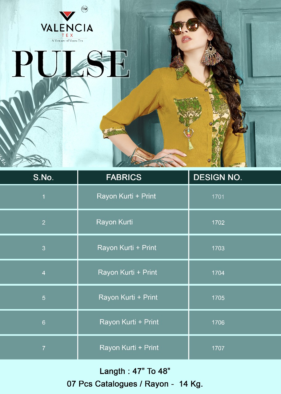 Buy Online Pulse By Valencia Reyon Printed Kurtis Catalog Wholesale Supplier And Dealer Gujarat 7 Pcs of Full Catalogue at Wholesale Price. Looking for Pulse By Valencia Reyon Printed Kurtis Catalog Wholesale Supplier And Dealer Gujarat Full Catalouge at Best Price? Buy Now Pulse By Valencia Reyon Printed Kurtis Catalog Wholesale Supplier And Dealer Gujarat at Wholesale Rate of Rs 2793 with Total 7 Pcs from authroized dealer and supplier of Valencia tex Brand. Cost of Each piece is just only Rs 399 which is very low and affordable price to resale the product in your retail store ,This is Surat based Wholesale Supplier & Dealer of Valencia tex Brand. Click on Brand name to Know more about Valencia tex Brand's products.Call or Whatsapp on 9898838984 for booking or enquiry