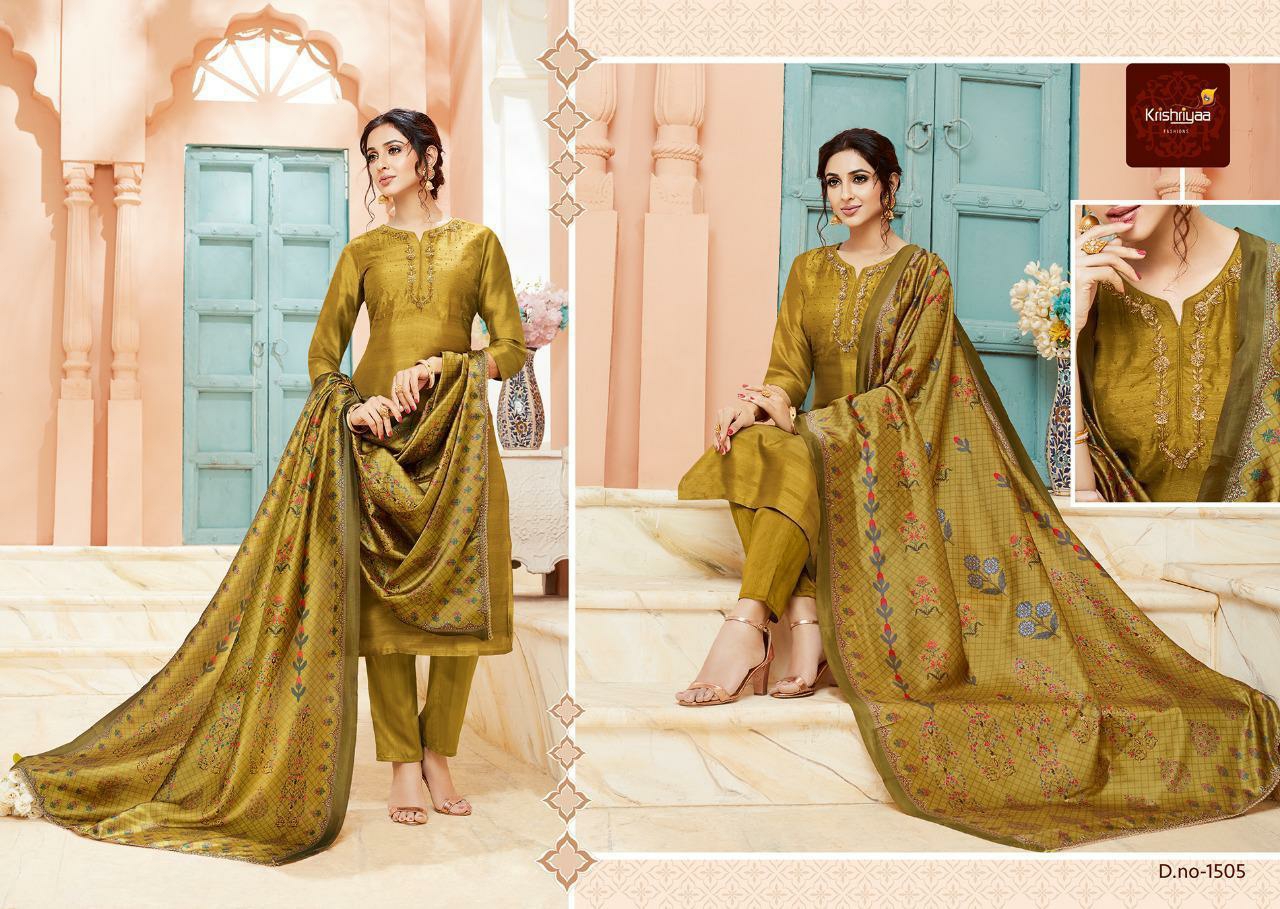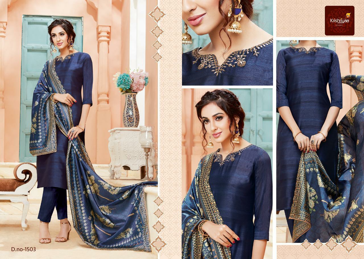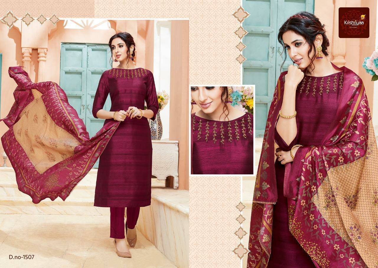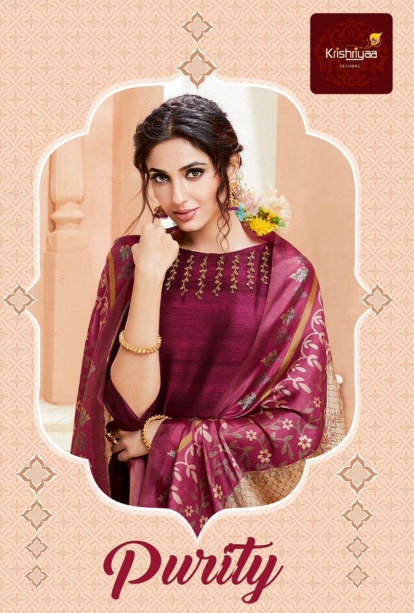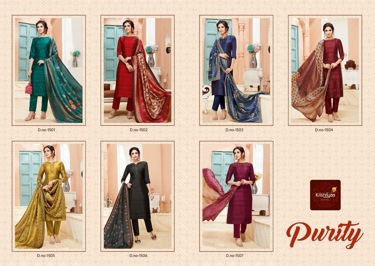Buy Online Purity By Krishriyaa Fashions Silk Designer Ready To Wear Suits Wholesale Supplier Surat 7 Pcs of Full Catalogue at Wholesale Price. Looking for Purity By Krishriyaa Fashions Silk Designer Ready To Wear Suits Wholesale Supplier Surat Full Catalouge at Best Price? Buy Now Purity By Krishriyaa Fashions Silk Designer Ready To Wear Suits Wholesale Supplier Surat at Wholesale Rate of Rs 10080 with Total 7 Pcs from authroized dealer and supplier of KRISHRYAA Brand. Cost of Each piece is just only Rs 1440 which is very low and affordable price to resale the product in your retail store ,This is Surat based Wholesale Supplier & Dealer of KRISHRYAA Brand. Click on Brand name to Know more about KRISHRYAA Brand's products.Call or Whatsapp on 9898838984 for booking or enquiry
