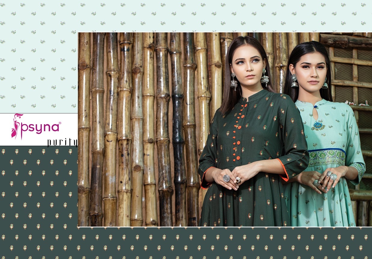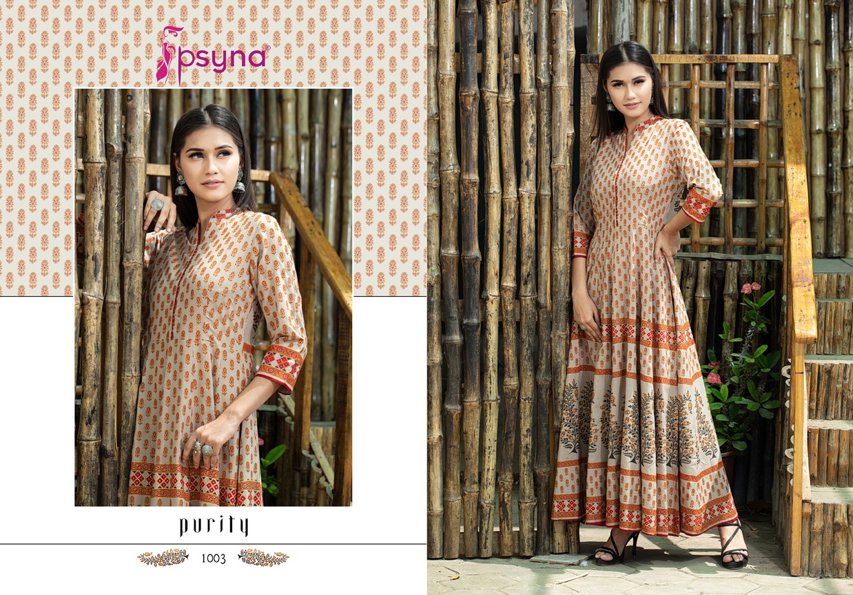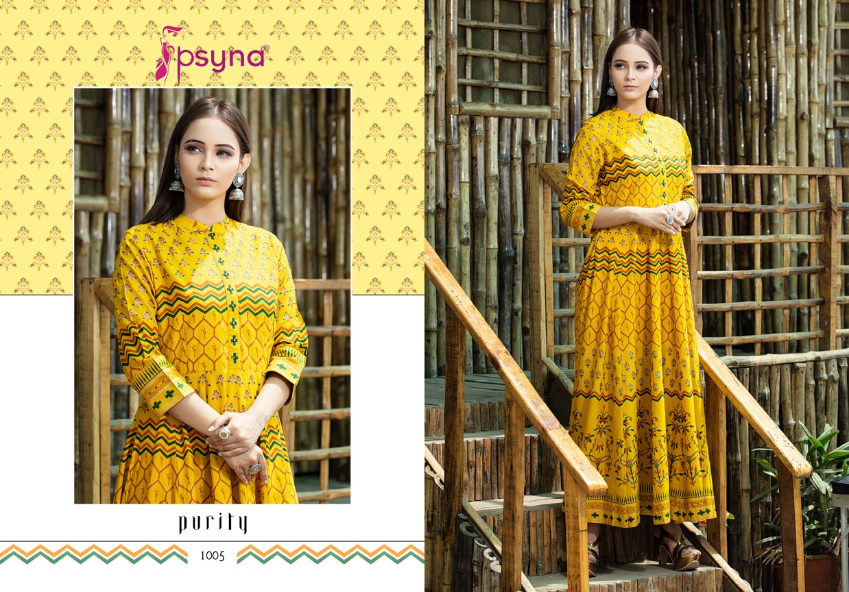 Buy Online Purity By Psyna Tex Reyon Desinger Long Kurtis Wholesale Supplier And Dealer Surat 5 Pcs of Full Catalogue at Wholesale Price. Looking for Purity By Psyna Tex Reyon Desinger Long Kurtis Wholesale Supplier And Dealer Surat Full Catalouge at Best Price? Buy Now Purity By Psyna Tex Reyon Desinger Long Kurtis Wholesale Supplier And Dealer Surat at Wholesale Rate of Rs 4995 with Total 5 Pcs from authroized dealer and supplier of PSYNA Brand. Cost of Each piece is just only Rs 999 which is very low and affordable price to resale the product in your retail store ,This is Surat based Wholesale Supplier & Dealer of PSYNA Brand. Click on Brand name to Know more about PSYNA Brand's products.Call or Whatsapp on 9898838984 for booking or enquiry