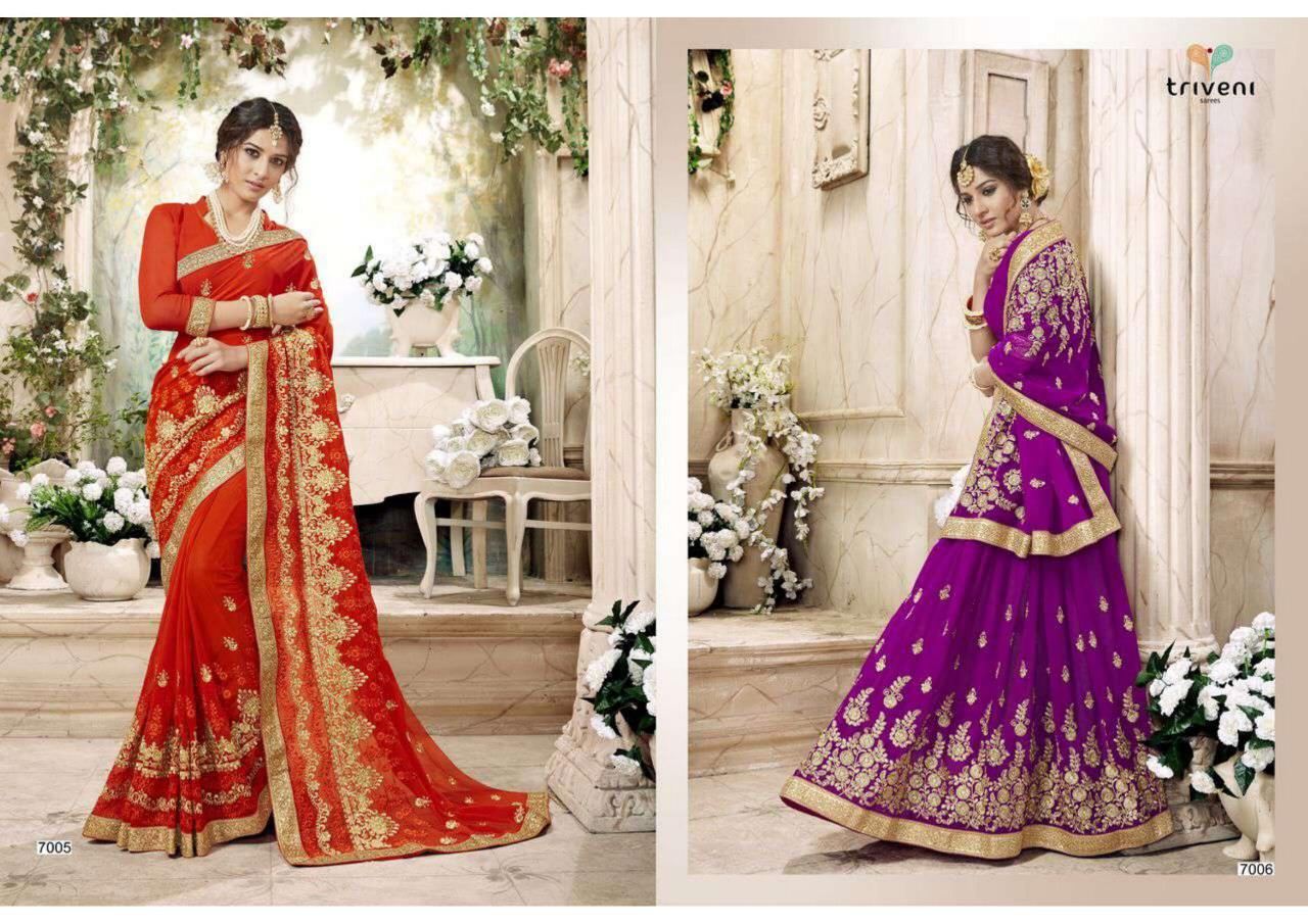 Buy Online Purvaayi By Triveni 7001 Series Fancy Designer Party Wear Saree Collection Wholesale Dealer And Supplier Surat 8 Pcs of Full Catalogue at Wholesale Price. Looking for Purvaayi By Triveni 7001 Series Fancy Designer Party Wear Saree Collection Wholesale Dealer And Supplier Surat Full Catalouge at Best Price? Buy Now Purvaayi By Triveni 7001 Series Fancy Designer Party Wear Saree Collection Wholesale Dealer And Supplier Surat at Wholesale Rate of Rs 10800 with Total 8 Pcs from authroized dealer and supplier of TRIVENI Brand. Cost of Each piece is just only Rs 1350 which is very low and affordable price to resale the product in your retail store ,This is Surat based Wholesale Supplier & Dealer of TRIVENI Brand. Click on Brand name to Know more about TRIVENI Brand's products.Call or Whatsapp on 9898838984 for booking or enquiry