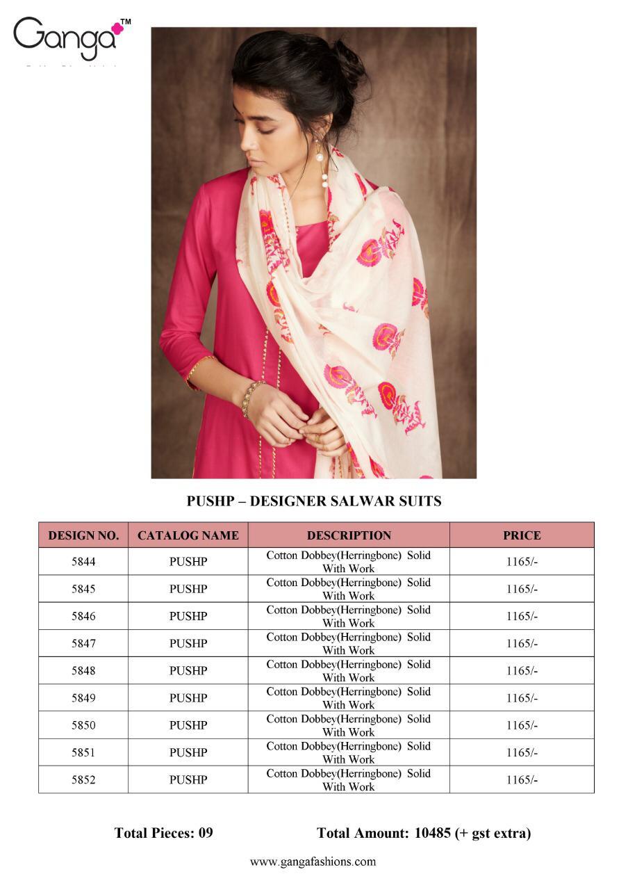 Buy Online Pushp By Ganga Cotton Designer Party Wear Suits Wholesale Supplier Surat 9 Pcs of Full Catalogue at Wholesale Price. Looking for Pushp By Ganga Cotton Designer Party Wear Suits Wholesale Supplier Surat Full Catalouge at Best Price? Buy Now Pushp By Ganga Cotton Designer Party Wear Suits Wholesale Supplier Surat at Wholesale Rate of Rs 10485 with Total 9 Pcs from authroized dealer and supplier of GANGA Brand. Cost of Each piece is just only Rs 1165 which is very low and affordable price to resale the product in your retail store ,This is Surat based Wholesale Supplier & Dealer of GANGA Brand. Click on Brand name to Know more about GANGA Brand's products.Call or Whatsapp on 9898838984 for booking or enquiry