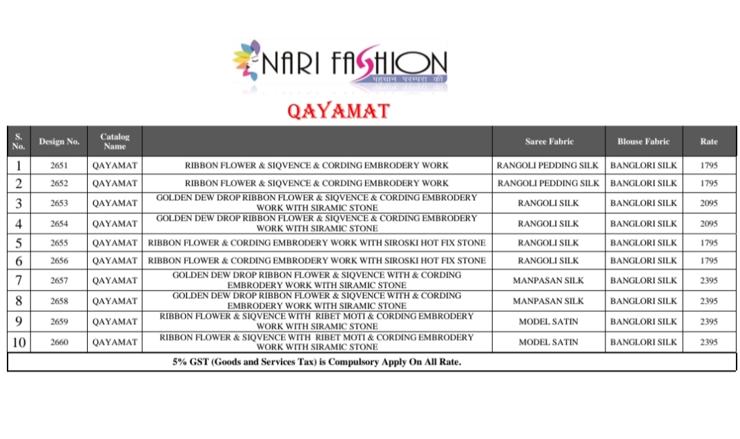 Buy Online Qayamat By Nari Fashion Wholesale Supplier Traders In Surat 10 Pcs of Full Catalogue at Wholesale Price. Looking for Qayamat By Nari Fashion Wholesale Supplier Traders In Surat Full Catalouge at Best Price? Buy Now Qayamat By Nari Fashion Wholesale Supplier Traders In Surat at Wholesale Rate of Rs 0 with Total 10 Pcs from authroized dealer and supplier of Nari Fashion Brand. Cost of Each piece is just only Rs 0 which is very low and affordable price to resale the product in your retail store ,This is Surat based Wholesale Supplier & Dealer of Nari Fashion Brand. Click on Brand name to Know more about Nari Fashion Brand's products.Call or Whatsapp on 9898838984 for booking or enquiry