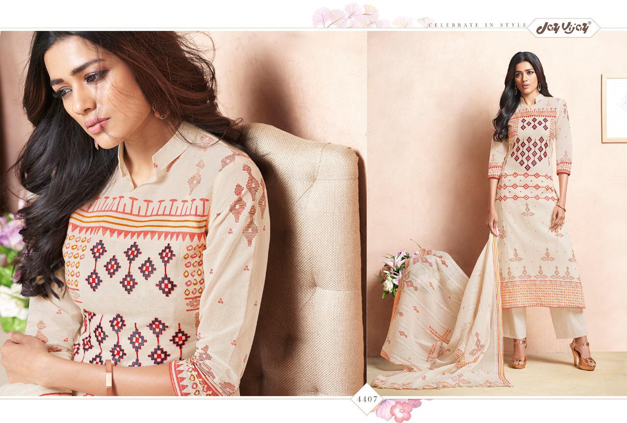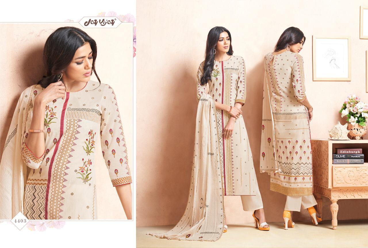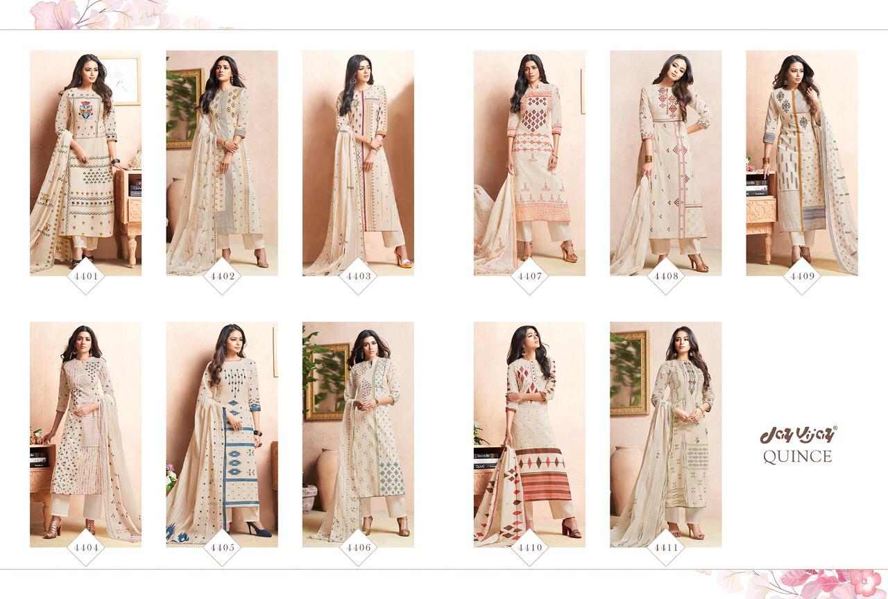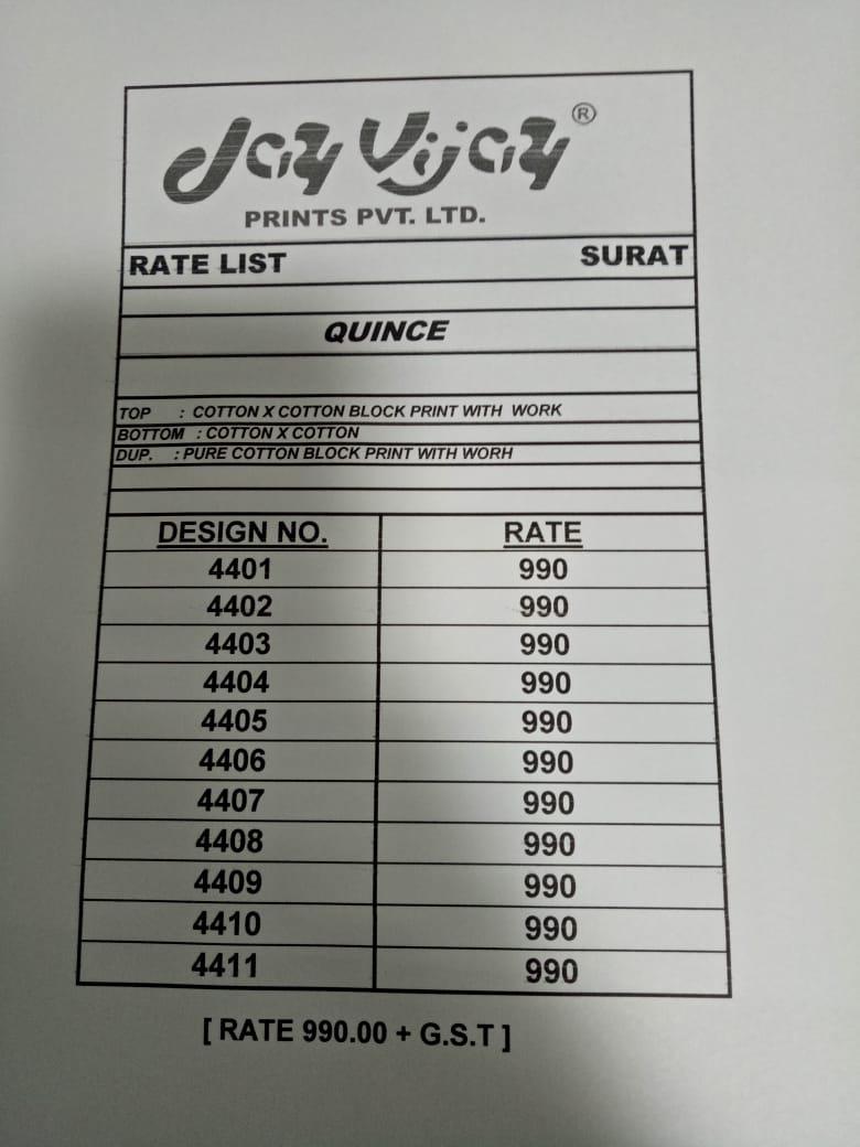 Buy Online Quince By Jay Vijay 4401 Series Fancy Cotton Ptinted Salwar Kameez Catlog Wholesaler Surat 11 Pcs of Full Catalogue at Wholesale Price. Looking for Quince By Jay Vijay 4401 Series Fancy Cotton Ptinted Salwar Kameez Catlog Wholesaler Surat Full Catalouge at Best Price? Buy Now Quince By Jay Vijay 4401 Series Fancy Cotton Ptinted Salwar Kameez Catlog Wholesaler Surat at Wholesale Rate of Rs 10890 with Total 11 Pcs from authroized dealer and supplier of JAY VIJAY Brand. Cost of Each piece is just only Rs 990 which is very low and affordable price to resale the product in your retail store ,This is Surat based Wholesale Supplier & Dealer of JAY VIJAY Brand. Click on Brand name to Know more about JAY VIJAY Brand's products.Call or Whatsapp on 9898838984 for booking or enquiry