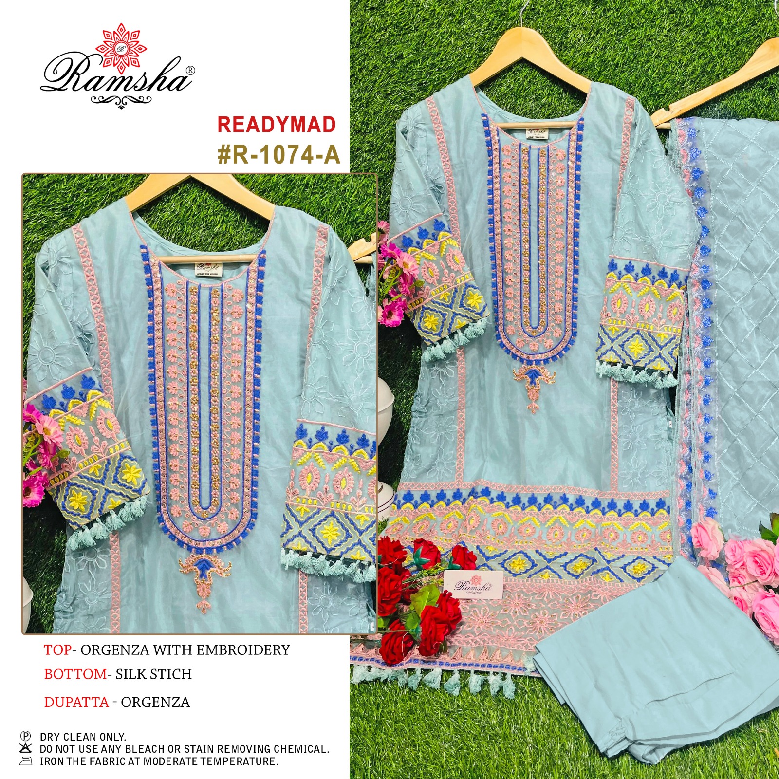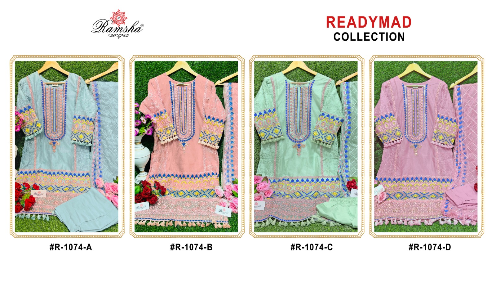 Buy Online R 1074 By Ramsha Fashion Pakistani Suit 8 Pcs of Full Catalogue at Wholesale Price. Looking for R 1074 By Ramsha Fashion Pakistani Suit Full Catalouge at Best Price? Buy Now R 1074 By Ramsha Fashion Pakistani Suit at Wholesale Rate of Rs 10800 with Total 8 Pcs from authroized dealer and supplier of Brand. Cost of Each piece is just only Rs 1350 which is very low and affordable price to resale the product in your retail store ,This is Surat based Wholesale Supplier & Dealer of Brand. Click on Brand name to Know more about Brand's products.Call or Whatsapp on 9898838984 for booking or enquiry