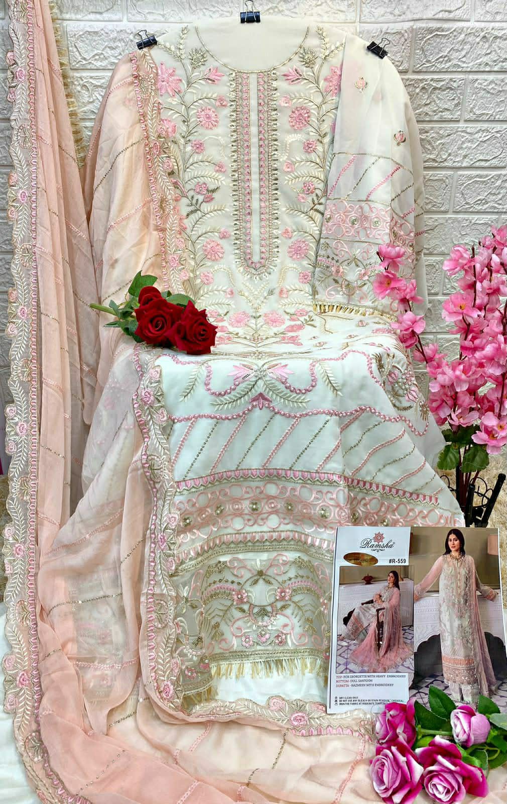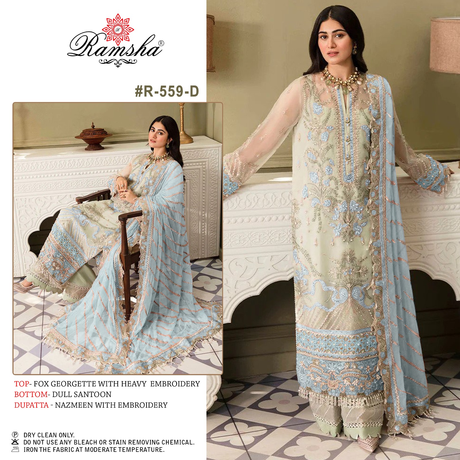 Buy Online R 559nx By Ramsha Georgette Pakistani Suits 4 Pcs of Full Catalogue at Wholesale Price. Looking for R 559nx By Ramsha Georgette Pakistani Suits Full Catalouge at Best Price? Buy Now R 559nx By Ramsha Georgette Pakistani Suits at Wholesale Rate of Rs 5000 with Total 4 Pcs from authroized dealer and supplier of Brand. Cost of Each piece is just only Rs 1250 which is very low and affordable price to resale the product in your retail store ,This is Surat based Wholesale Supplier & Dealer of Brand. Click on Brand name to Know more about Brand's products.Call or Whatsapp on 9898838984 for booking or enquiry