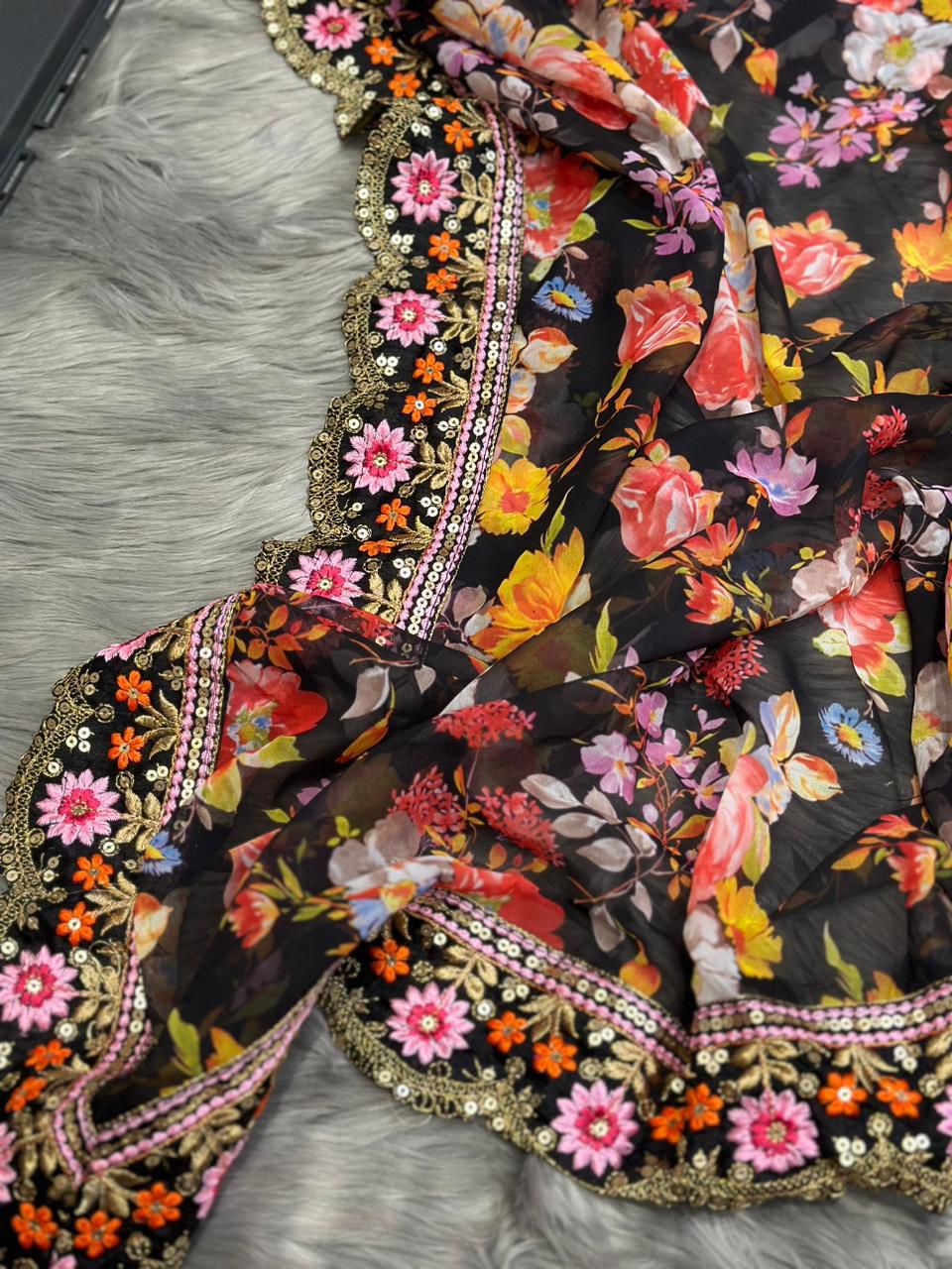 New Catalog Catalog Name : RAABTA No of Pcs : 1 Fabric : Superb Soft Refined Georgett Silk Saree with floral digital print in saree with sequencing border with work blouse In our saree all embroidery work done by viscos thread only Rate : 1225/- (EXTRA 5% GST) SINGLE AVAILABLE 100+ SINGLE |